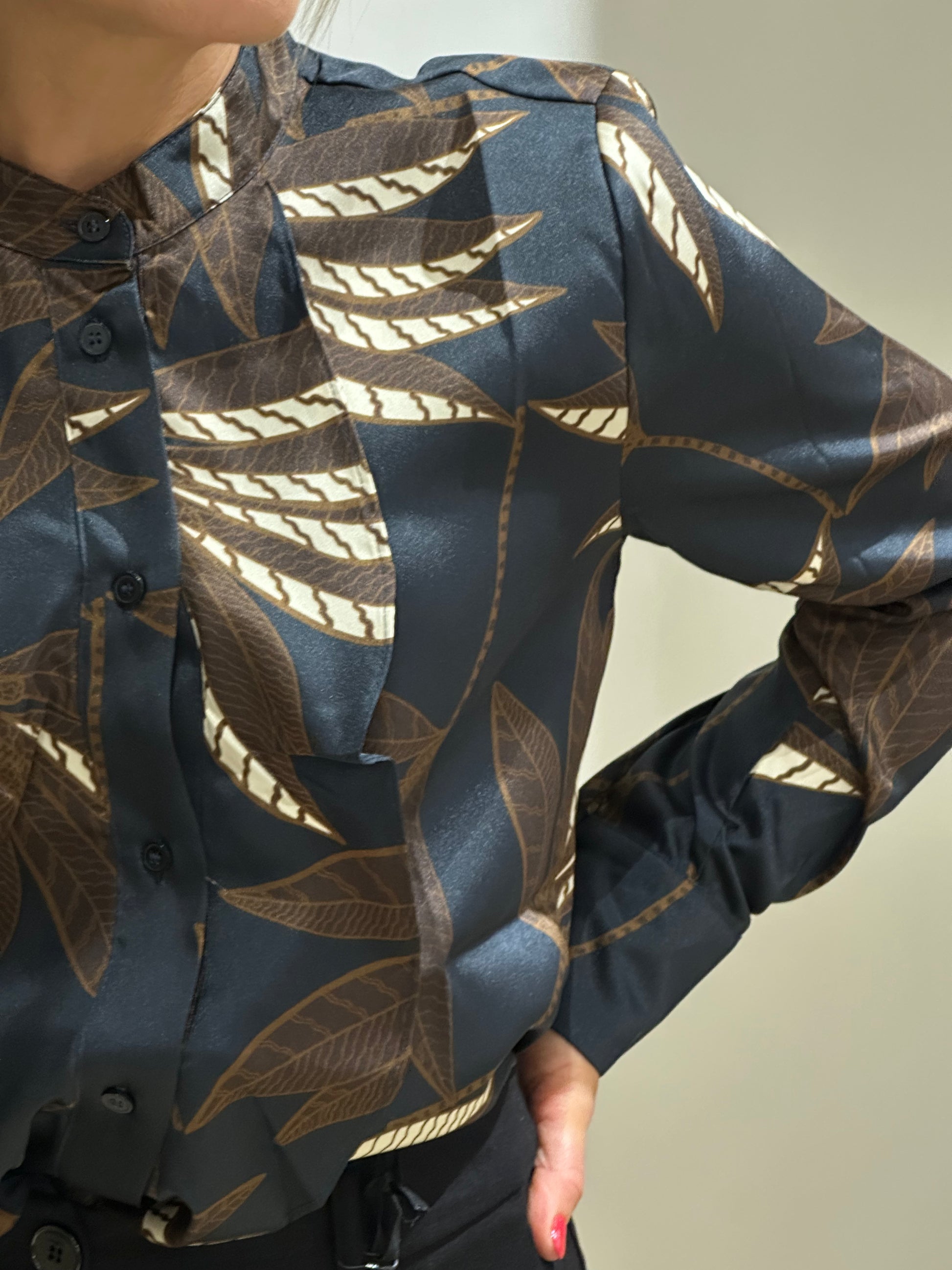 Camicia "Neon" in tessuto tecnico stampato carta da zucchero con motivo foliage. Modello dal fit dritto con collo alla coreana e abbottonatura a vista. Dettagli di piccoli volant sul davanti e maniche lunghe con polso a bottone e leggero sbuffo. Realizzata con tessuto contenente oltre il 50% di poliestere riciclato.