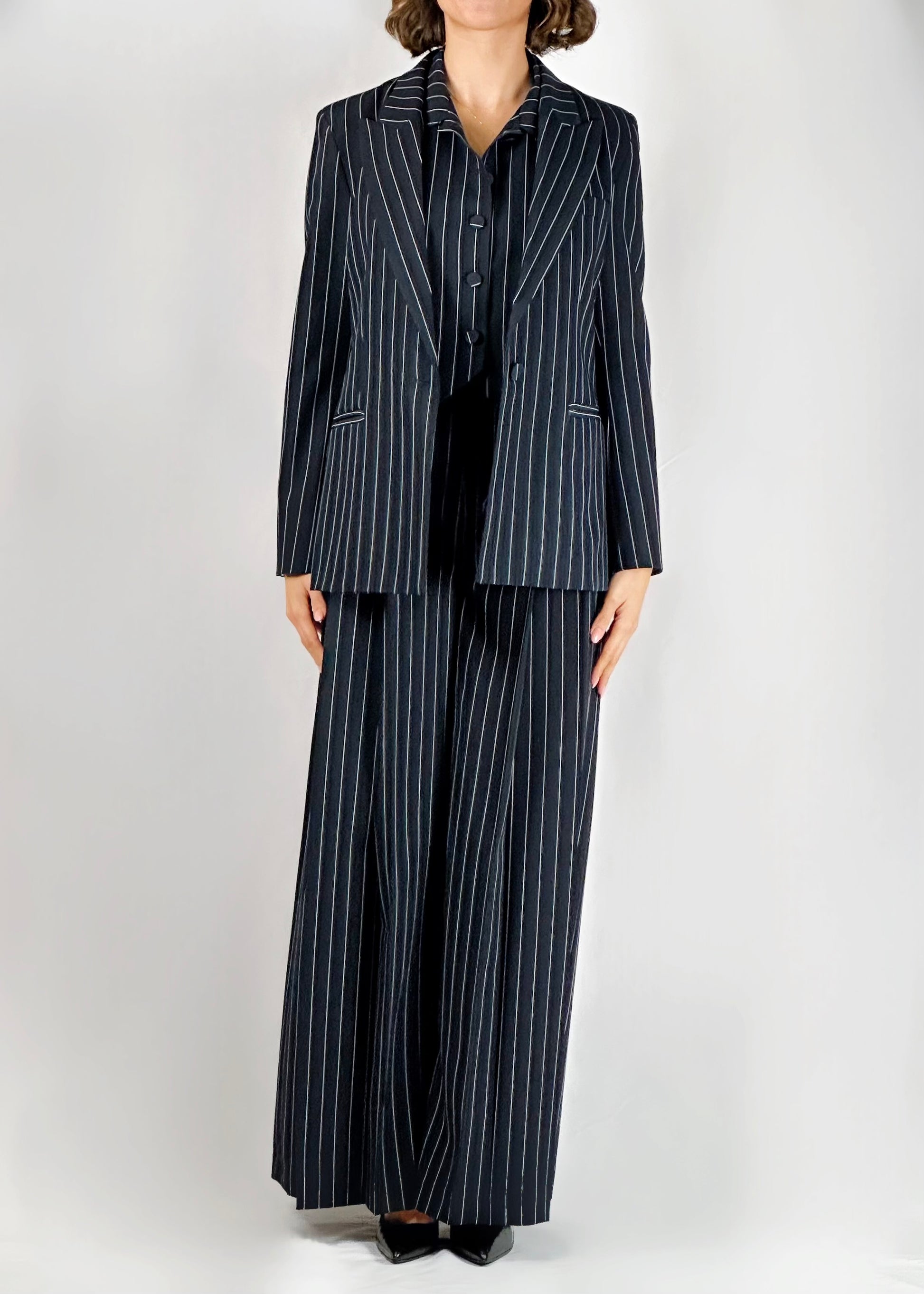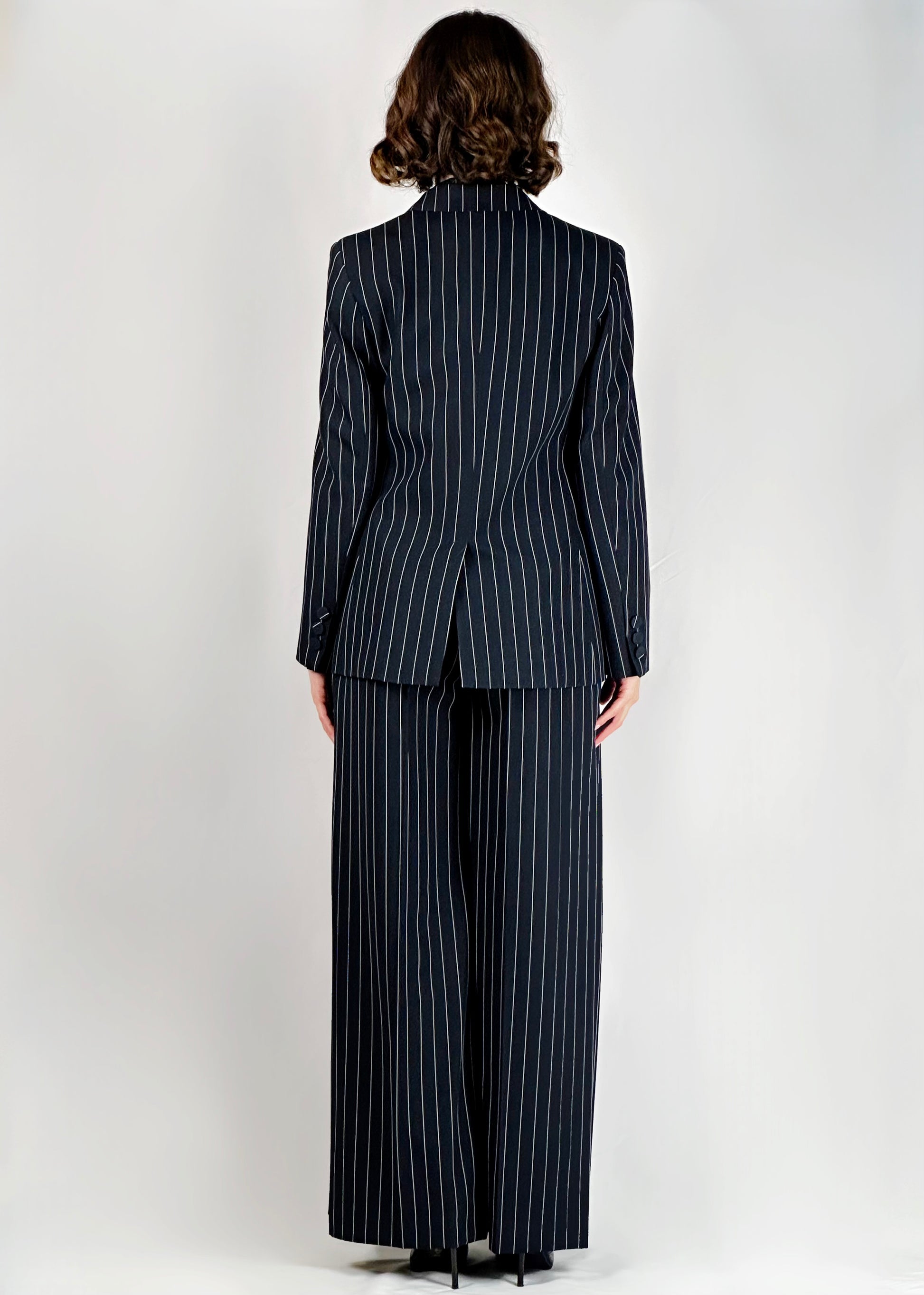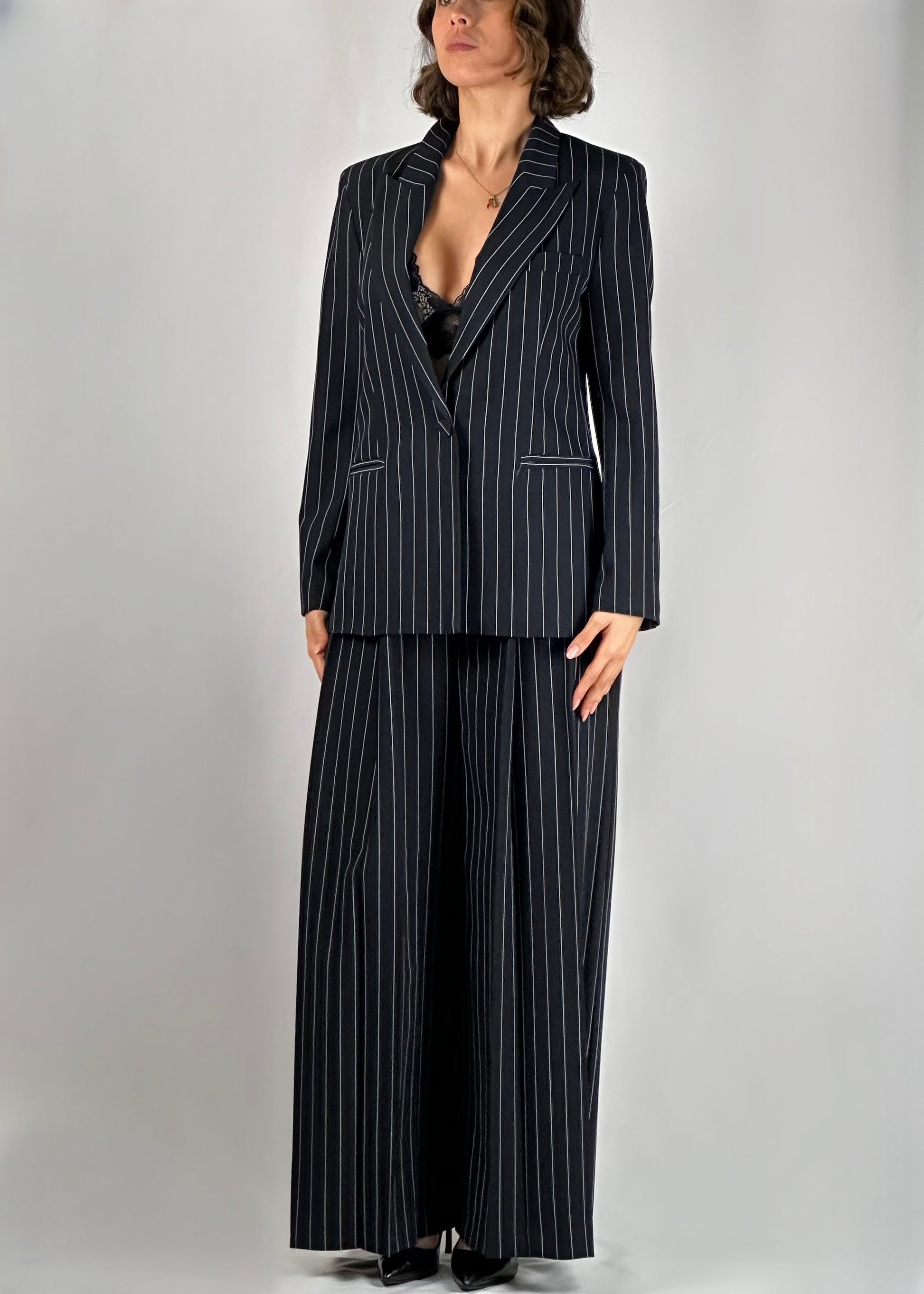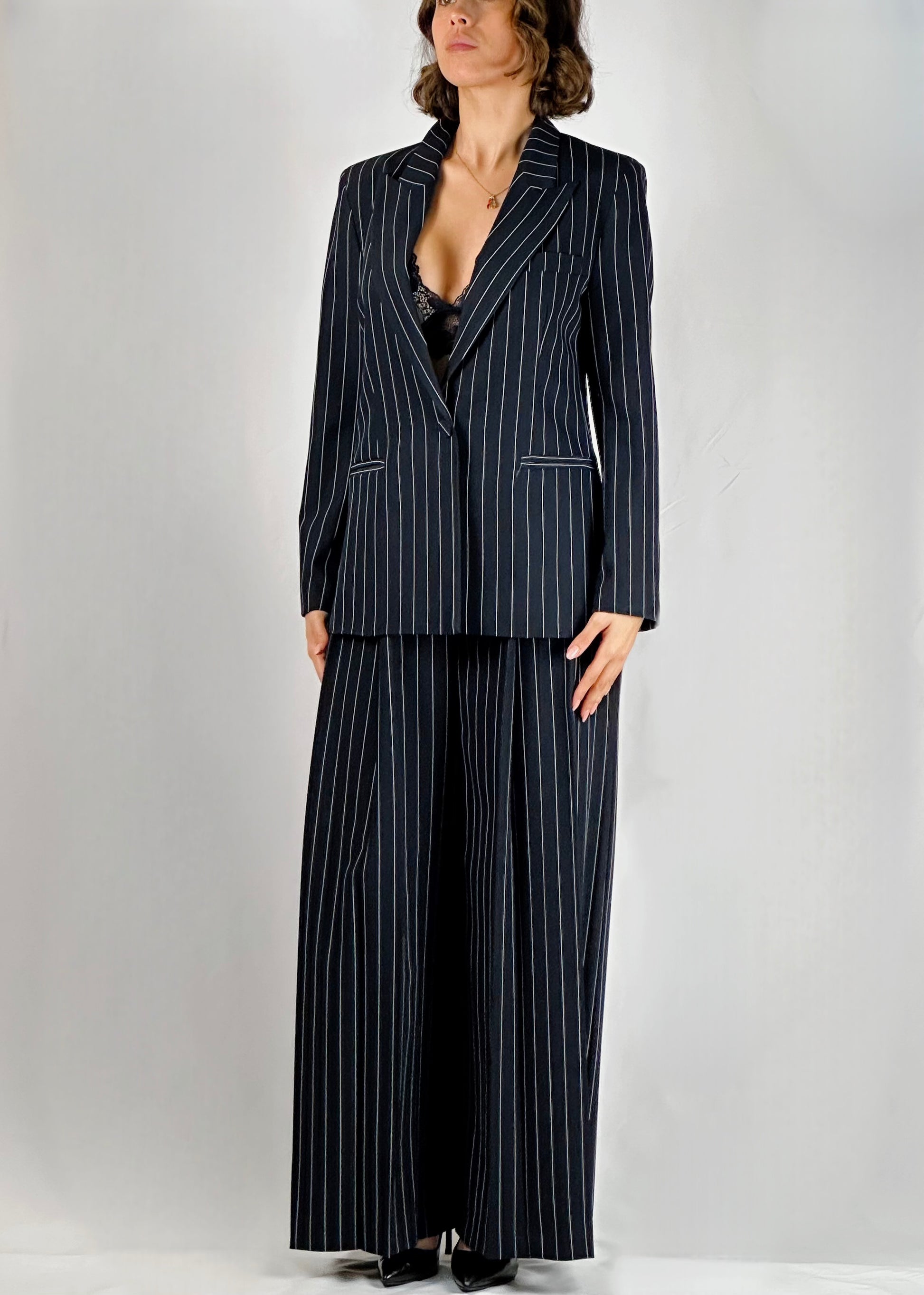 La giacca è un capo elegante e sofisticato, caratterizzato da un design a righe sottili bianche su base blu scuro. Il taglio è classico e ben definito, con spalle leggermente strutturate che donano una silhouette forte e raffinata.