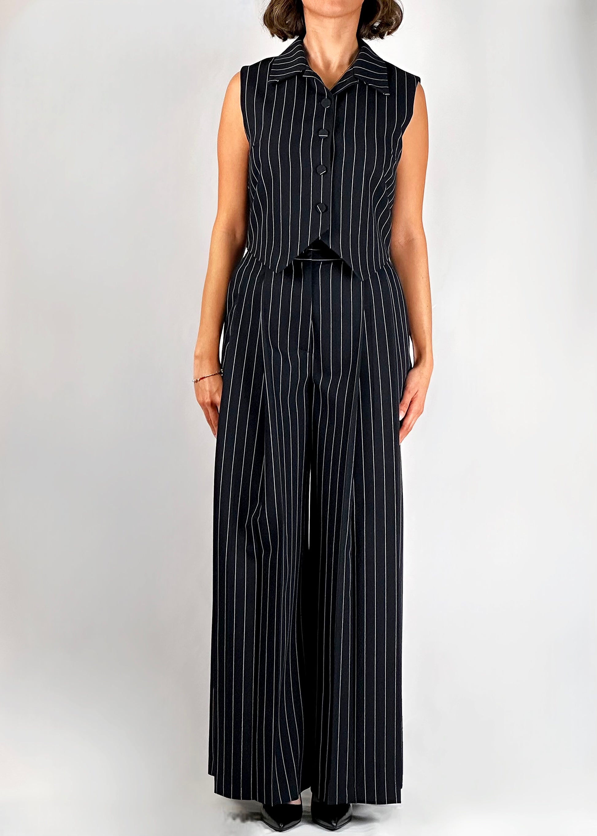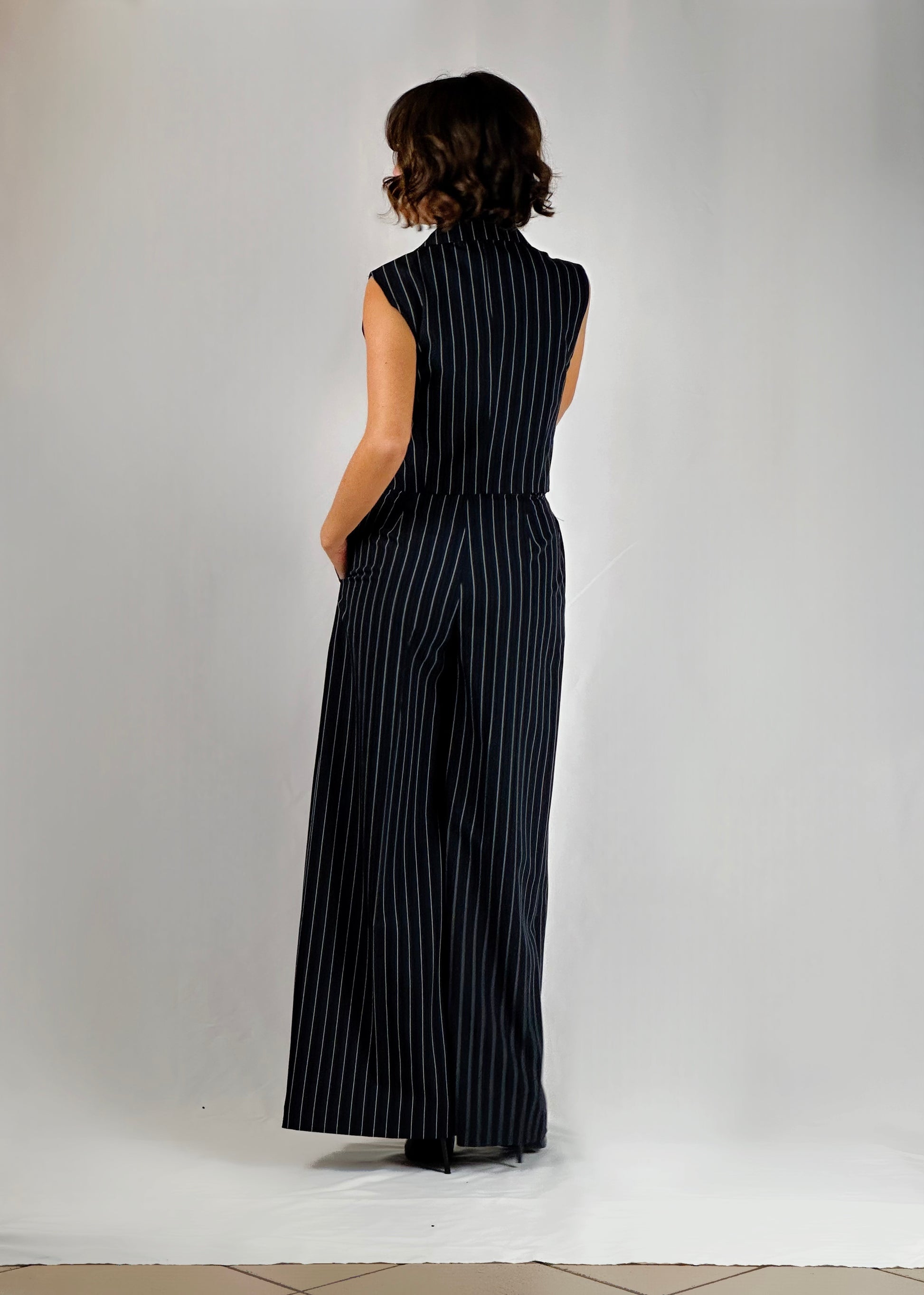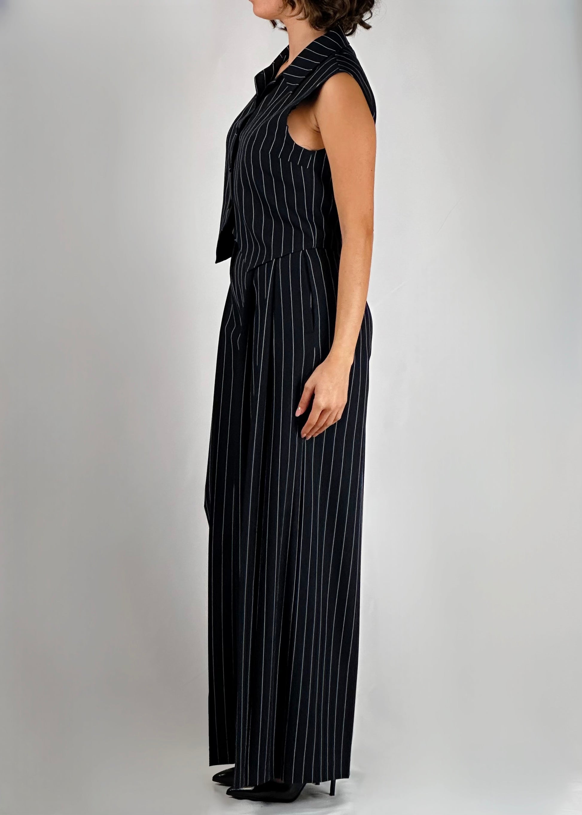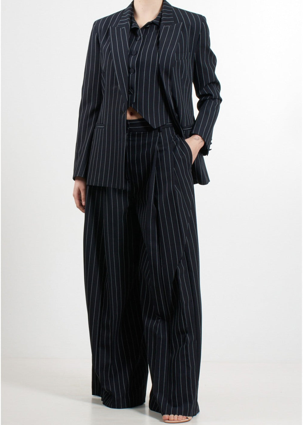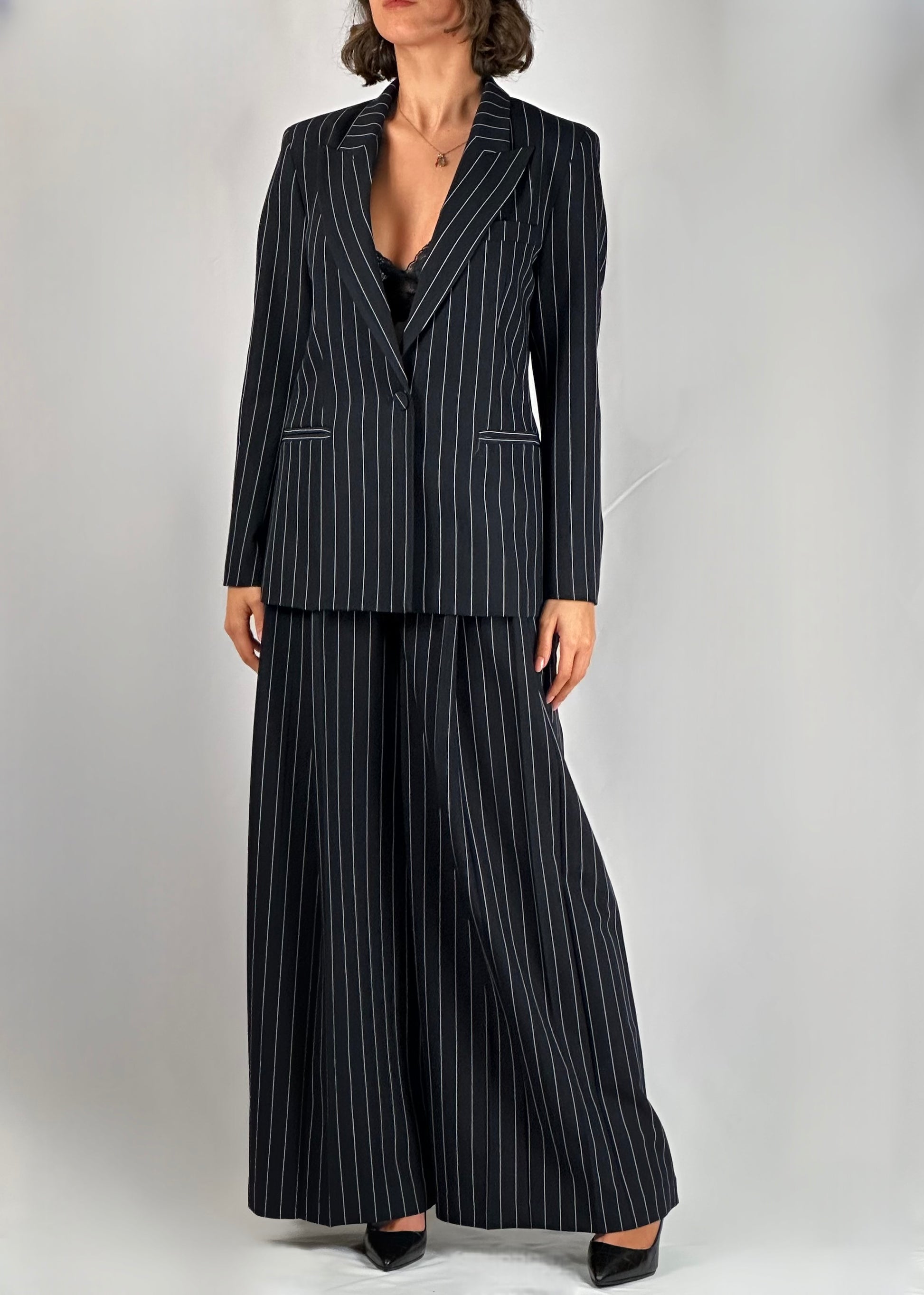 La giacca è un capo elegante e sofisticato, caratterizzato da un design a righe sottili bianche su base blu scuro. Il taglio è classico e ben definito, con spalle leggermente strutturate che donano una silhouette forte e raffinata.