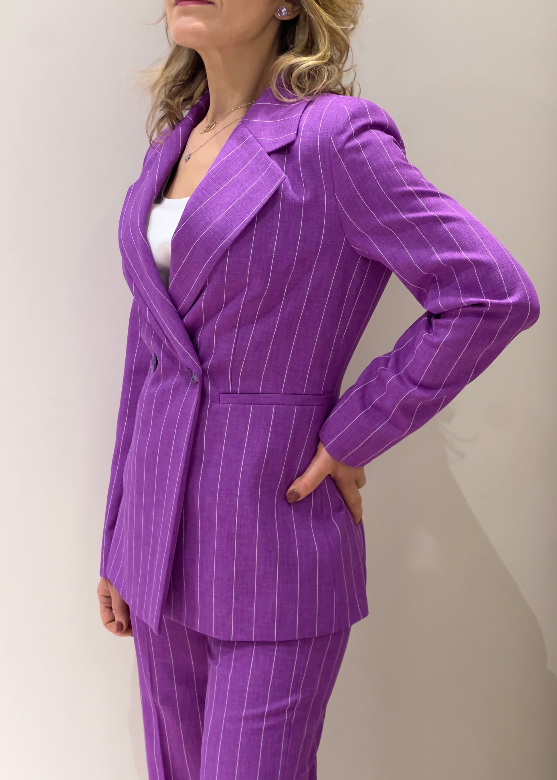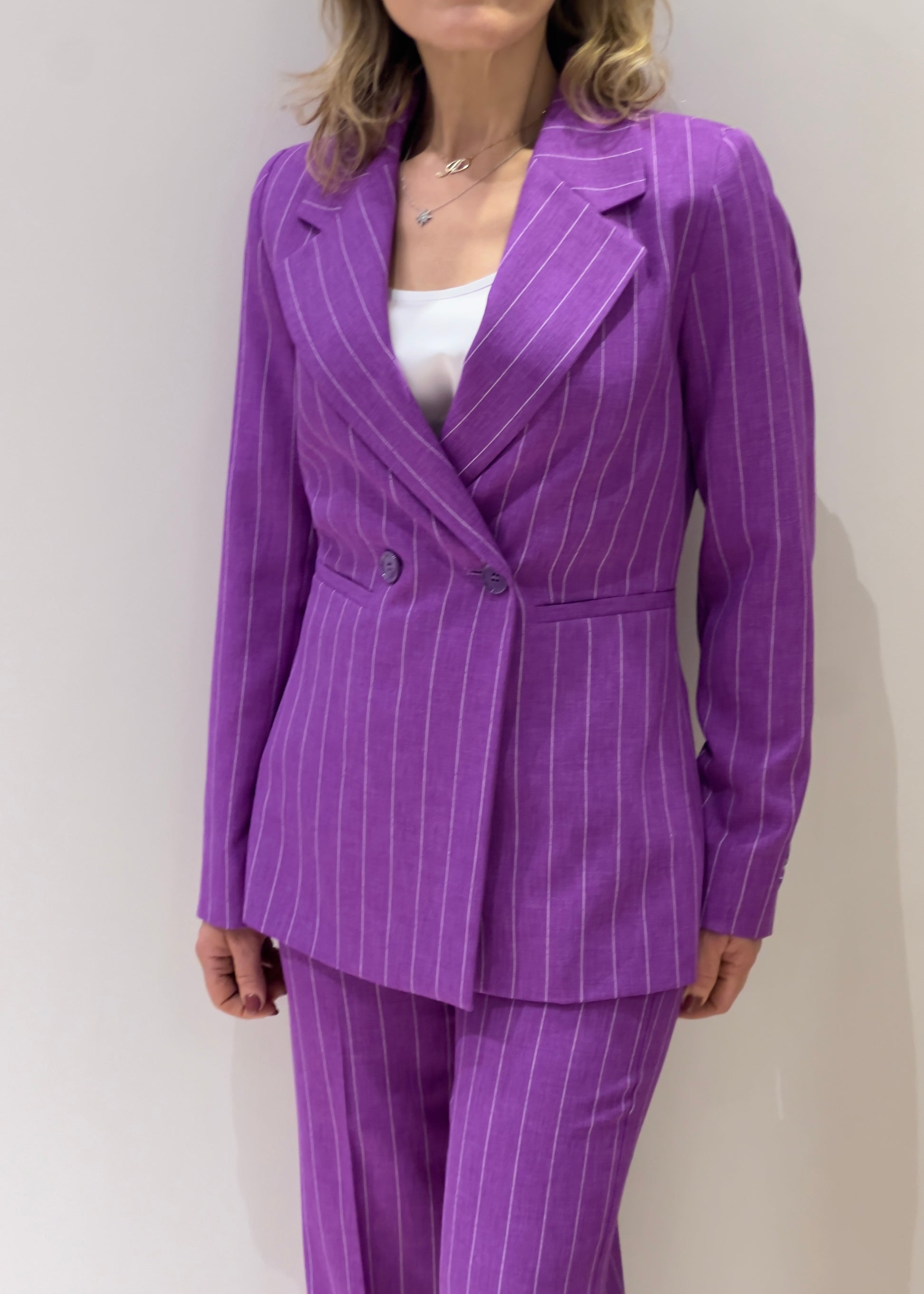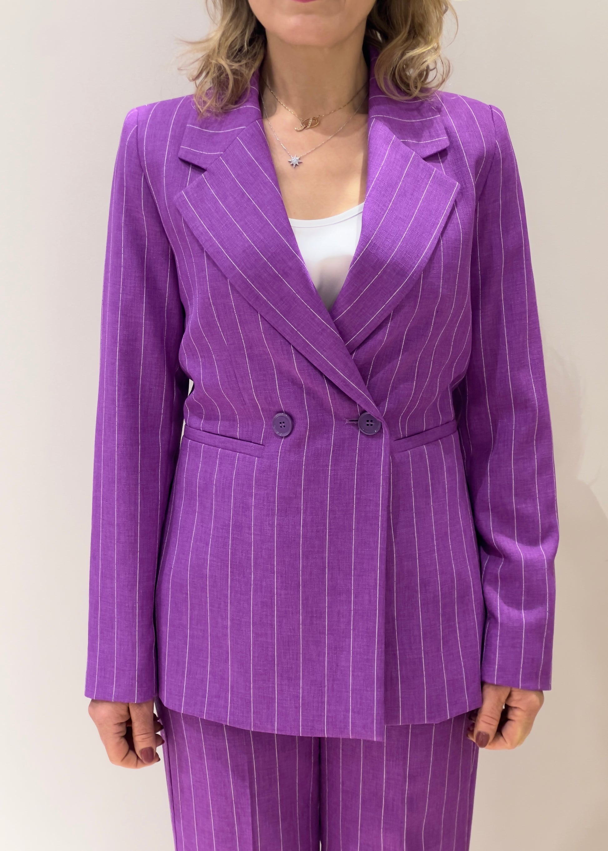 Esprimi il tuo stile più deciso con questa giacca dalla fantasia gessata. Il rigore delle linee si riflette in una costruzione doppiopetto con bottoni, perfetta per l'ufficio.
