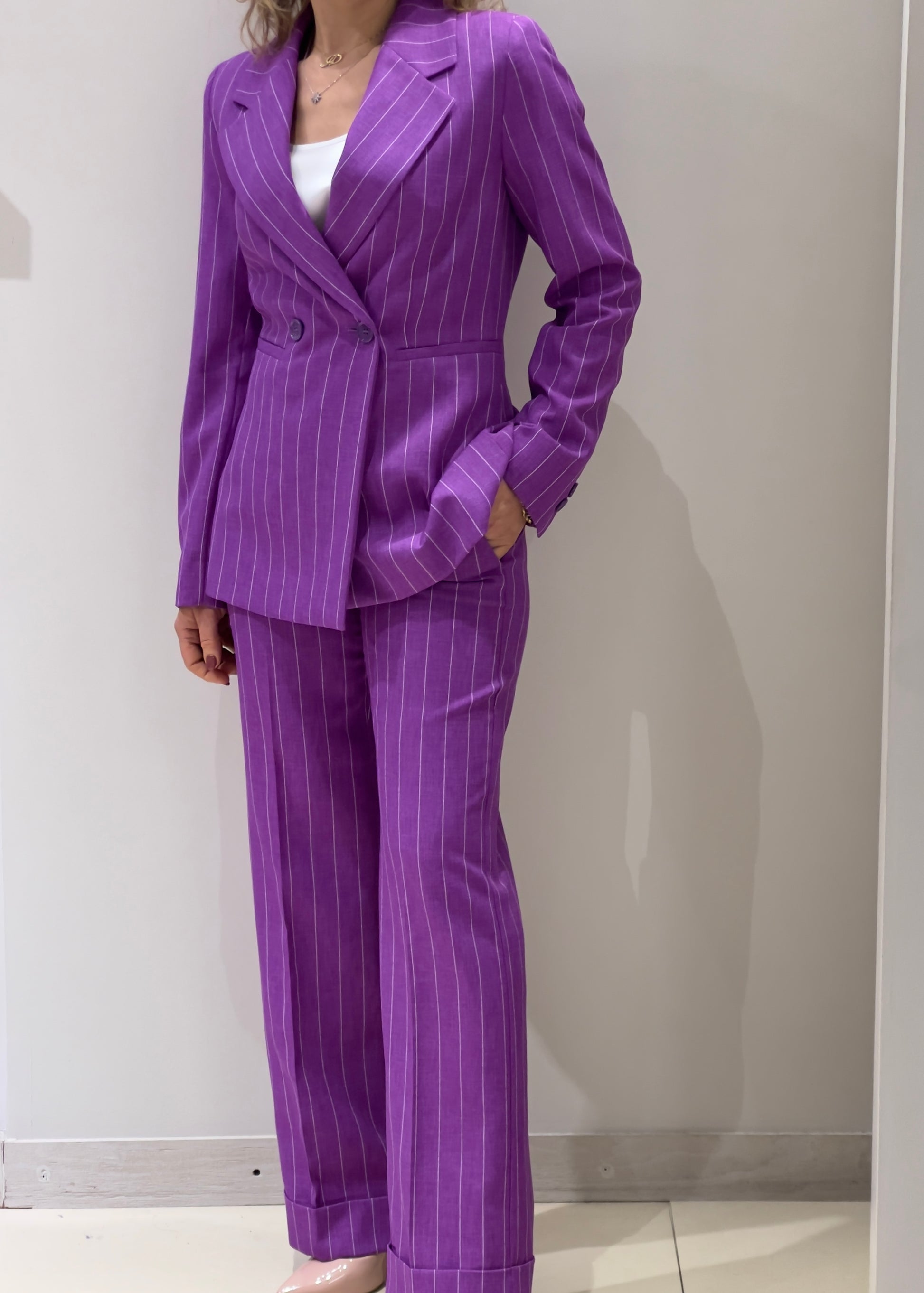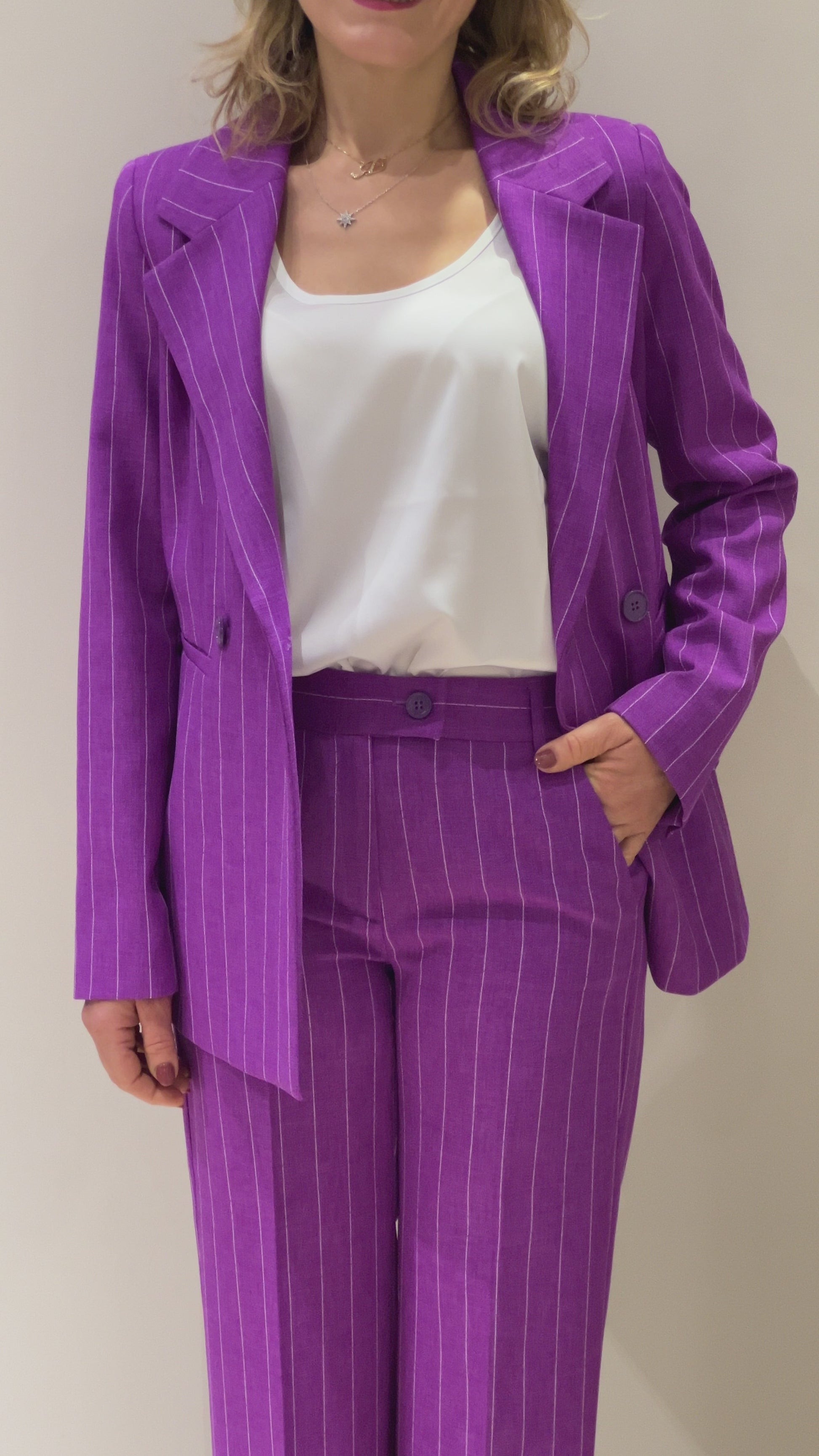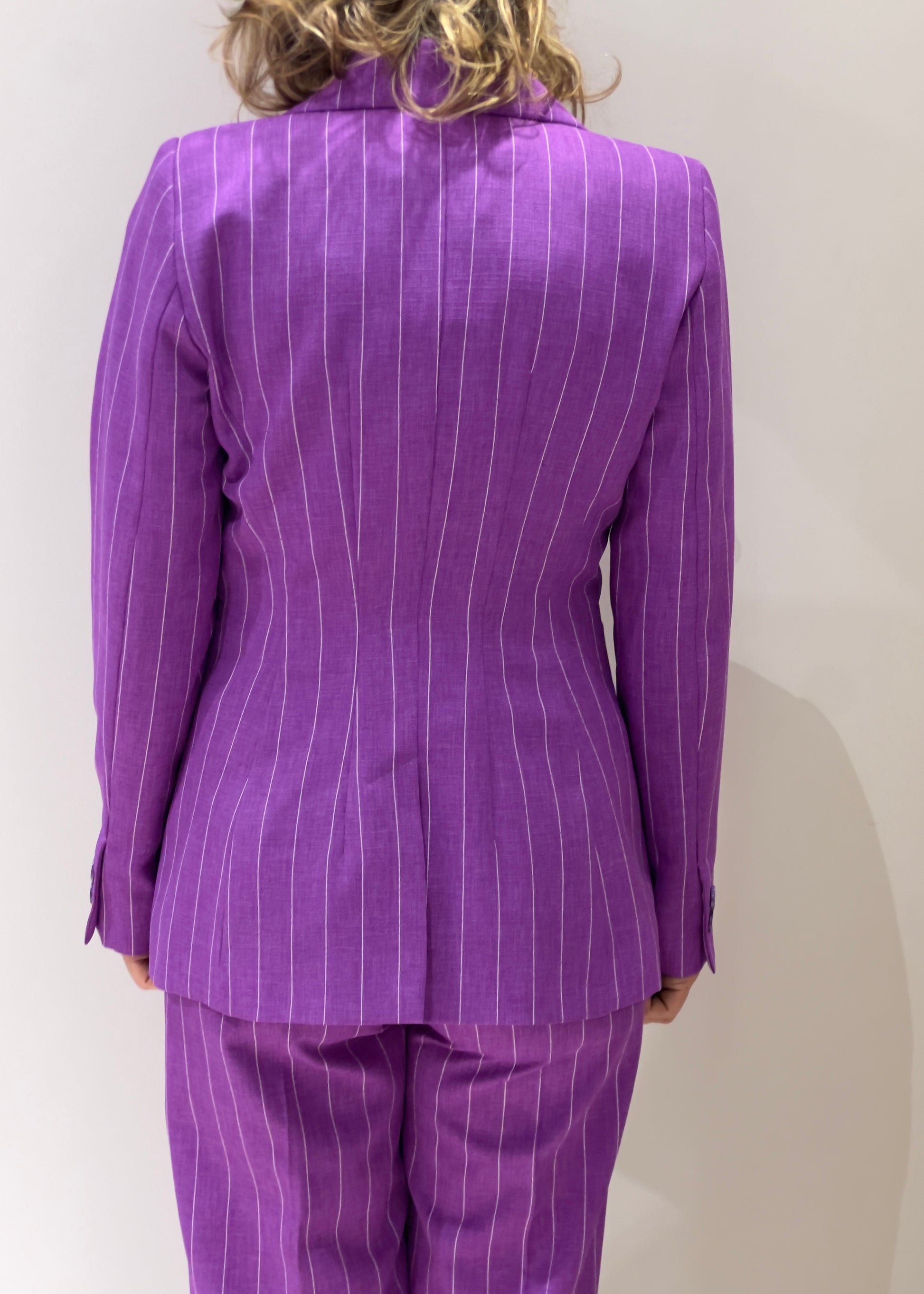 Esprimi il tuo stile più deciso con questa giacca dalla fantasia gessata. Il rigore delle linee si riflette in una costruzione doppiopetto con bottoni, perfetta per l'ufficio.