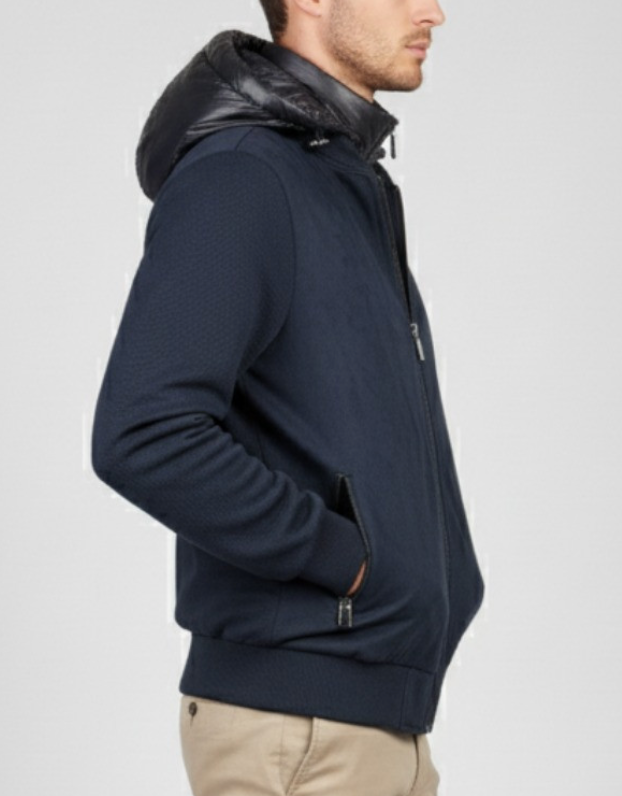 Giubbino combinato in suede e maniche in maglia, rifiniture con balza. Chiusura anteriore e tasche con zip. Cappuccio regolabile.