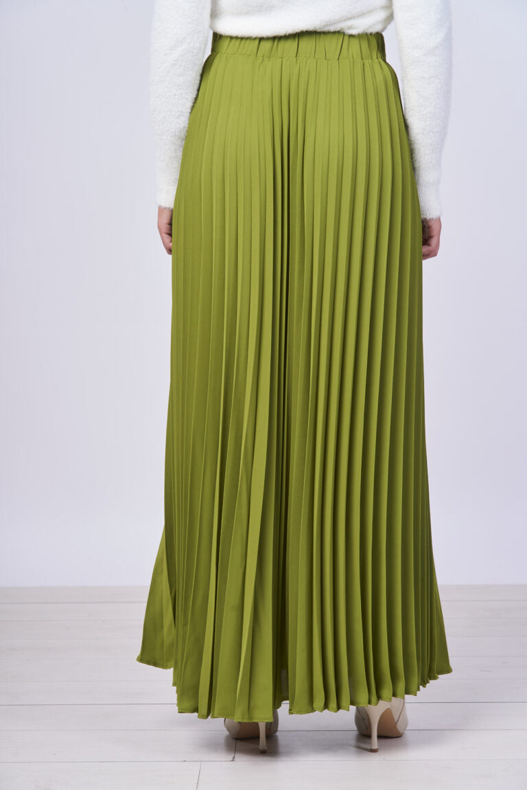 Questa gonna lunga a pieghe è l’alleato perfetto per creare un look sofisticato e di grande impatto. Visualizza il tuo cliente ideale e descrivi questo capo come una vera e propria tela su cui esprimere la propria creatività Le sue linee fluide e il vibrante colore verde aggiungono un tocco di eleganza a ogni passo, mentre il design a pieghe verticali slancia la figura. È un capo che racconta una storia di stile e audacia [1].