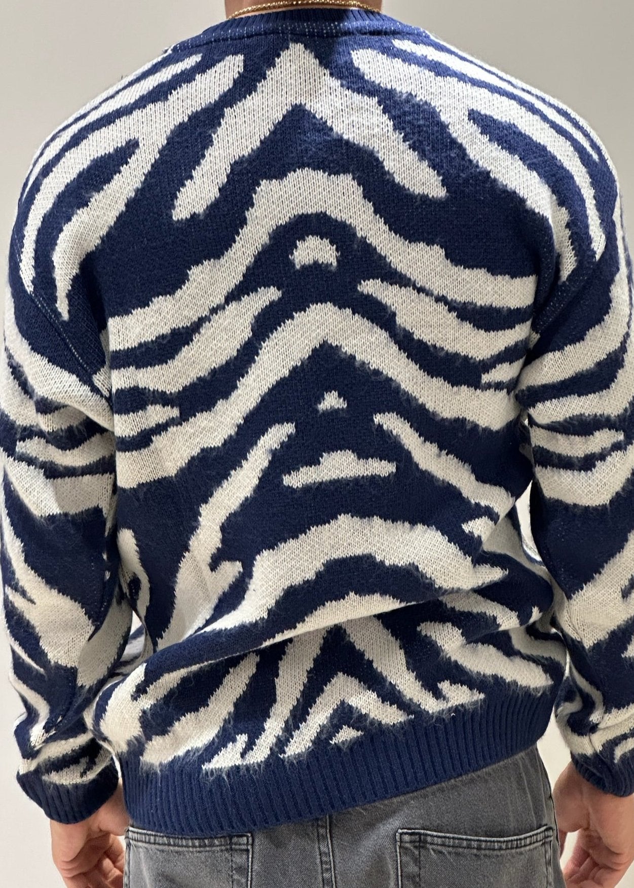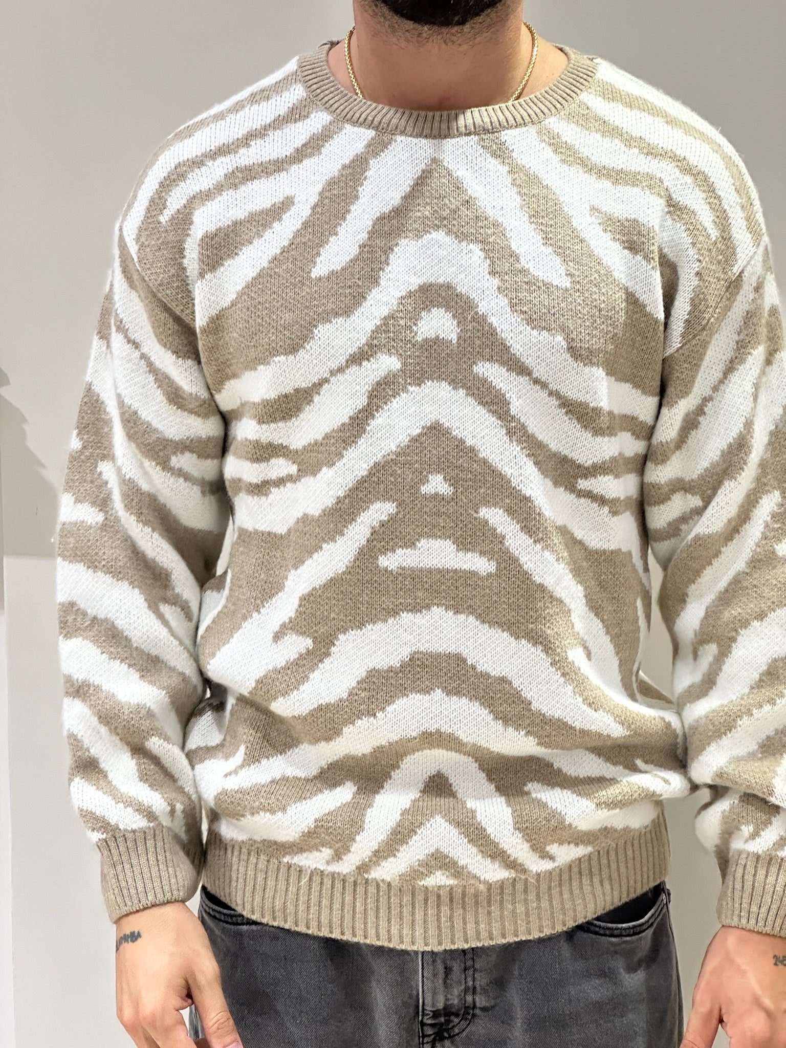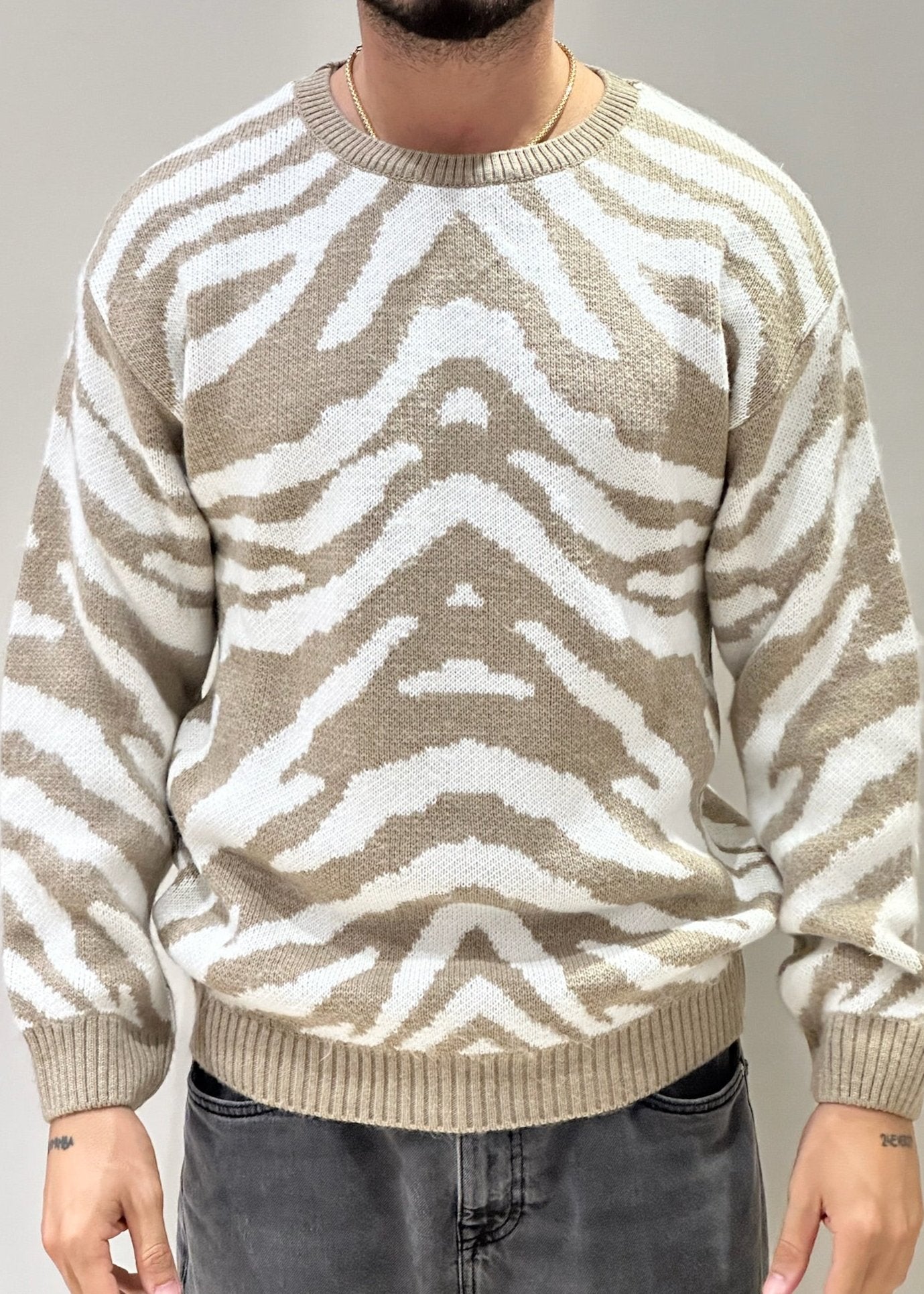 Il maglioncino over con fantasia zebrata è un capo di tendenza che unisce comfort e stile audace. La trama oversize, morbida e avvolgente, offre una vestibilità rilassata, ideale per creare outfit casual ma ricercati. La fantasia zebrata è proposta in due varianti di colore: panna e beige per un look raffinato e naturale, oppure panna e blu per un contrasto più deciso e moderno. Il design animalier, elegante e allo stesso tempo grintoso, dona carattere al tuo outfit, rendendolo perfetto da abbinare a pantaloni aderenti o gonne per un tocco di personalità in più.