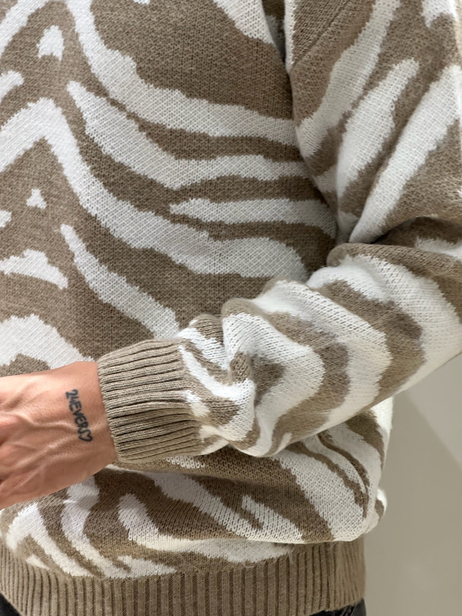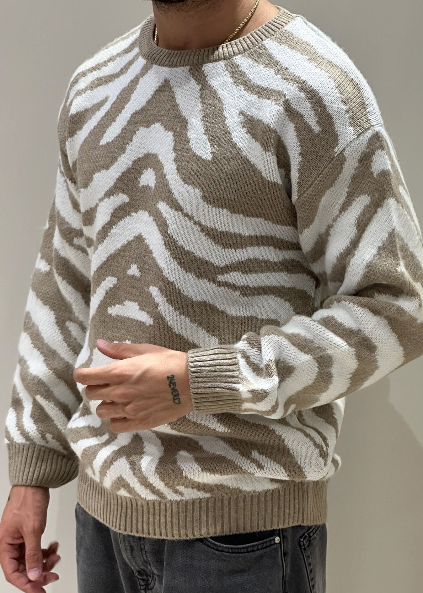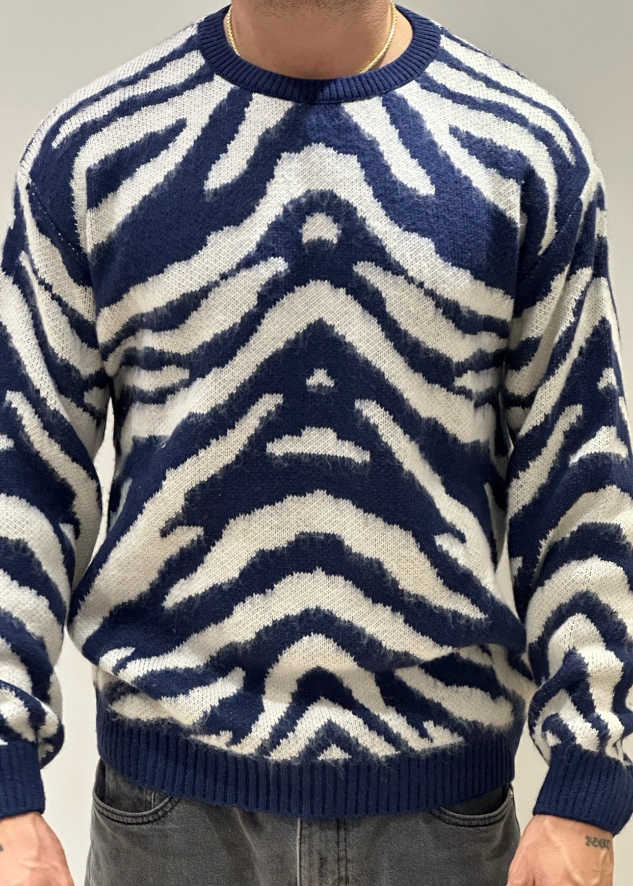 Il maglioncino over con fantasia zebrata è un capo di tendenza che unisce comfort e stile audace. La trama oversize, morbida e avvolgente, offre una vestibilità rilassata, ideale per creare outfit casual ma ricercati. La fantasia zebrata è proposta in due varianti di colore: panna e beige per un look raffinato e naturale, oppure panna e blu per un contrasto più deciso e moderno. Il design animalier, elegante e allo stesso tempo grintoso, dona carattere al tuo outfit, rendendolo perfetto da abbinare a pantaloni aderenti o gonne per un tocco di personalità in più.