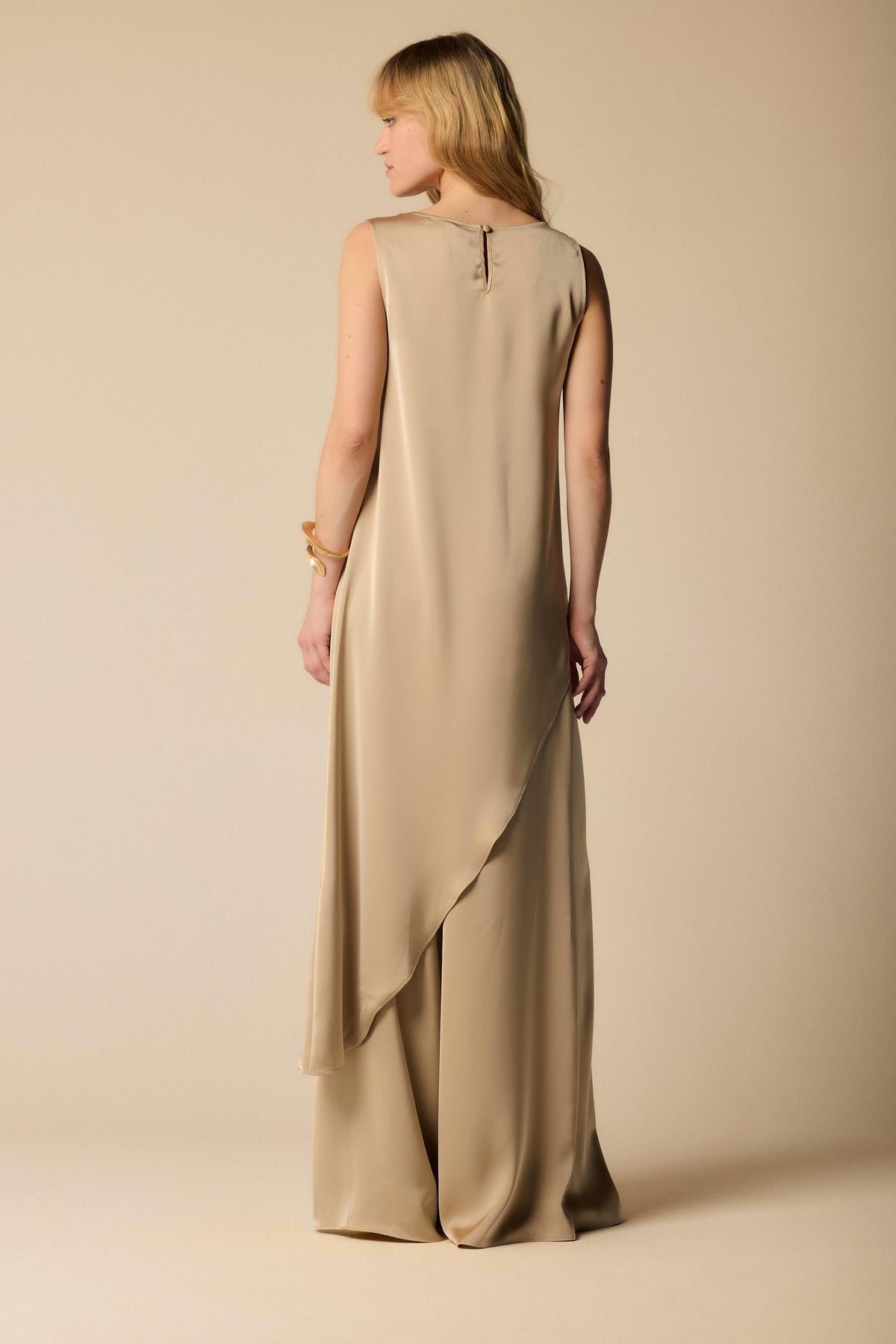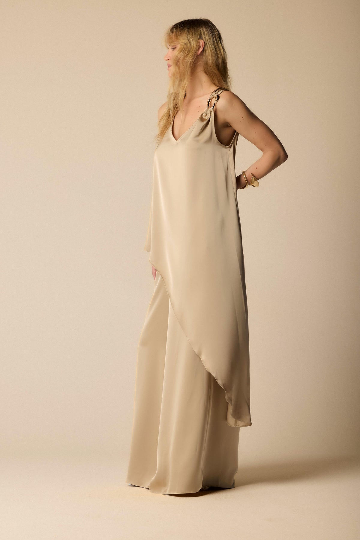 Pantalone ampio e top lungo asimmetrico con fibbia dorata su una spallina e chiusura con bottone sul retro, scollo a V.