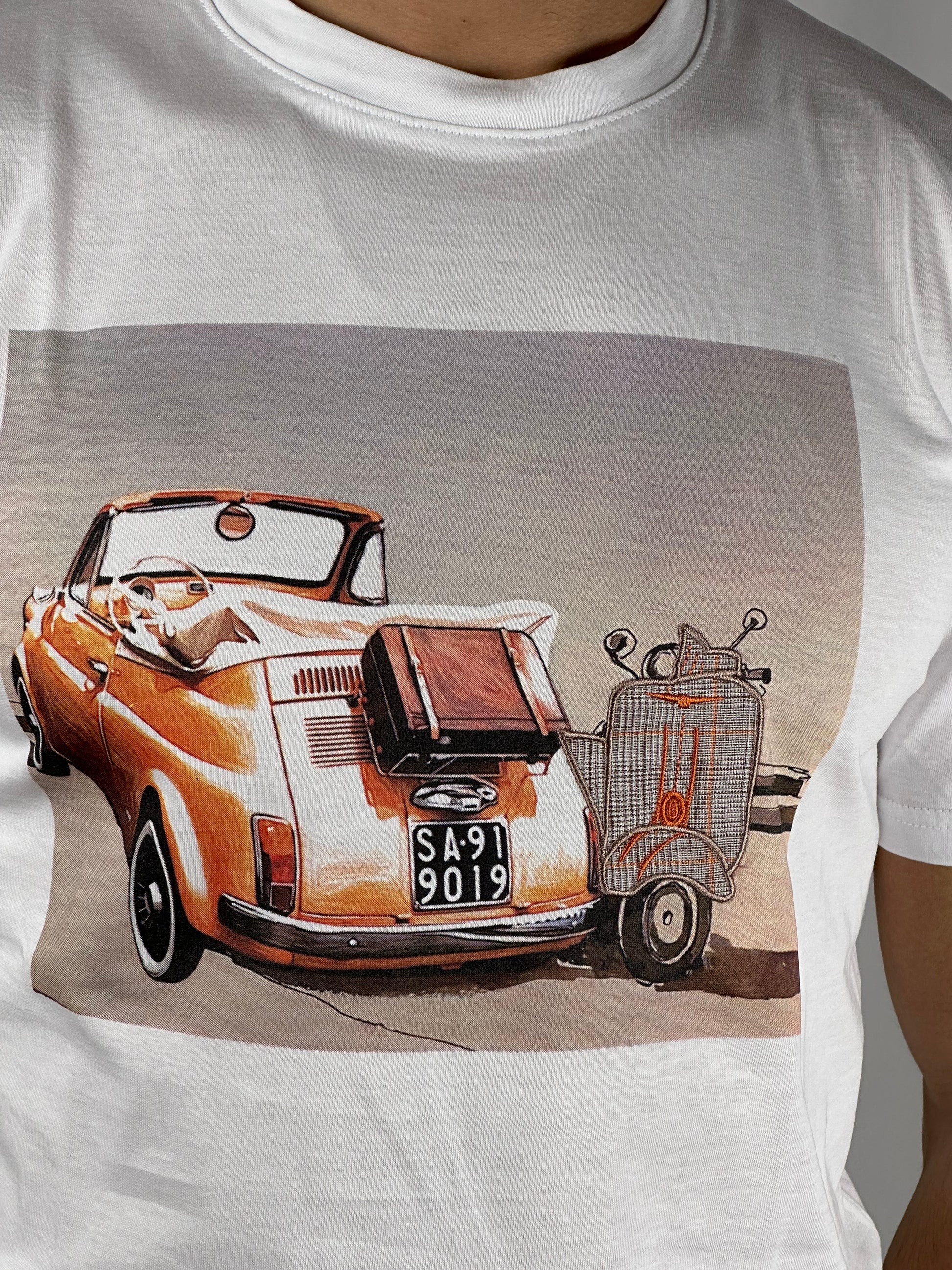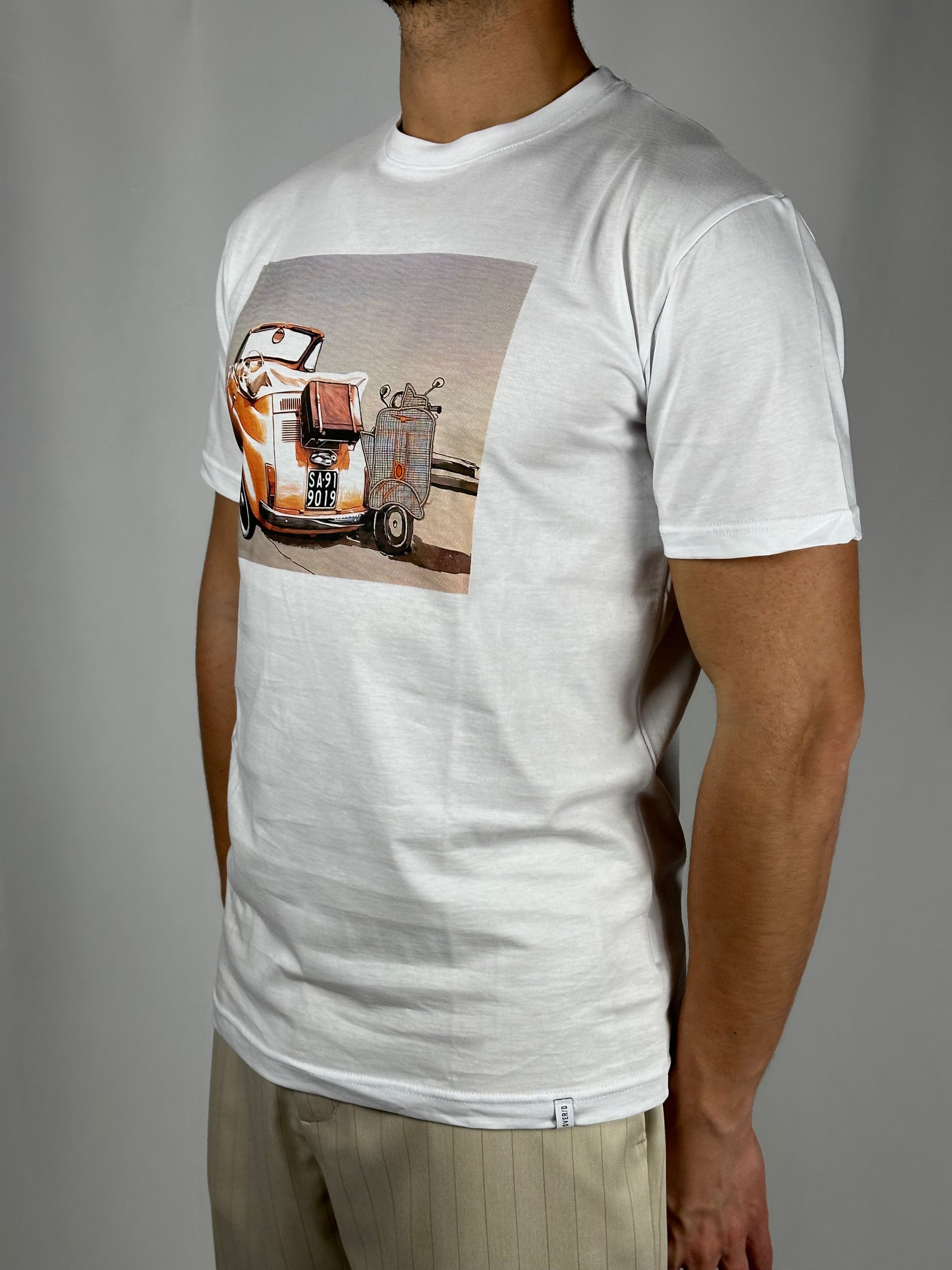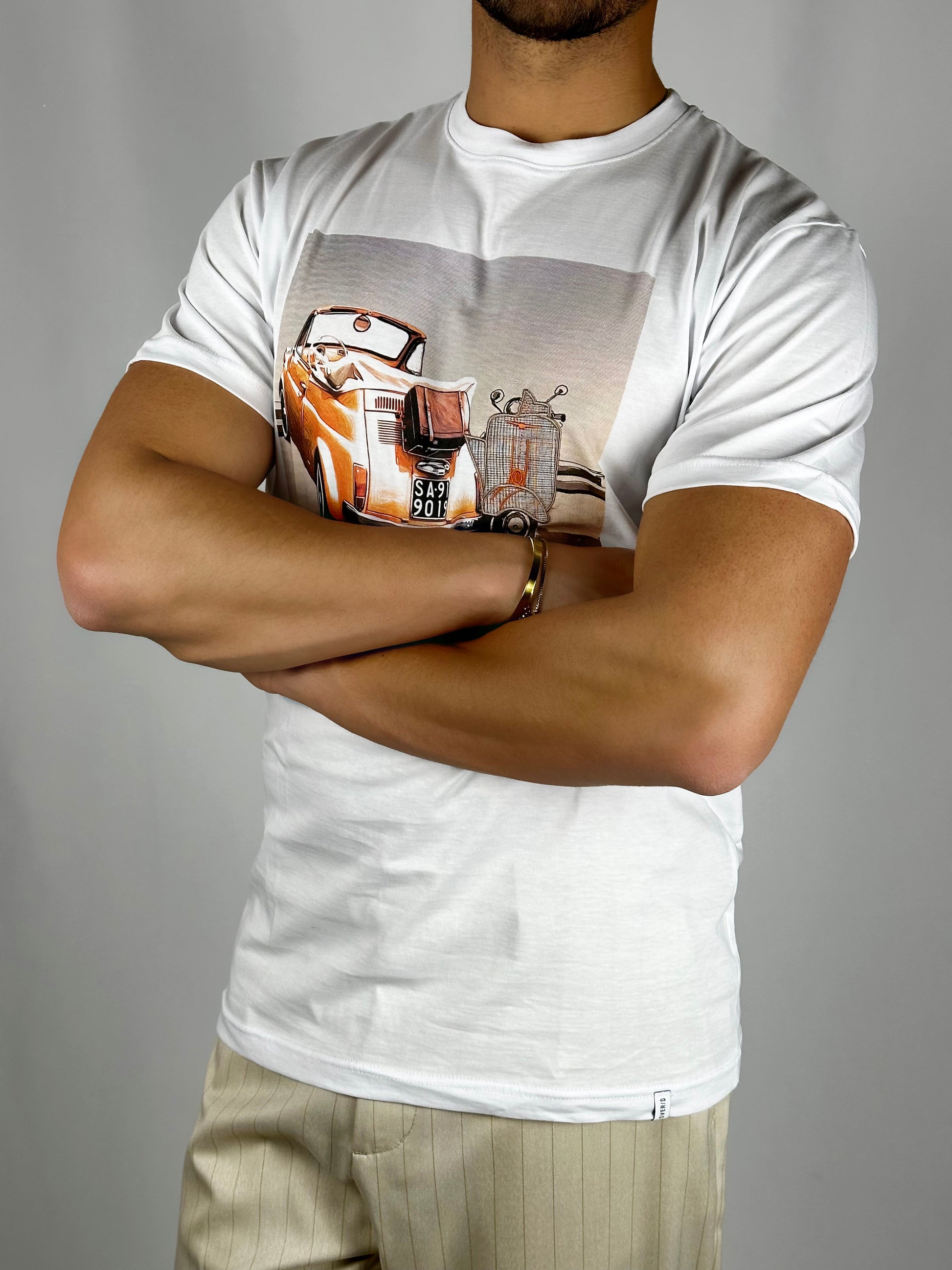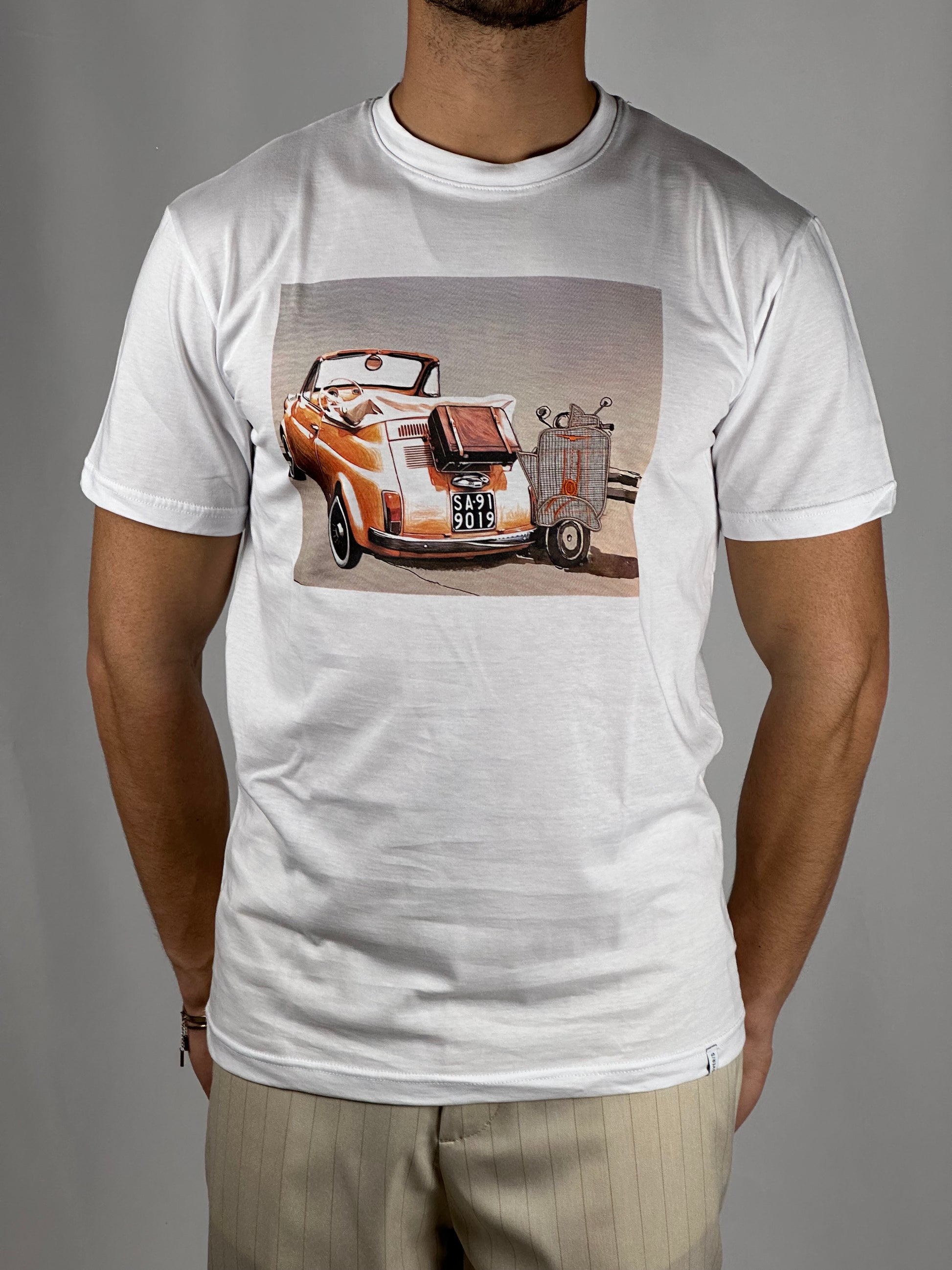 T-Shirt bianca con stampa auto al centro, brand over-d. Il prodotto è indossato da un modello alto 183 cm ed indossa una L.