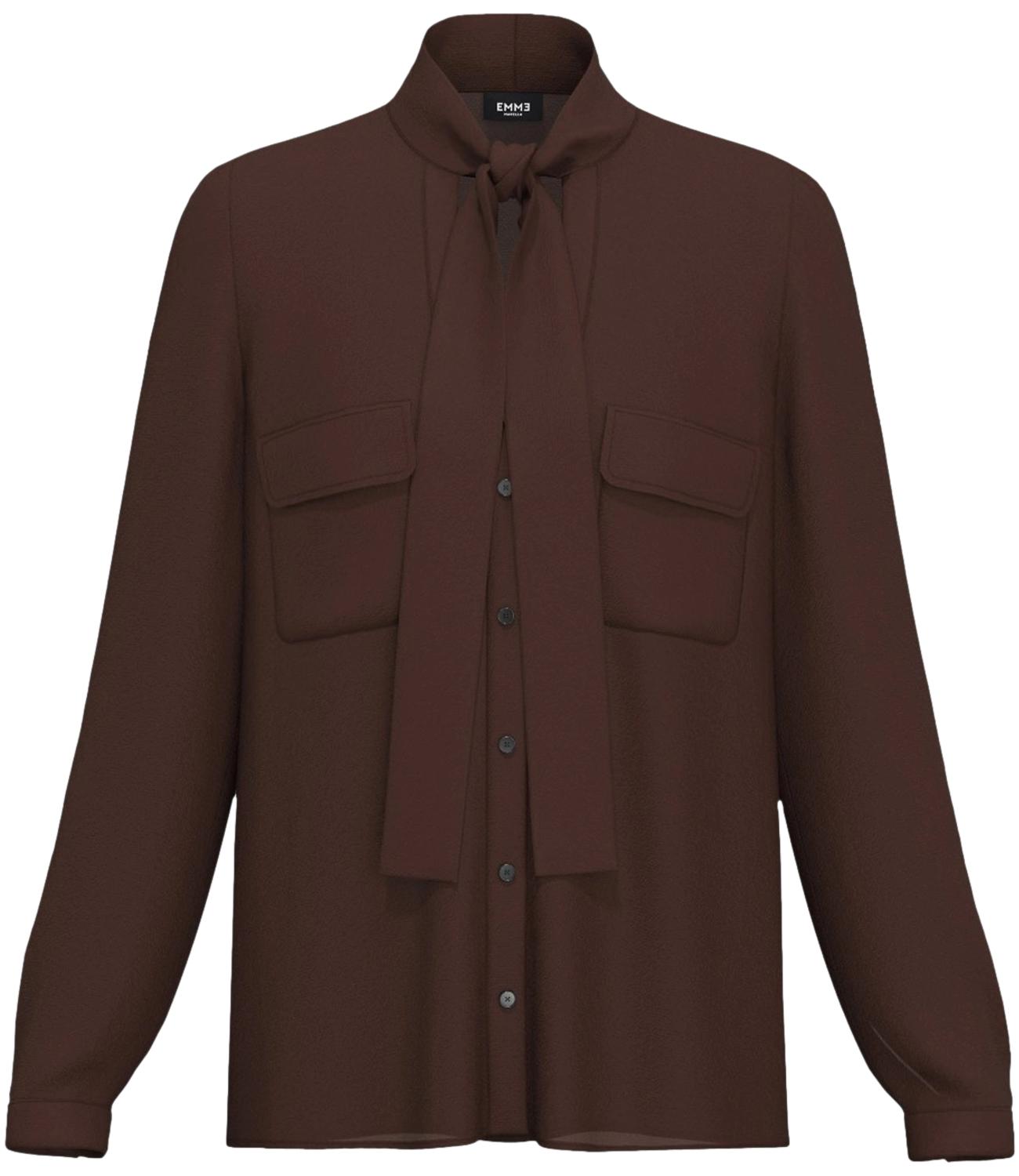 Camicia in crêpe de Chine di misto seta. Fit leggermente sfiancato. Scollo a V con sciarpina da annodare sul davanti. Abbottonatura a vista. Motivo di arricci sulla parte alta del giro manica. Fondo dritto stondato