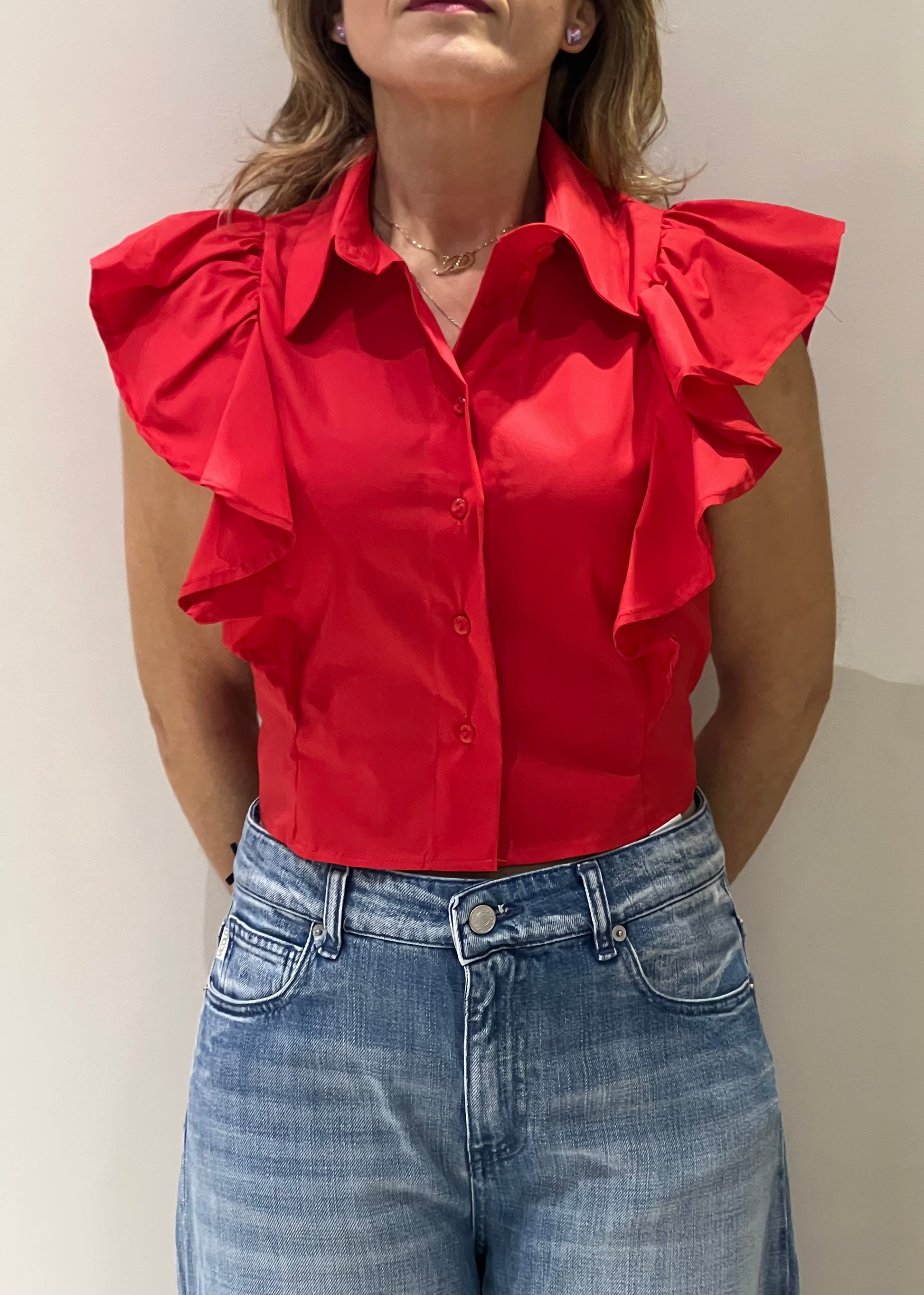 La camicia rossa ha un design elegante e moderno, con un taglio corto che arriva appena sopra la vita. È caratterizzata da una colletto classico e una chiusura a bottoni sul davanti. Le maniche sono senza spalline, ma sono impreziosite da ampie volants che creano un effetto voluminoso e femminile, aggiungendo dinamismo al look. Il tessuto è rigido, ma leggero, che dona struttura al capo. Il colore rosso brillante rende la camicia vivace e perfetta per un look audace e sofisticato. È un capo versatile che può essere abbinato a pantaloni eleganti o gonne a vita alta per un outfit elegante e alla moda.