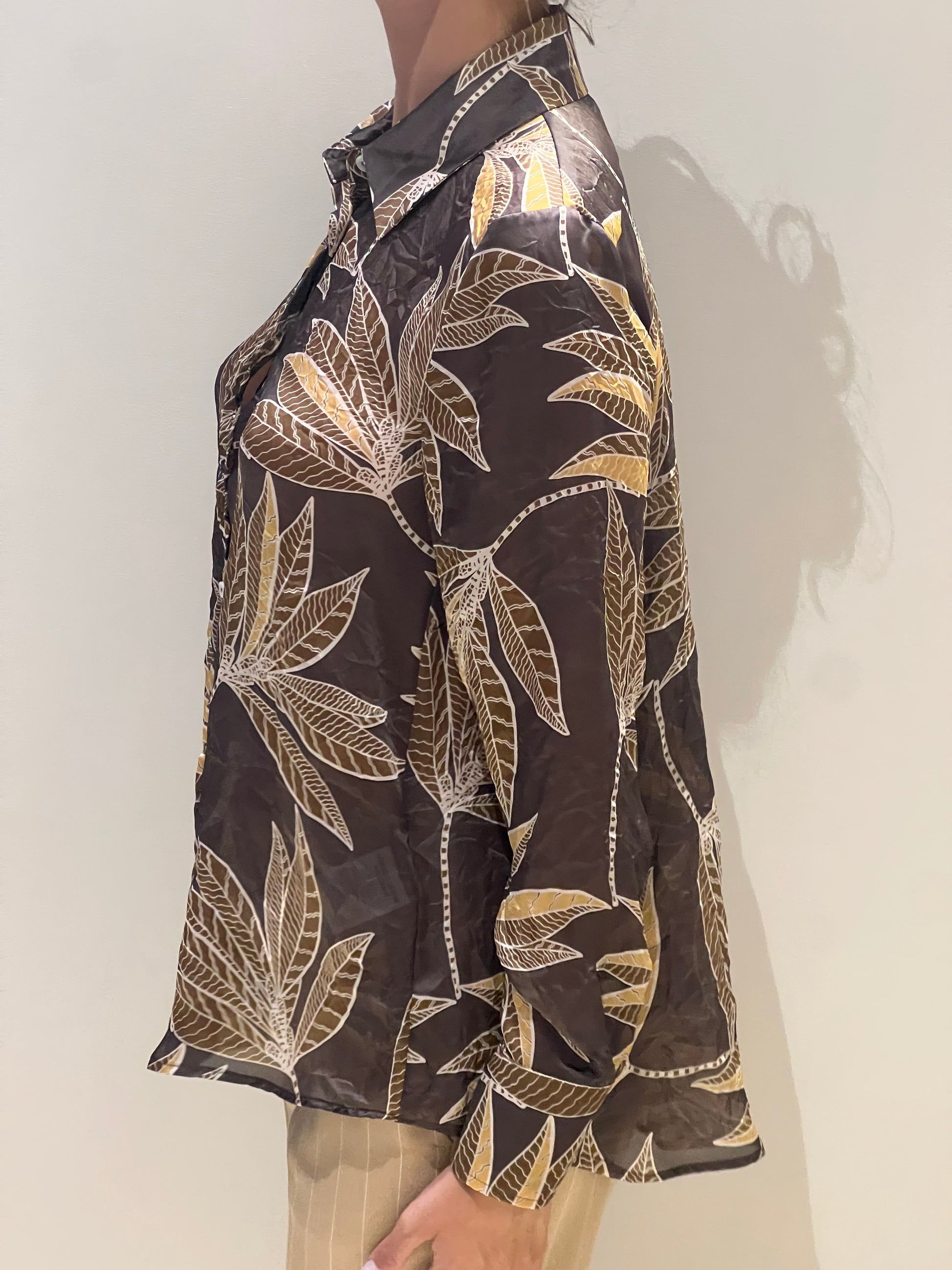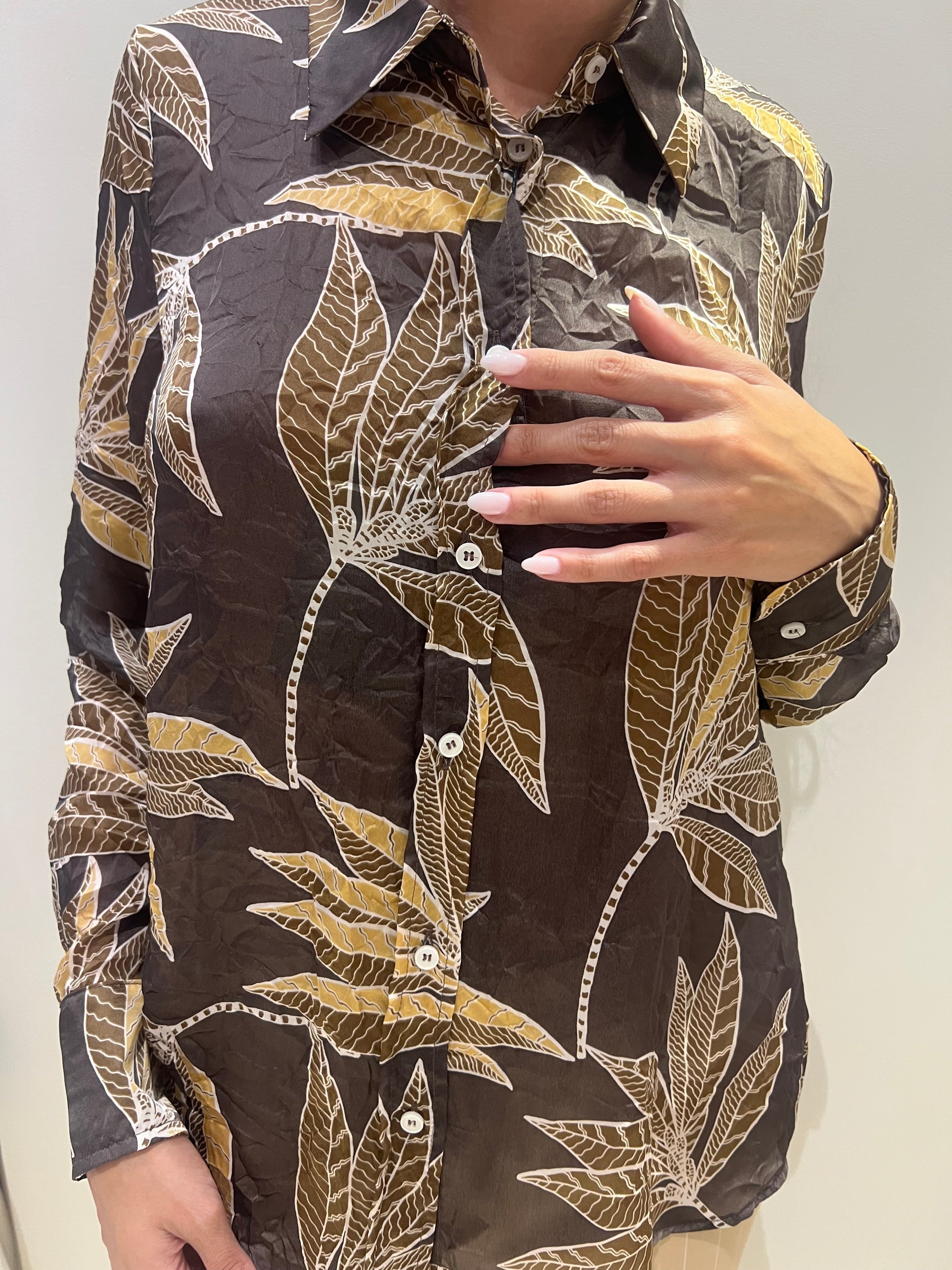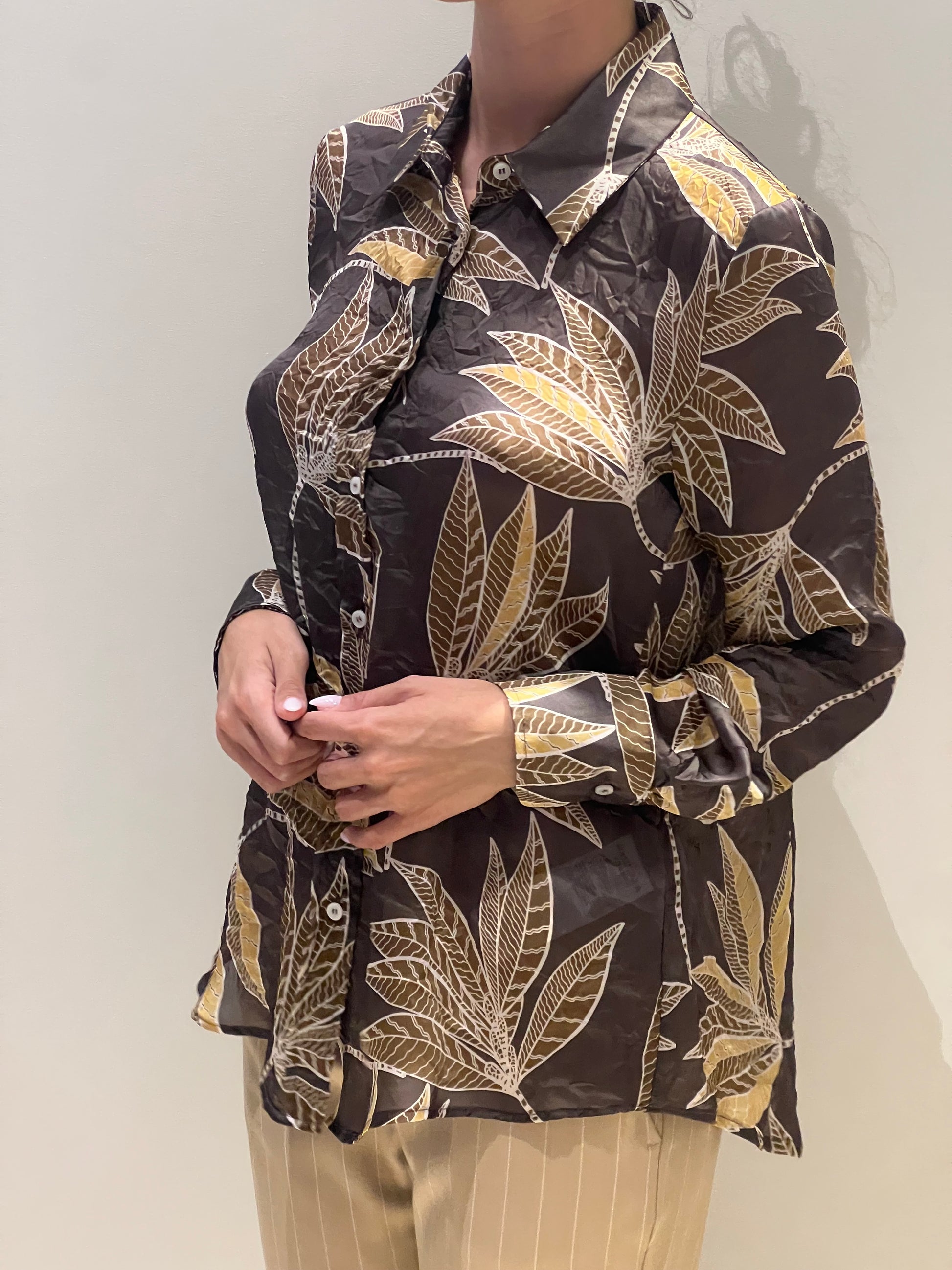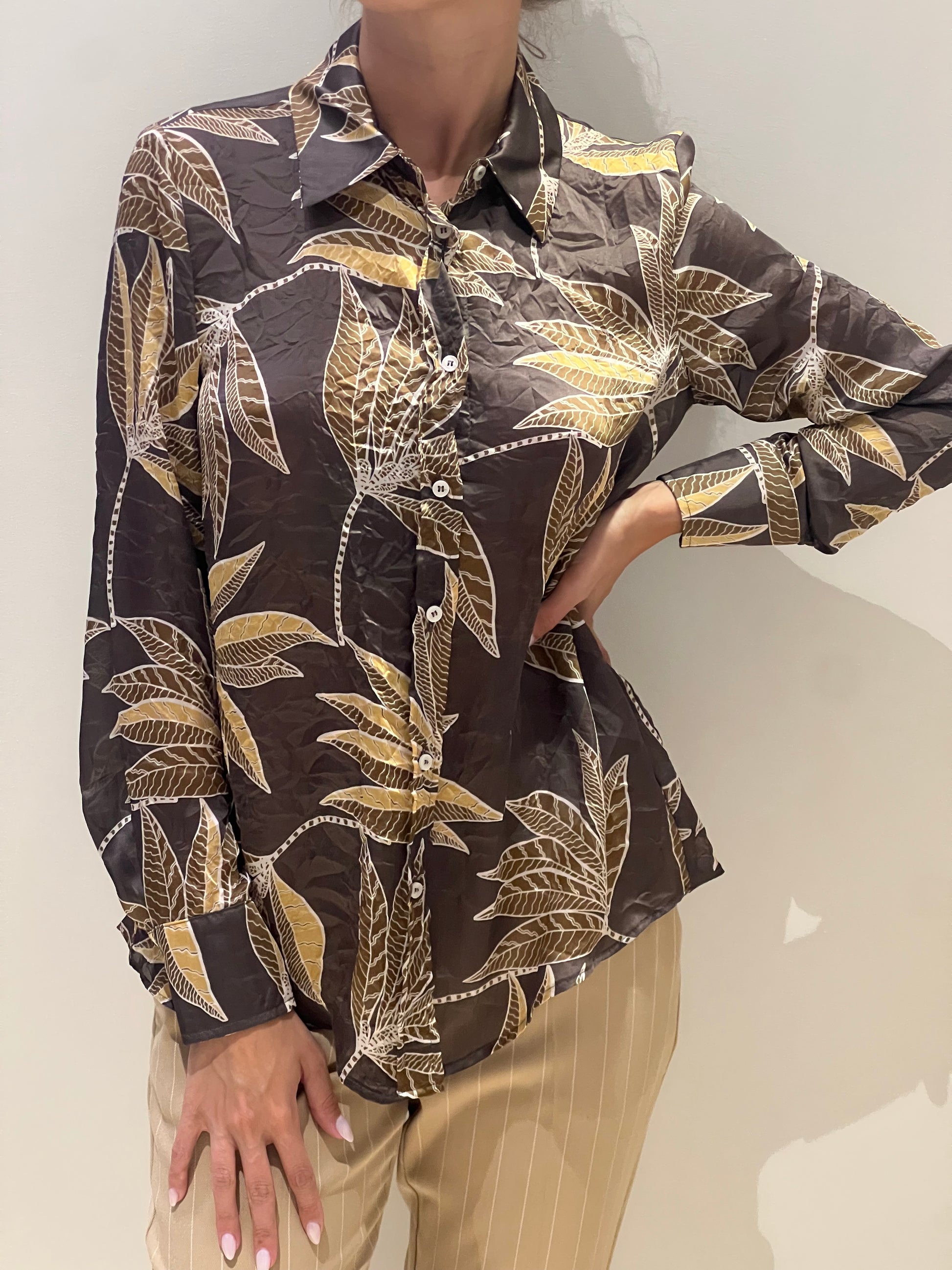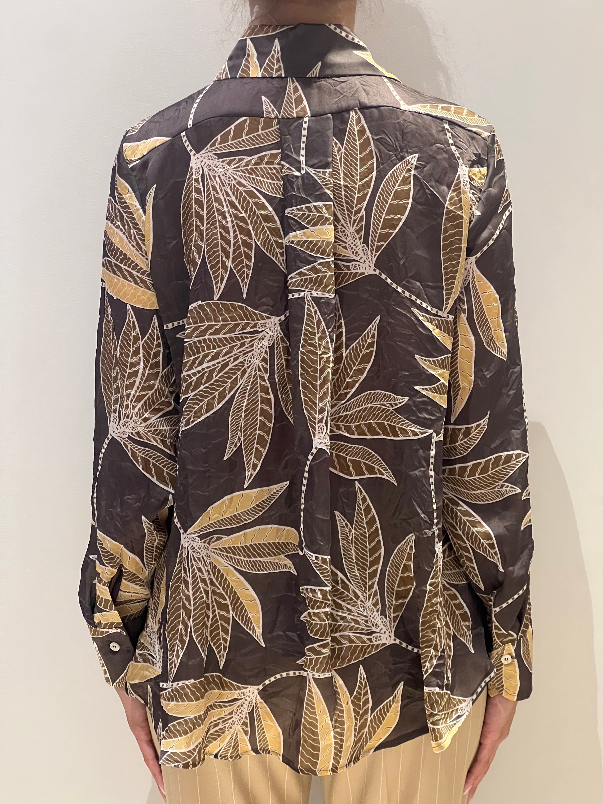 Lasciati ispirare dai colori e dalla fantasia audace di questa camicia in raso: facile da abbinare con blazer e longuette, o da indossare con i denim wide leg di collezione.