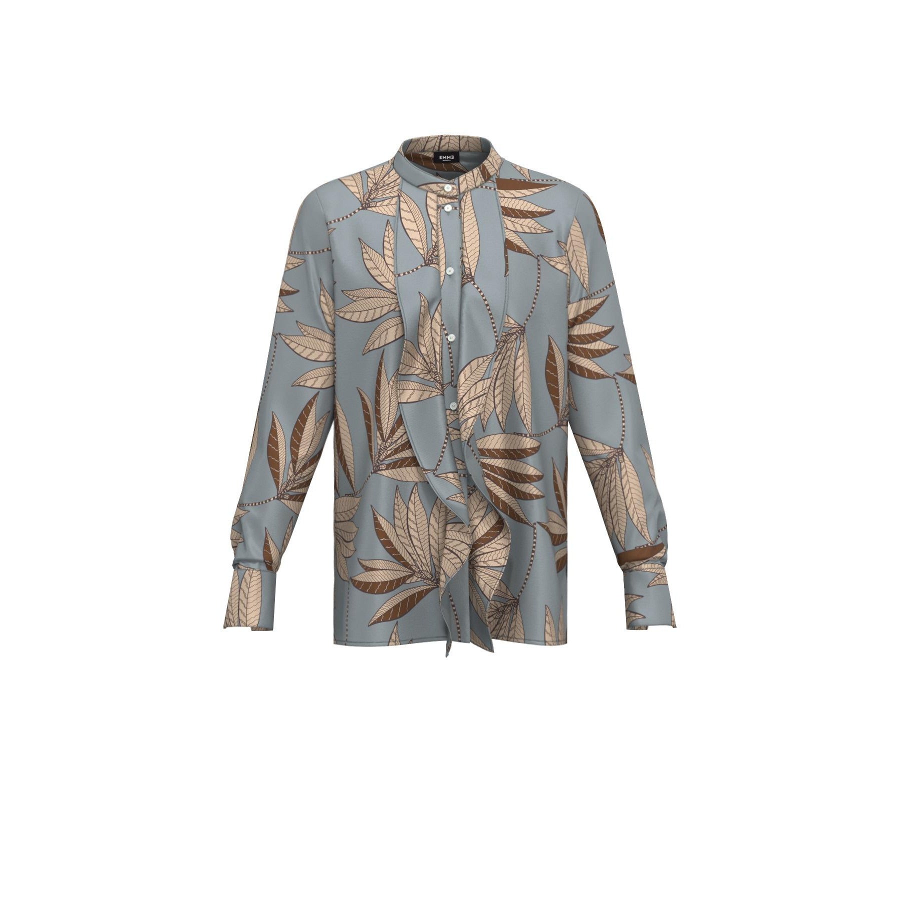 Camicia "Neon" in tessuto tecnico stampato carta da zucchero con motivo foliage. Modello dal fit dritto con collo alla coreana e abbottonatura a vista. Dettagli di piccoli volant sul davanti e maniche lunghe con polso a bottone e leggero sbuffo. Realizzata con tessuto contenente oltre il 50% di poliestere riciclato.
