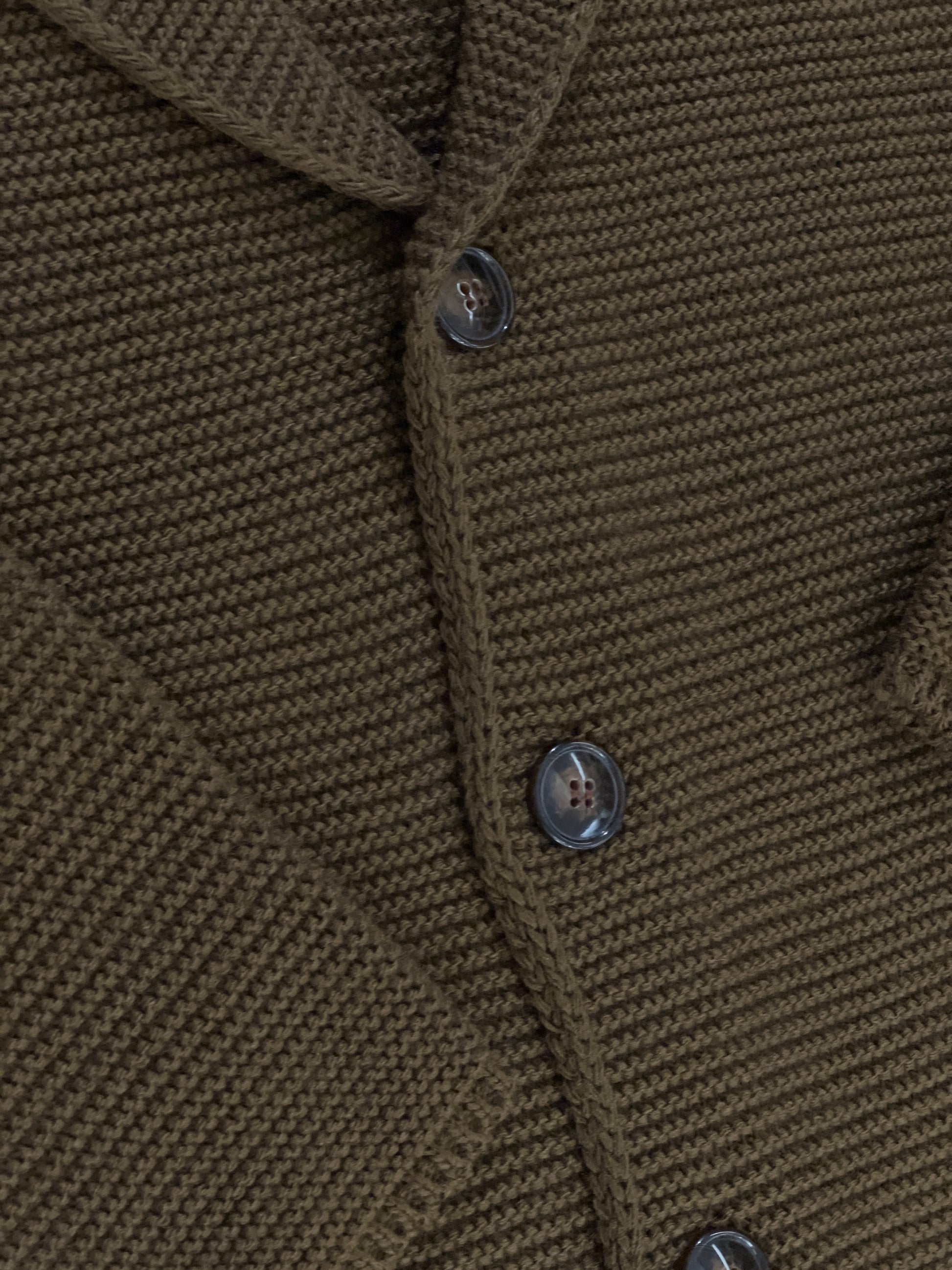 Il capo è una cardigan in maglia con lavorazione a coste orizzontali e una struttura semi-rigida, che gli conferisce un aspetto elegante ma informale. Presenta:
