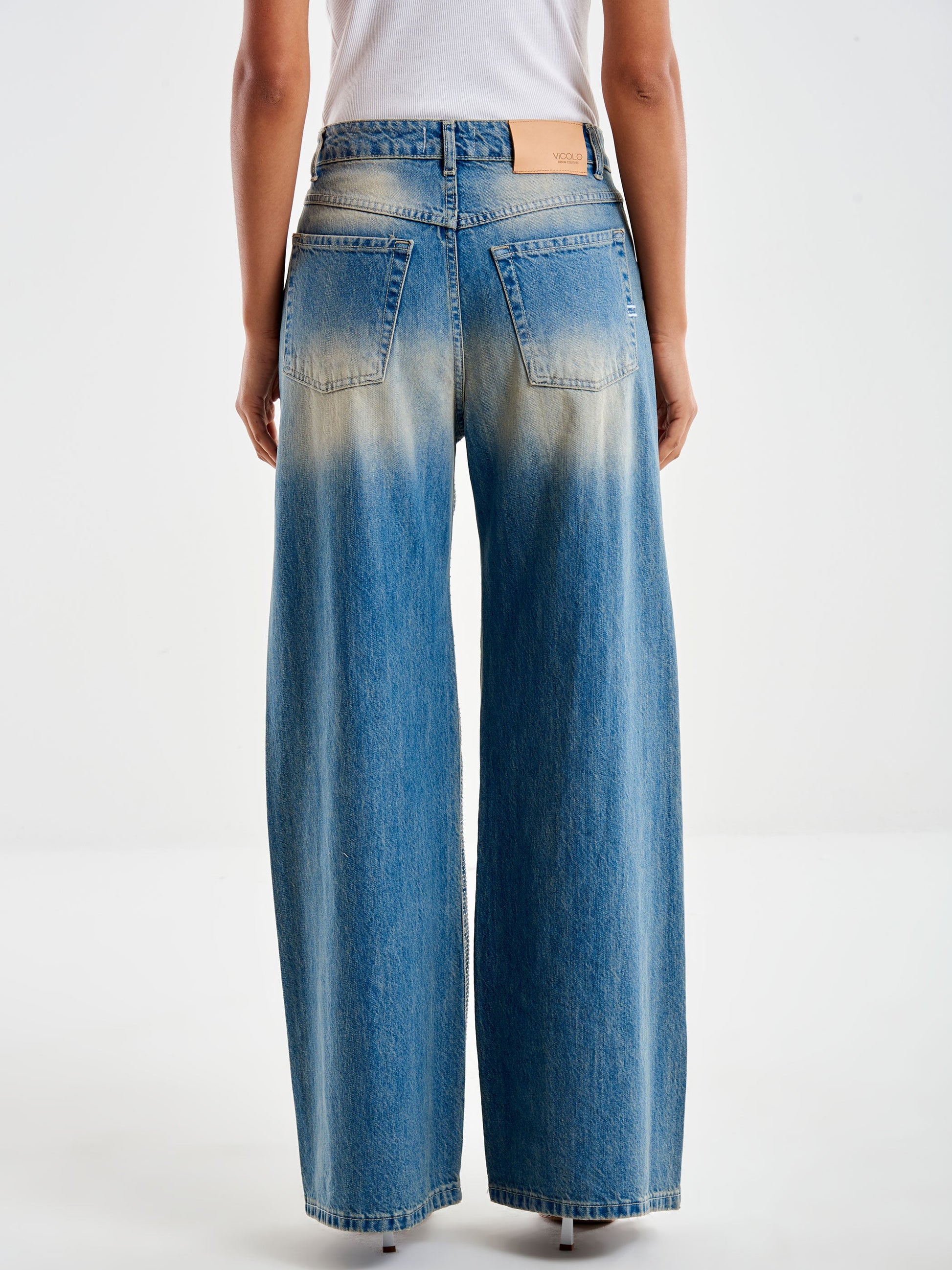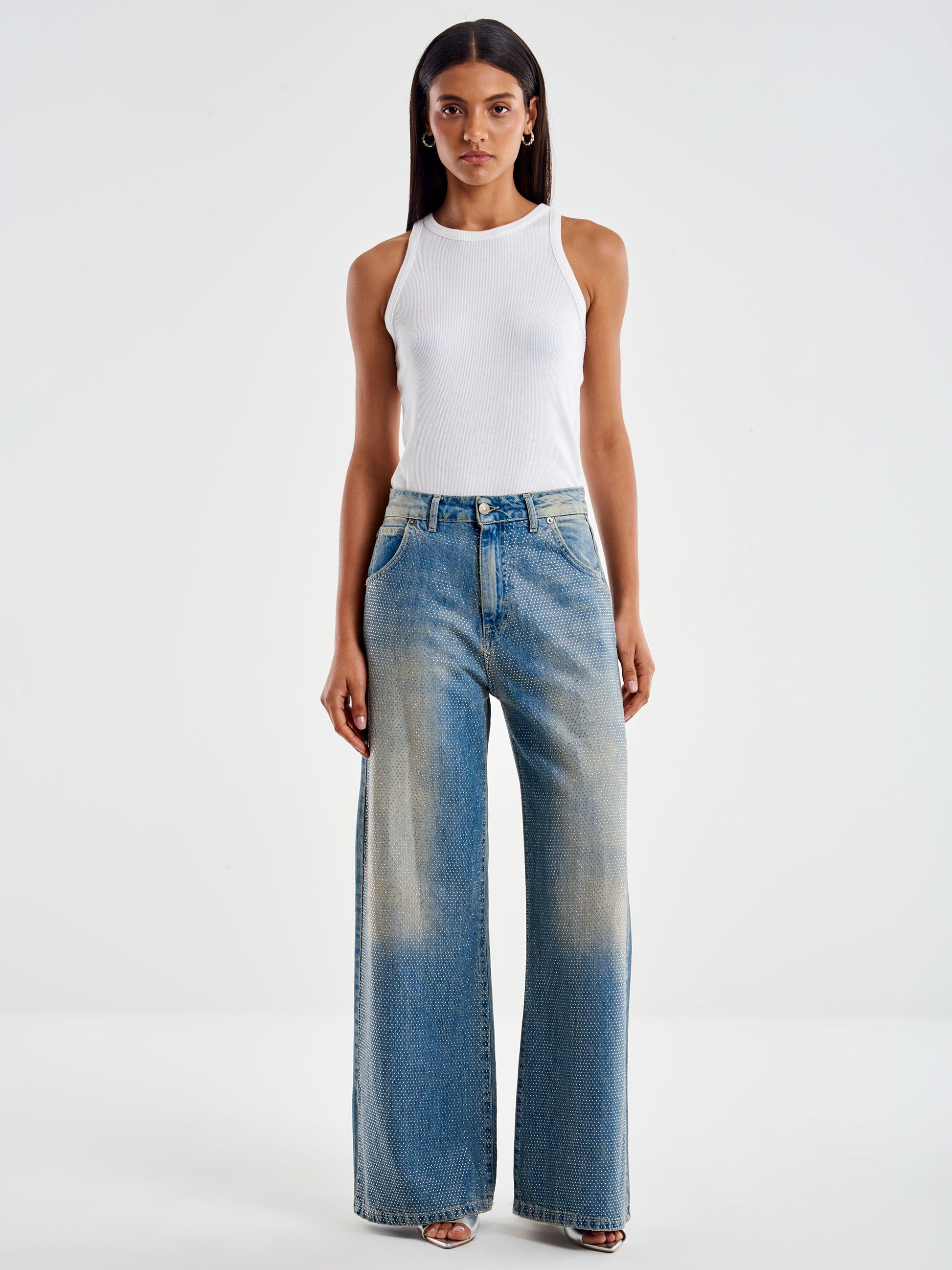 Jeans ampio michelle vita alta. Modello cinque tasche. Gamba ampia. Dettaglio strass applicati frontalmente. Denim slavato.