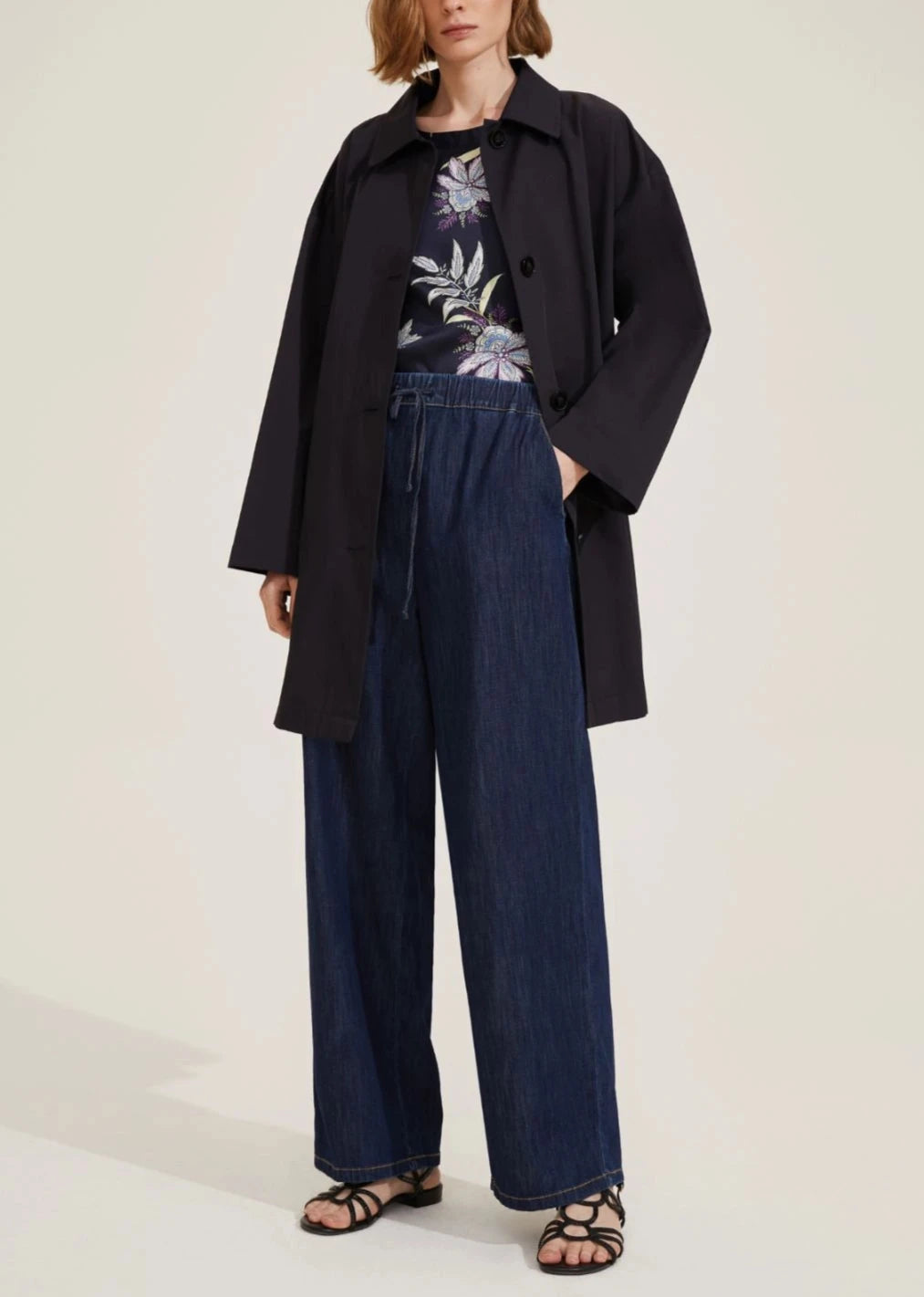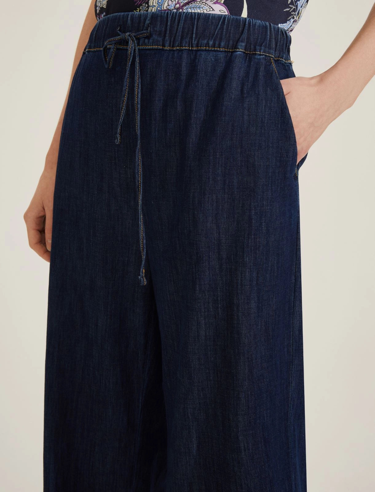 In equilibrio perfetto tra stile e comfort, questo pantalone ampio gioca con dettagli sartoriali e con il tocco sportivo della coulisse in vita.