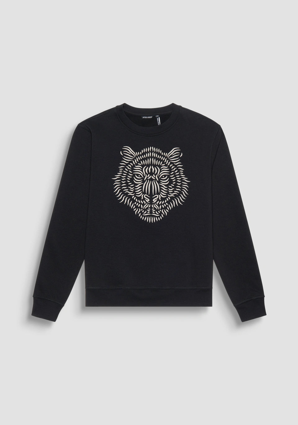 Attirerà gli sguardi questa felpa girocollo a maniche lunghe con vestibilità regular. Confezionata in confortevole tessuto sostenibile misto di cotone tinta unita, presenta sul davanti una maxi stampa tigre effetto gommato. Polsini e fondo elasticizzati ed il logo applicato sul collo completano il capo.