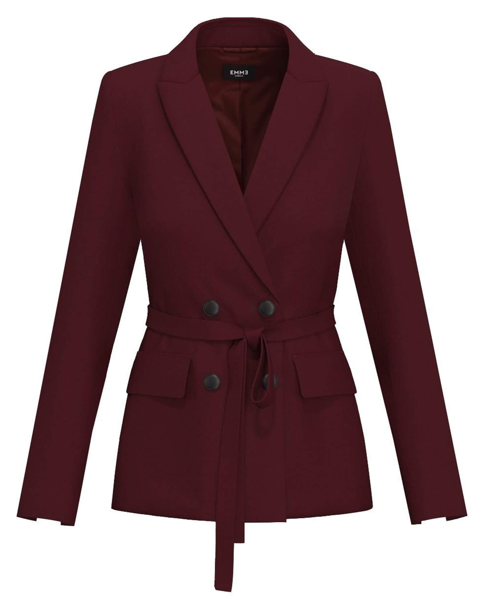 Blazer in flanella di misto viscosa stretch. Fit sfiancato e femminile. Scollo con rever a lancia. Chiusura doppio petto con bottoni e cintura in vita. Tasche laterali con patta. Capo foderato