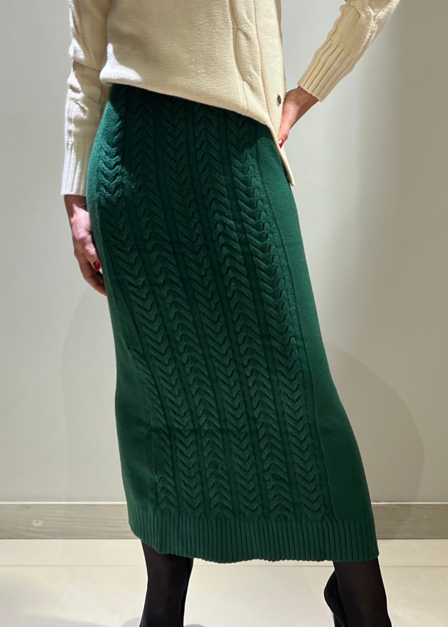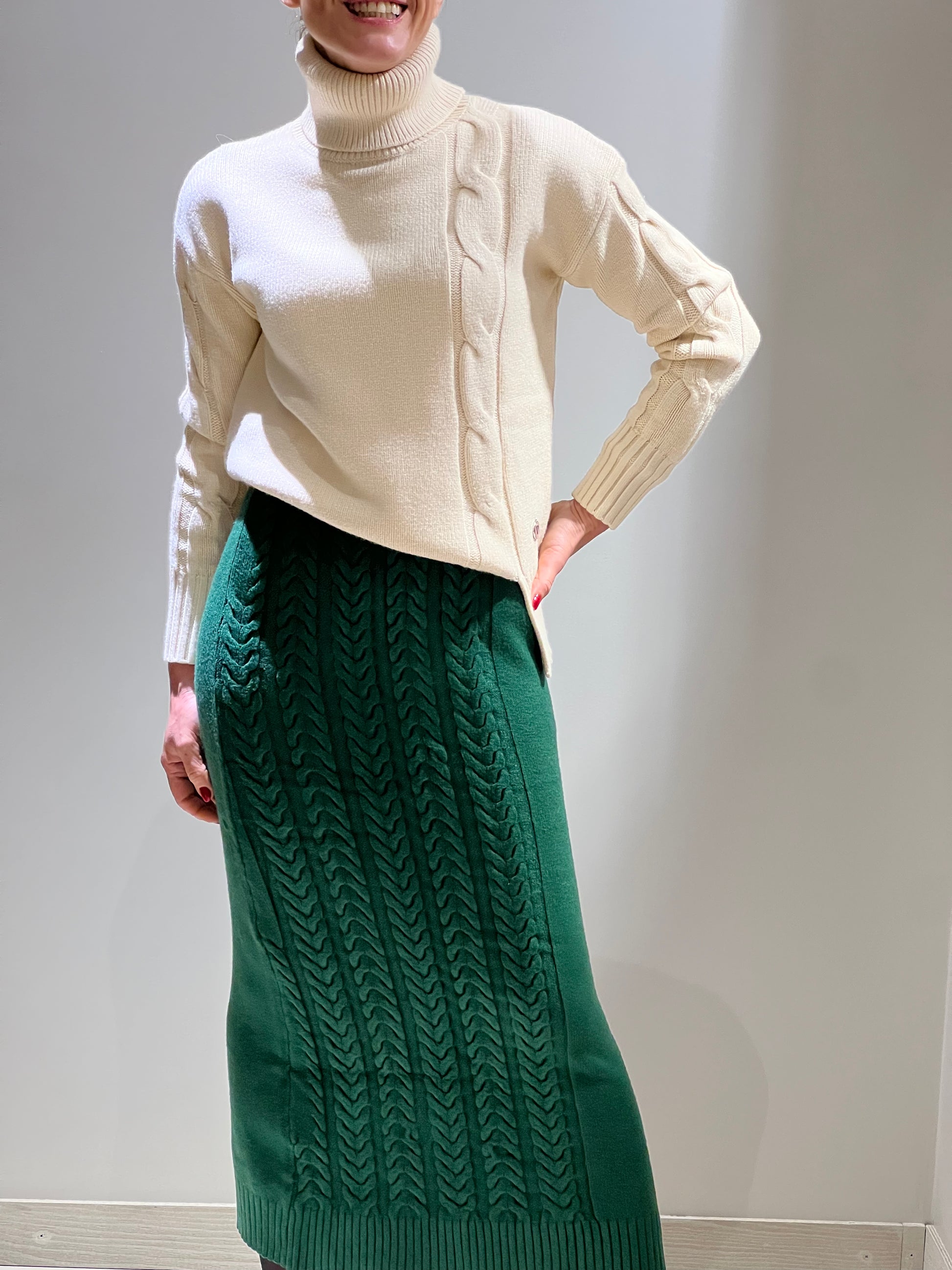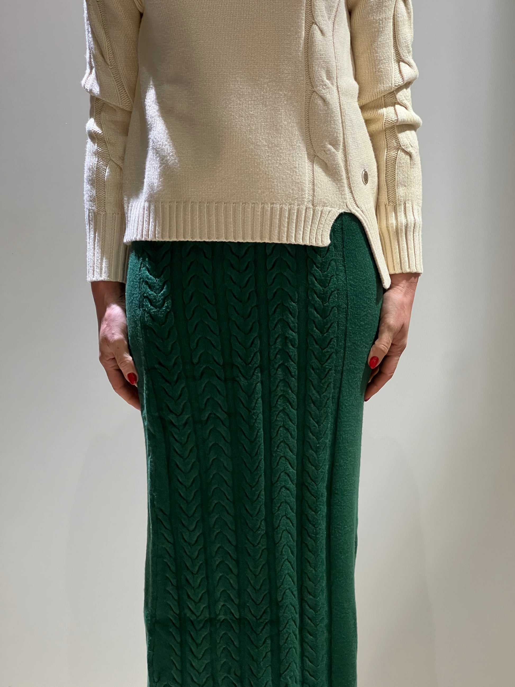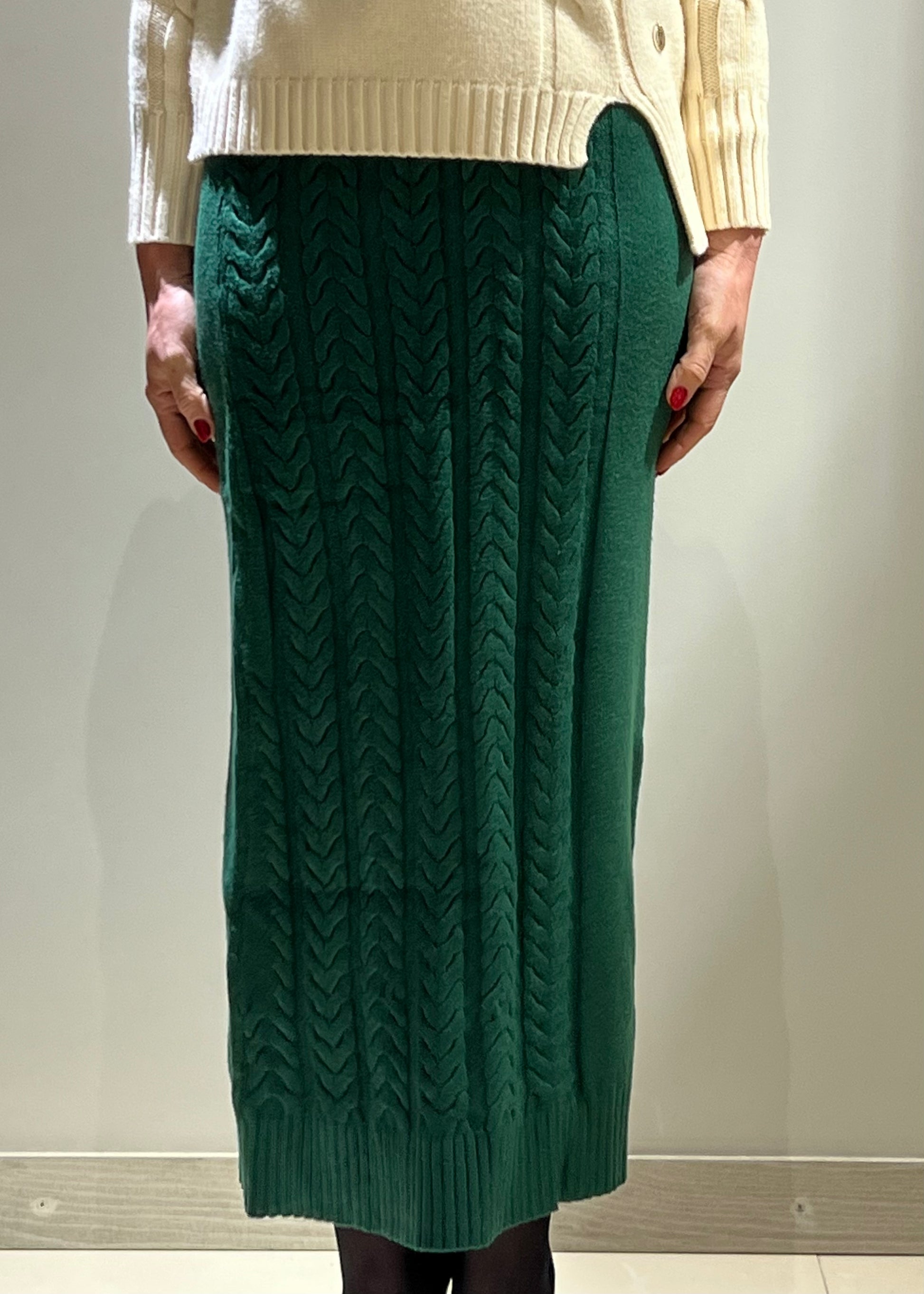 Gonna lunga verde in maglia che sfiora la caviglia, caratterizzata da un pratico elastico in vita.