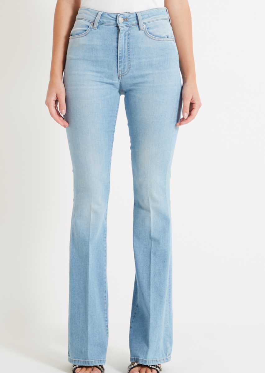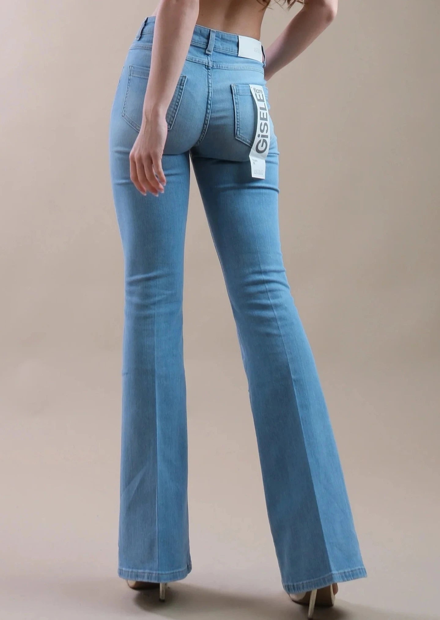 Jens gisele lavaggio chiaro, modello flare con due tasche frontali e due posteriori, chiusura con zip e bottone, schiariture sulle gambe.
