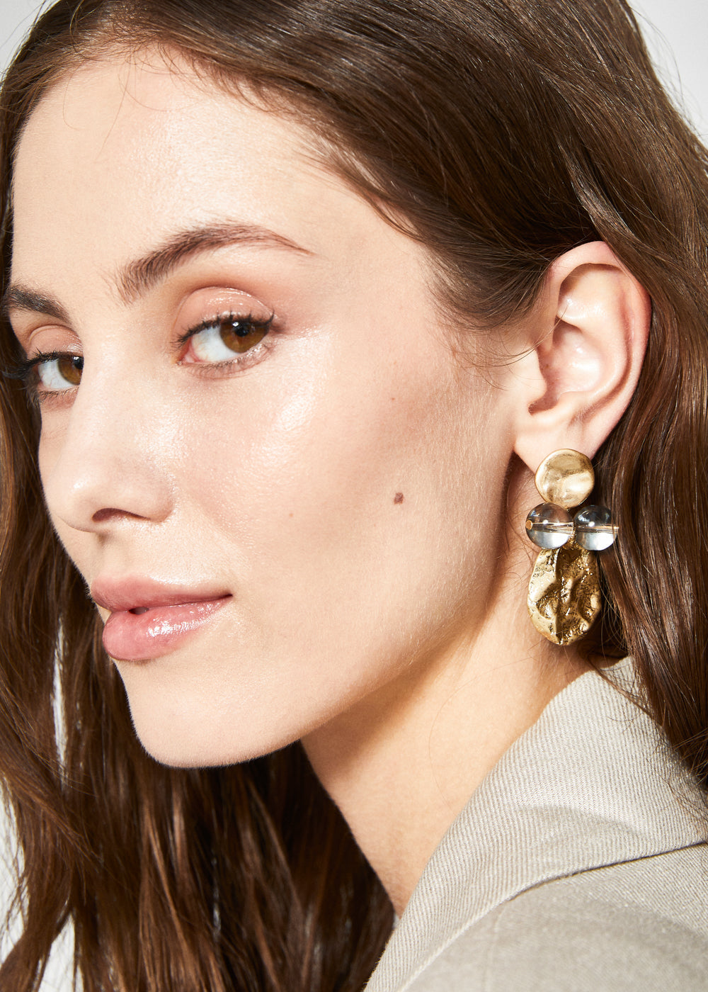 Un paio di orecchini delicati con un design elegante. Ogni orecchino presenta un ciondolo a forma di goccia, arricchito da perle e pietre trasparenti, che offrono un aspetto sofisticato e luminoso.