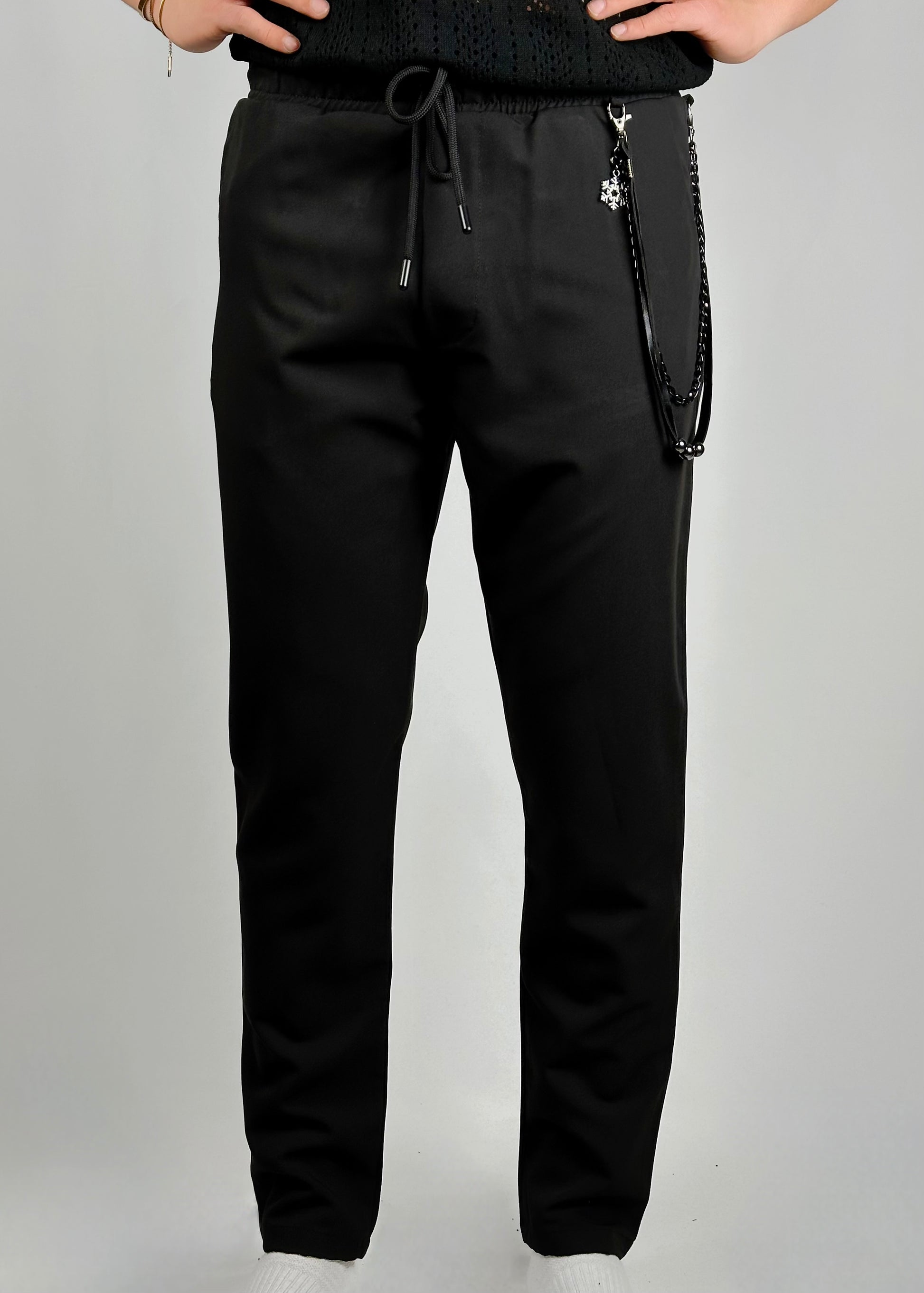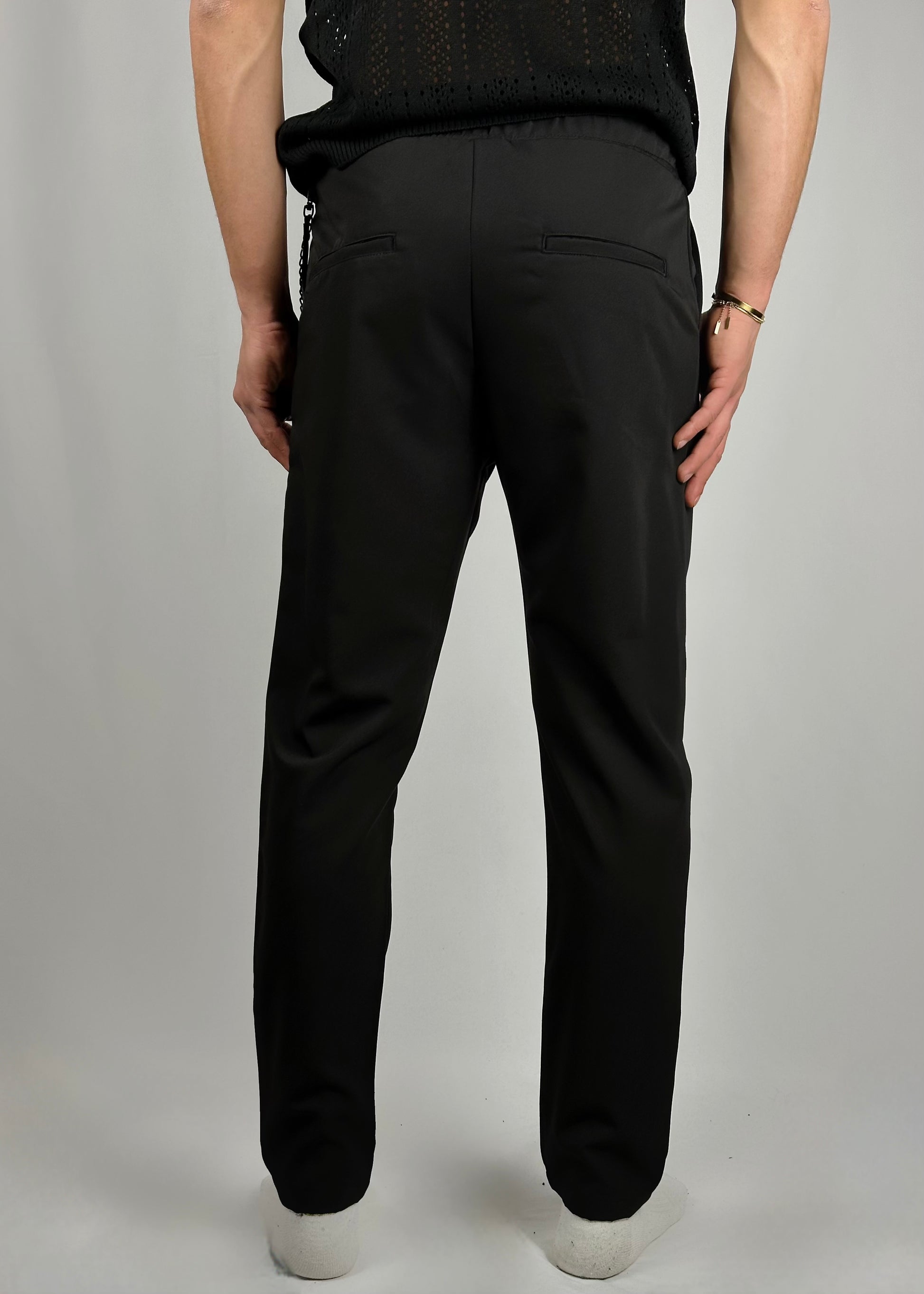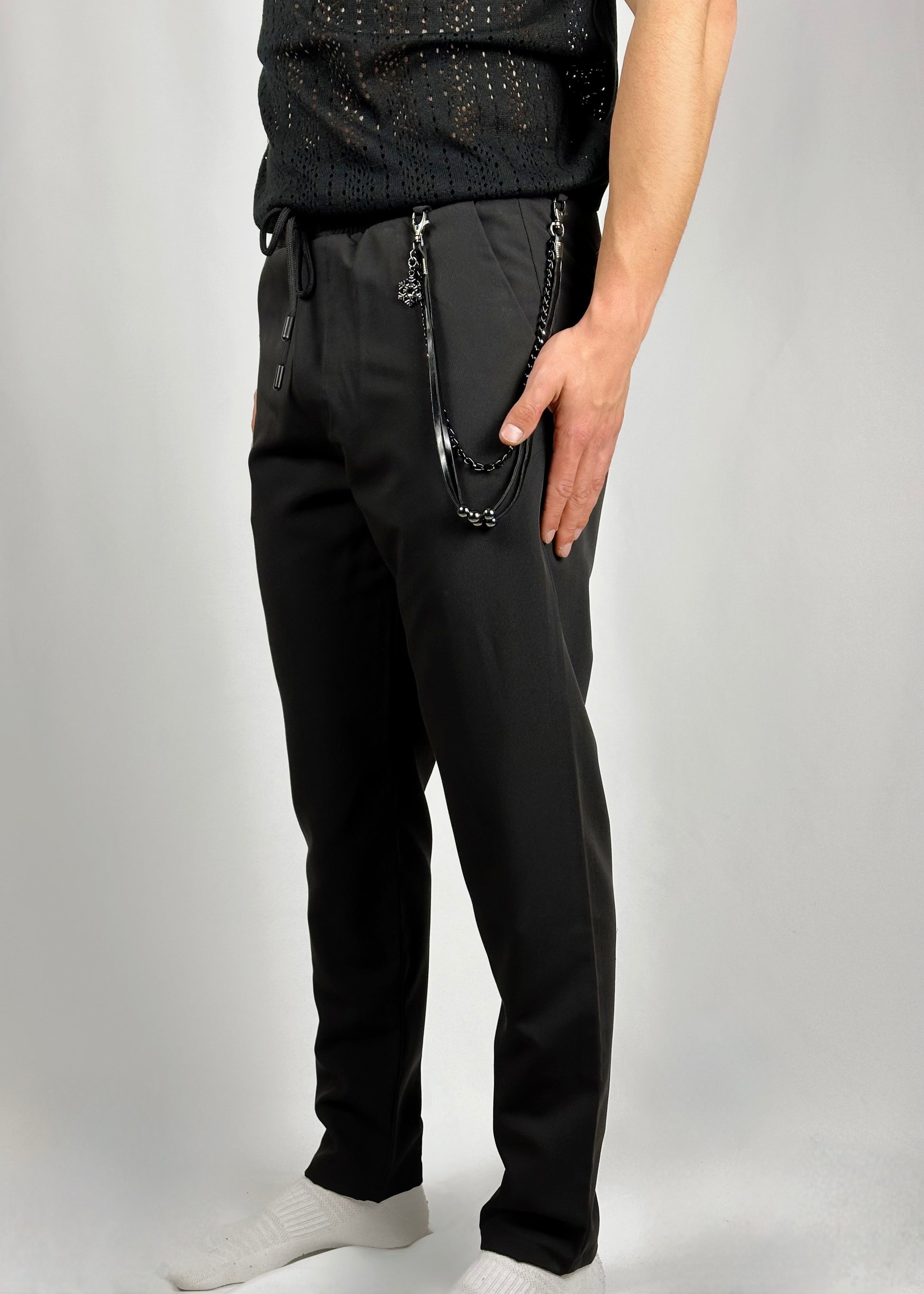 Il pantalone di tessuto tecnico con catena nella tasca rappresenta l'incarnazione dell'eleganza urbana e della modernità. Realizzato in un tessuto tecnico di alta qualità, offre una sensazione di comfort e libertà di movimento in ogni contesto. Il colore nero del pantalone conferisce un'eleganza senza tempo, mentre la catena nera nella tasca aggiunge un tocco di raffinatezza e originalità al capo. Il dettaglio della catena si fonde armoniosamente con il tessuto, creando un contrasto discreto ma intrigante. Questo pantalone è ideale per coloro che cercano un look sofisticato e contemporaneo, perfetto per le occasioni sia formali che informali. Indossarlo significa abbracciare lo spirito dell'eleganza senza sforzo con un tocco di audacia.