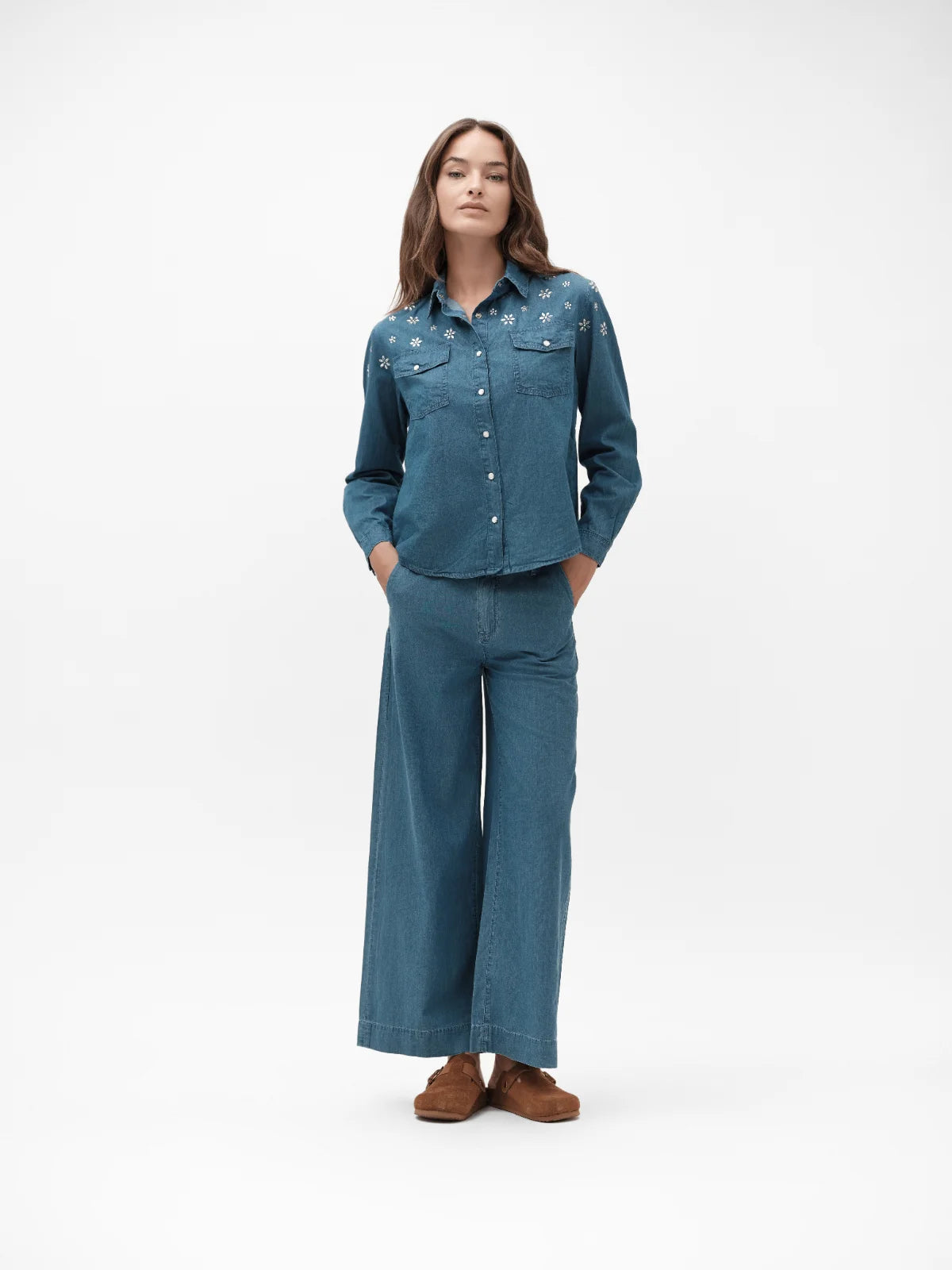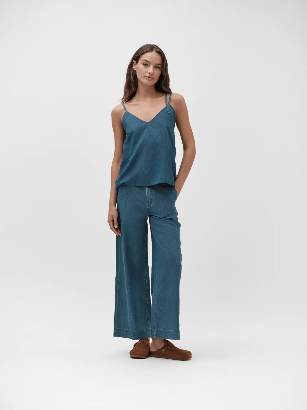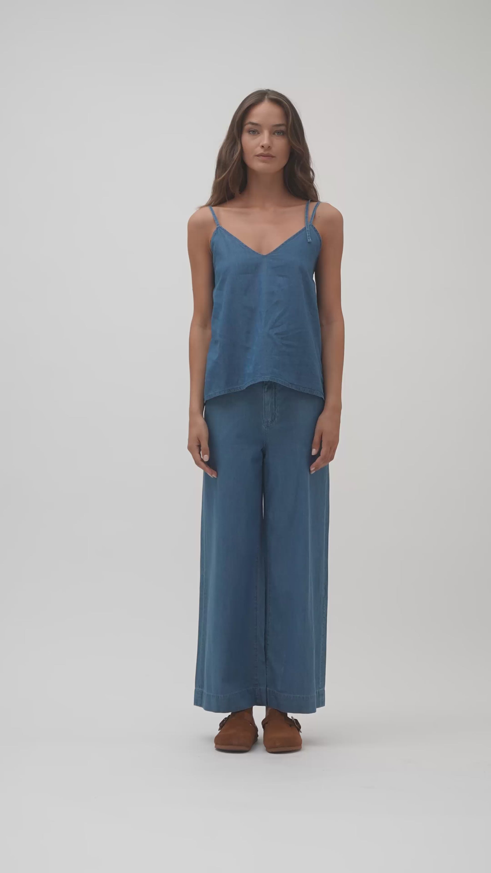 Pantalone ampio in chambray caratterizzato da tessuto super leggero e silhouette a vita alta. Il design fluido offre comfort ottimale mantenendo un'estetica raffinata. La vestibilità è generosa e adattabile a diverse corporature. Per riferimento, la modella che indossa il capo nelle immagini e nei video è alta 174 cm.