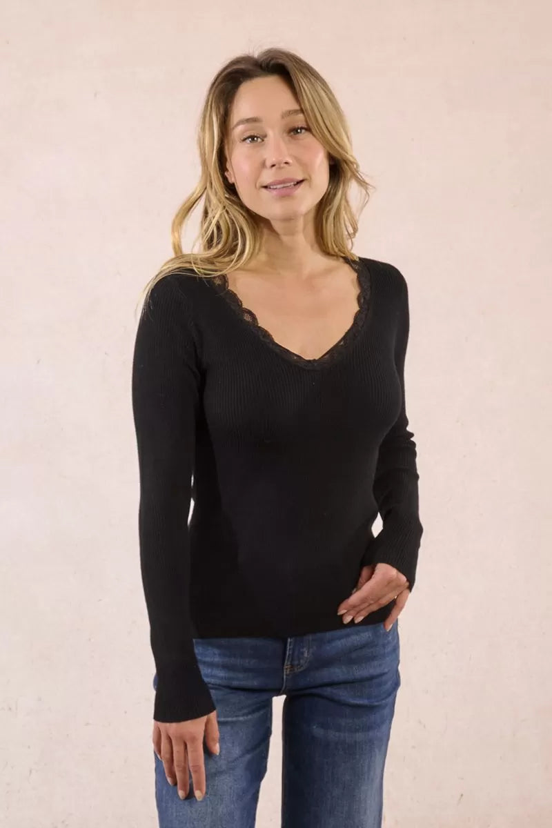 Canottiera in maglia a coste - Vestibilità attillata - Maniche lunghe - Scollo a V impreziosito da una fascia in pizzo - Lunghezza dalla spalla 60 cm per la taglia S"