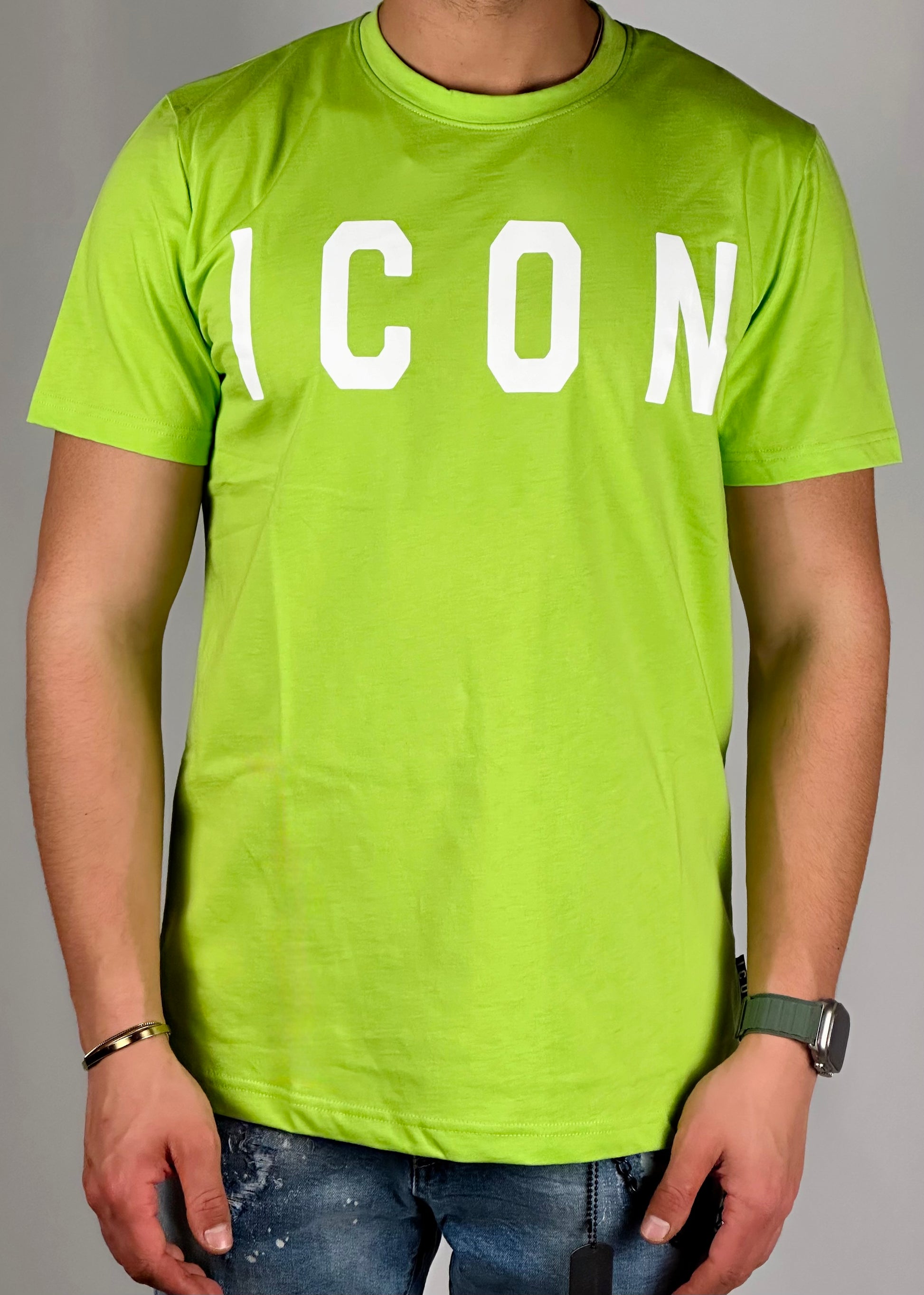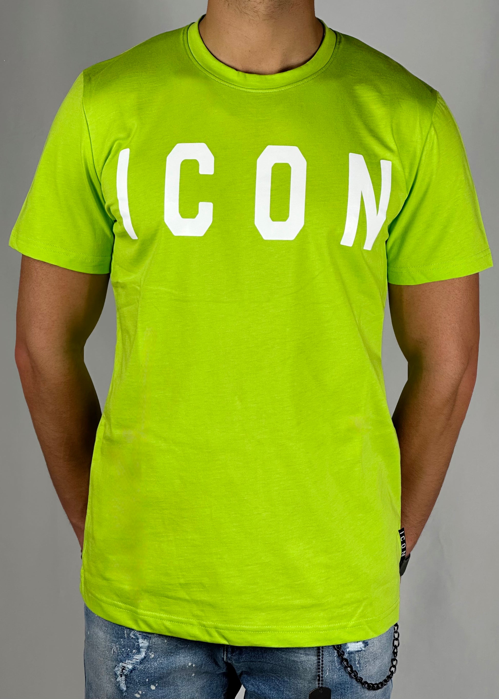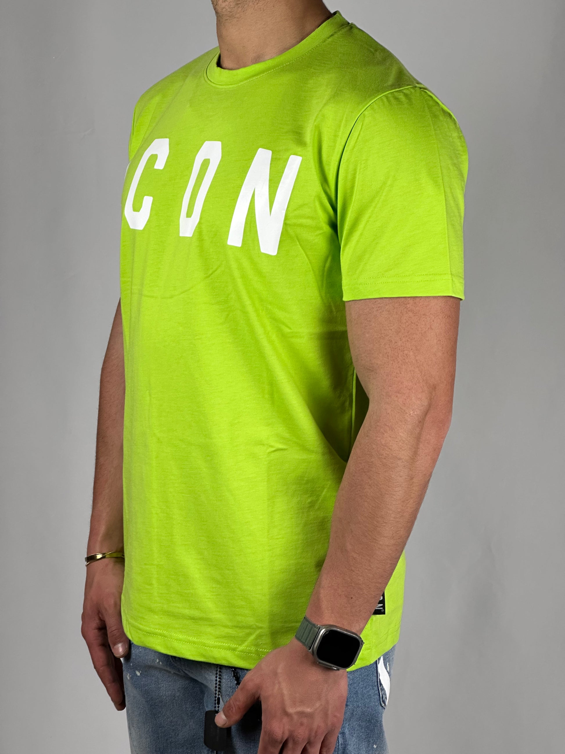 Luminosa e audace, questa T-shirt giallo fluorescente con scritta "icon" bianca è un'esplosione di stile. Perfetta per distinguerti dalla folla, la sua tonalità accattivante cattura l'attenzione.