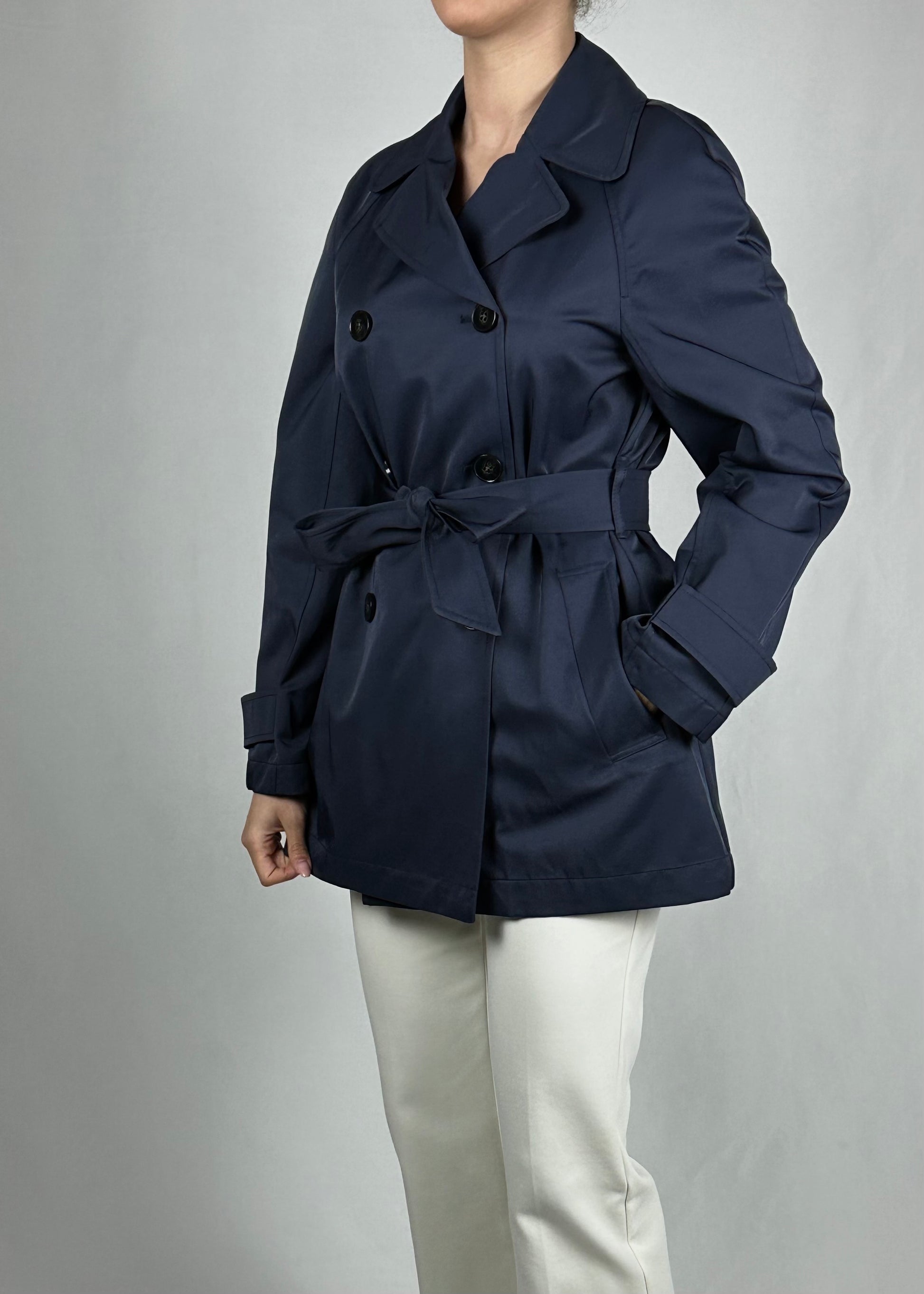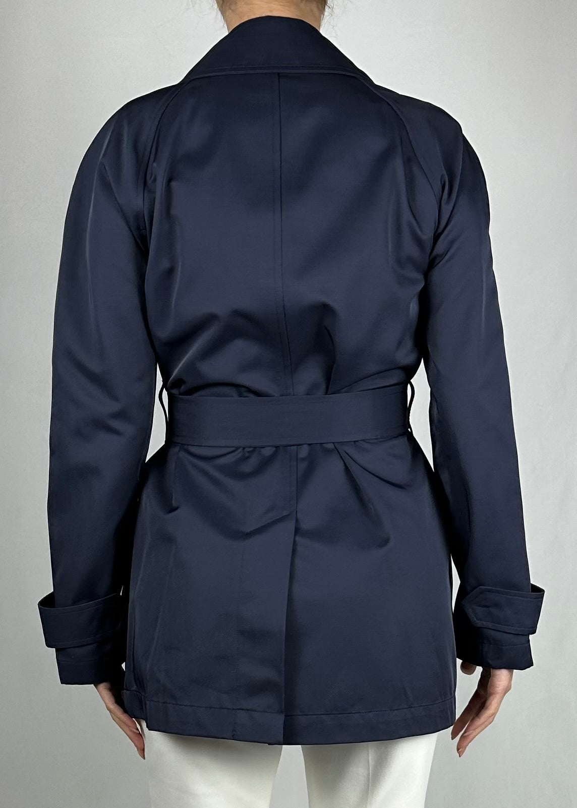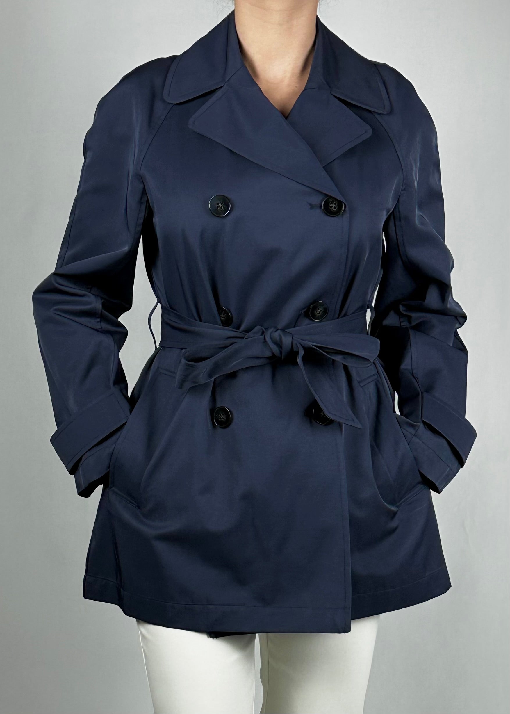 Trench corto in gabardine antigoccia, linea dritta con cintura, collo a rever, chiusura a doppiopetto, maniche lunghe con alamaro sul fondo, tasche a filetto.