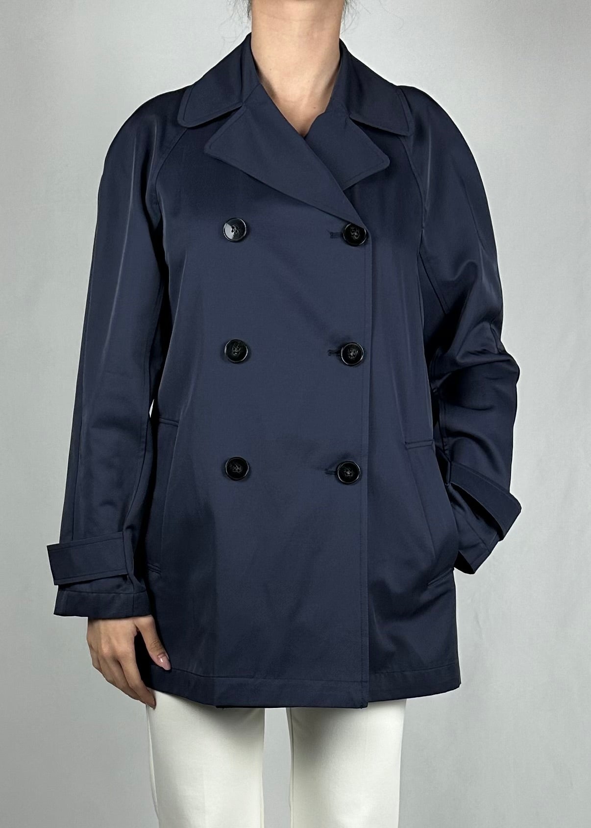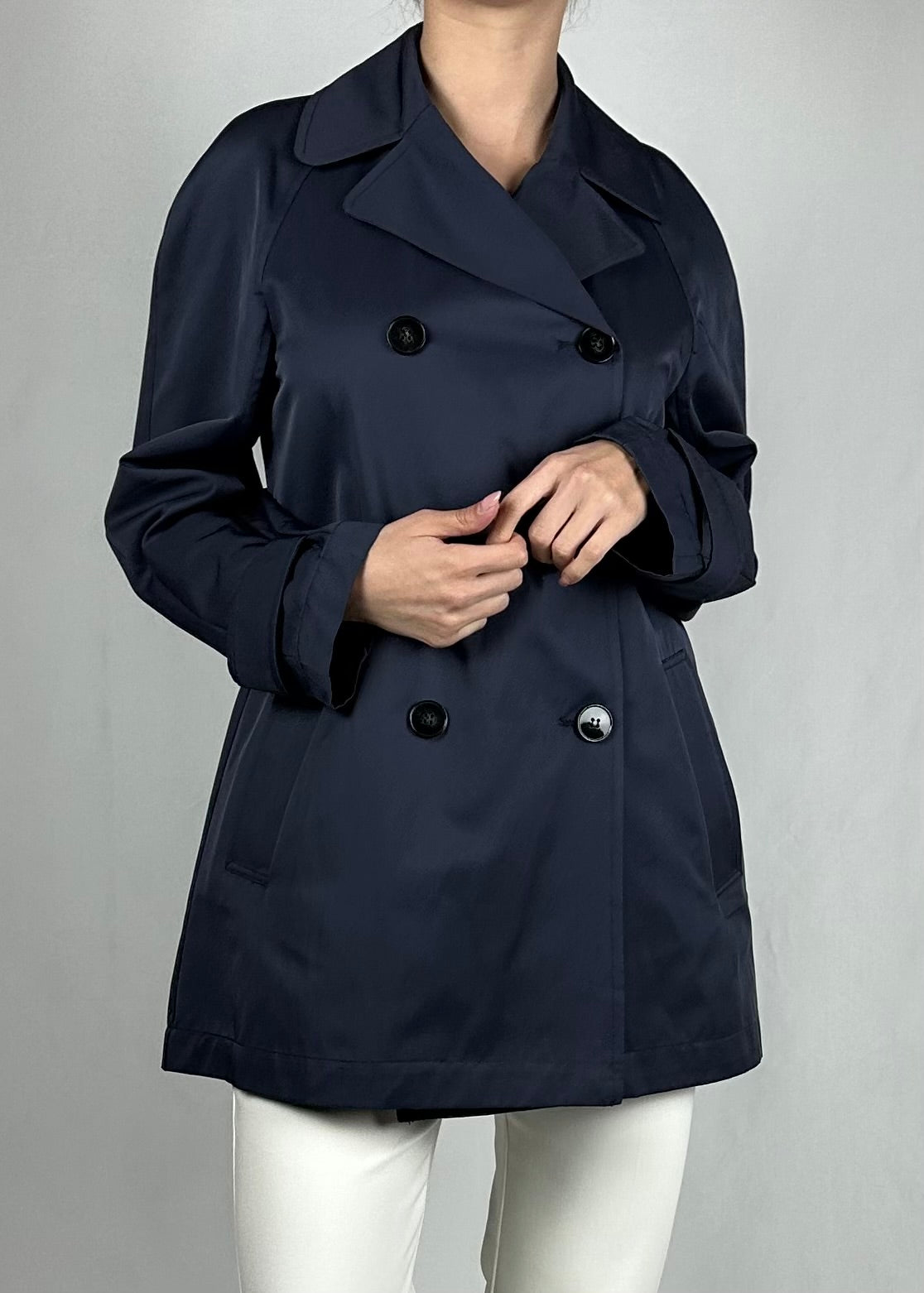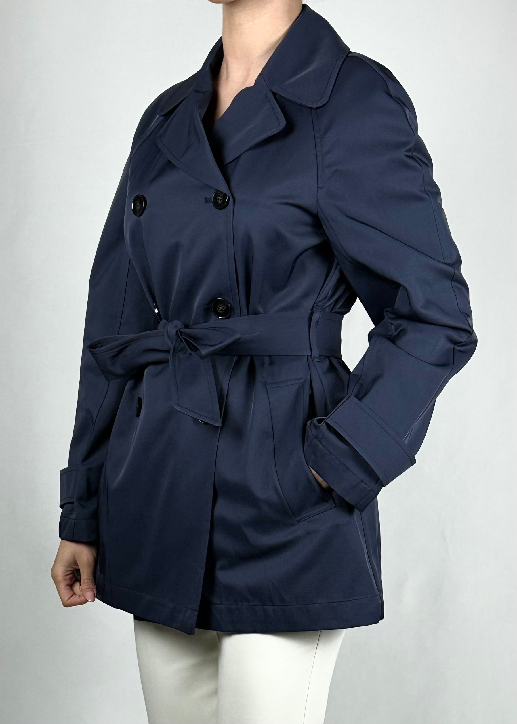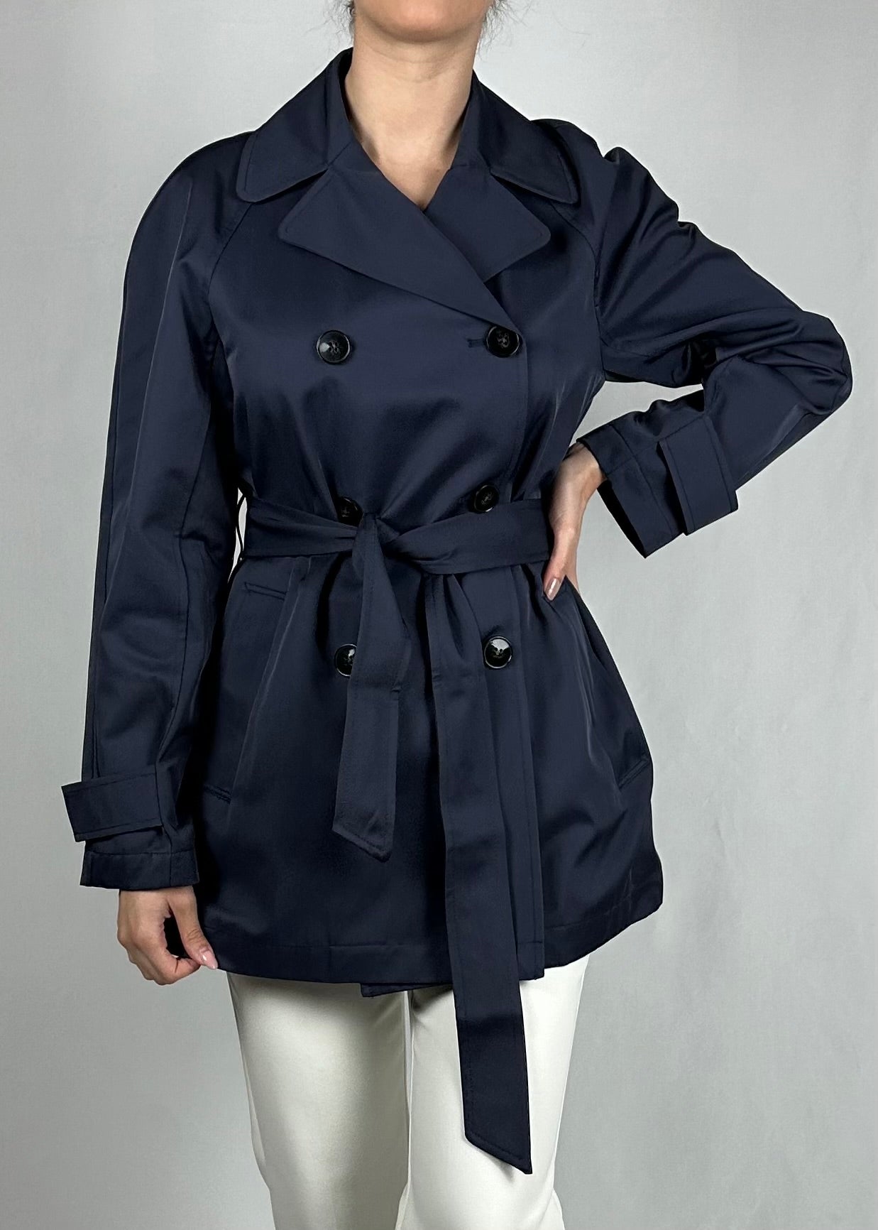 Trench corto in gabardine antigoccia, linea dritta con cintura, collo a rever, chiusura a doppiopetto, maniche lunghe con alamaro sul fondo, tasche a filetto.