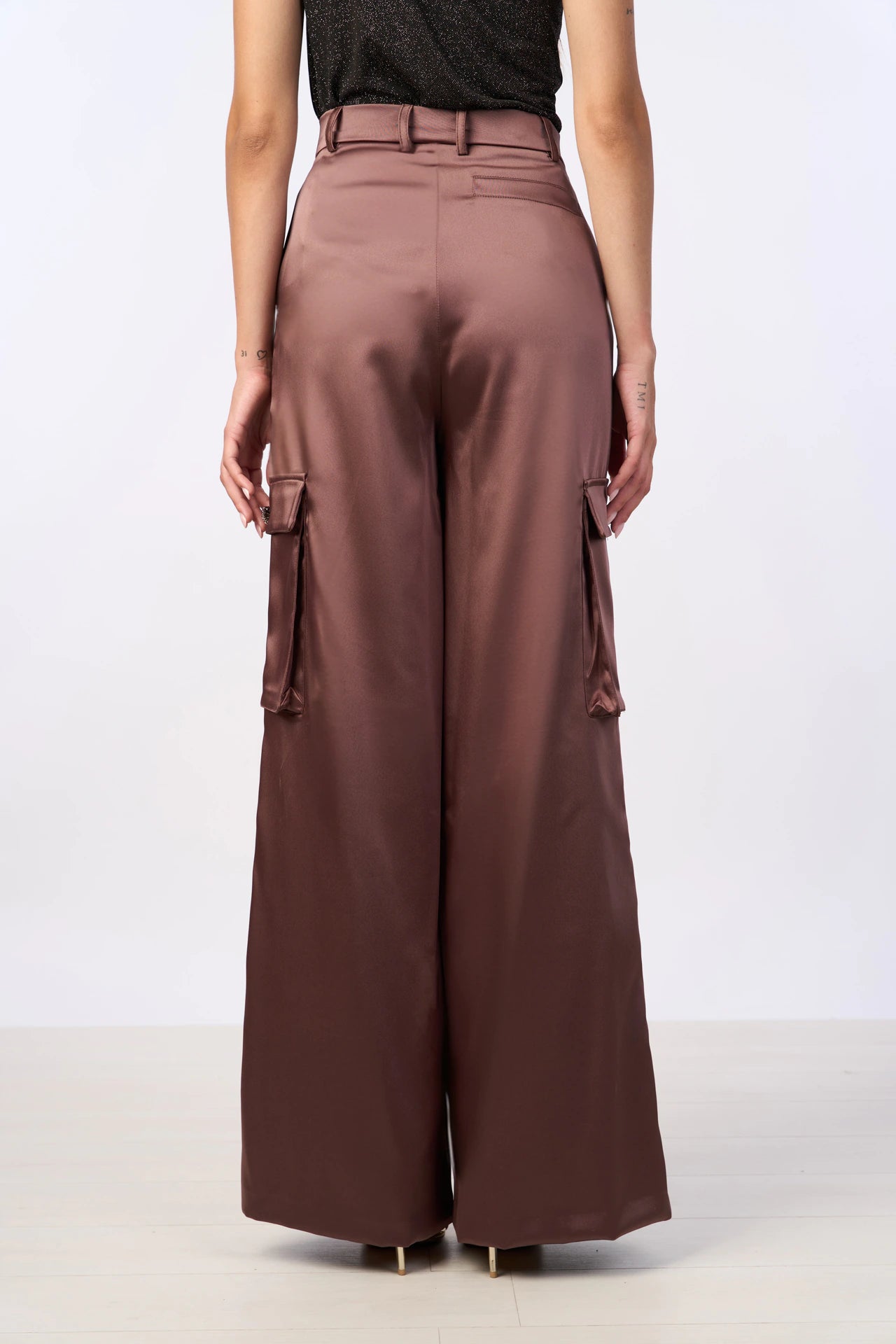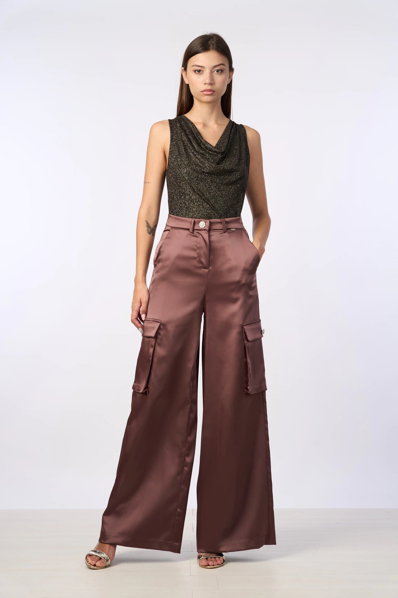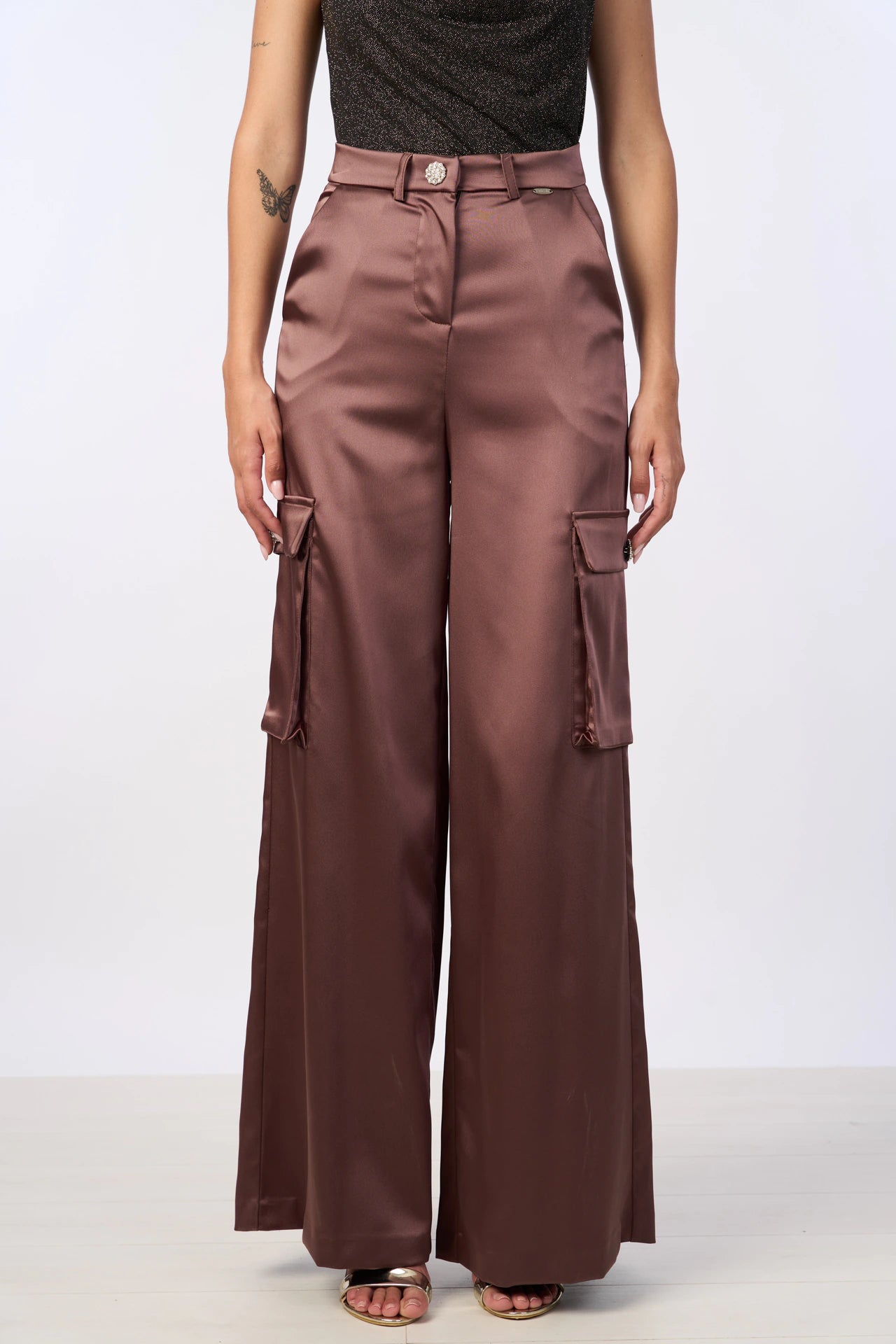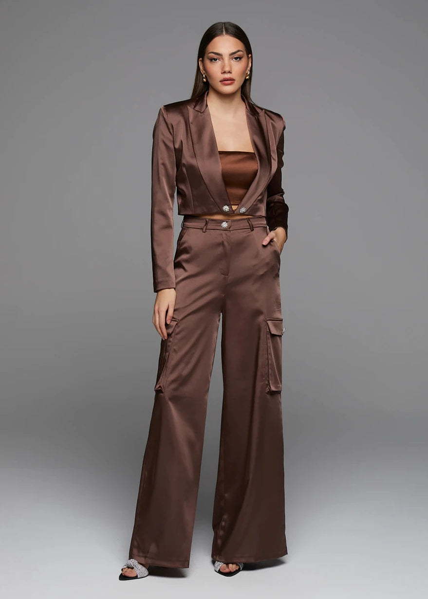 Pantalone marrone in raso dal taglio sartoriale, caratterizzato da un tessuto lucido e fluido che dona eleganza e raffinatezza. La chiusura è con bottone frontale, mentre i tasconi laterali sono impreziositi da bottoni gioiello decorati con piccoli diamantini, aggiungendo un tocco glamour al design. Il fit è morbido ma strutturato, perfetto per creare un look sofisticato e moderno. Ideale per occasioni formali o serate chic, questo pantalone si abbina perfettamente a bluse o camicie eleganti.