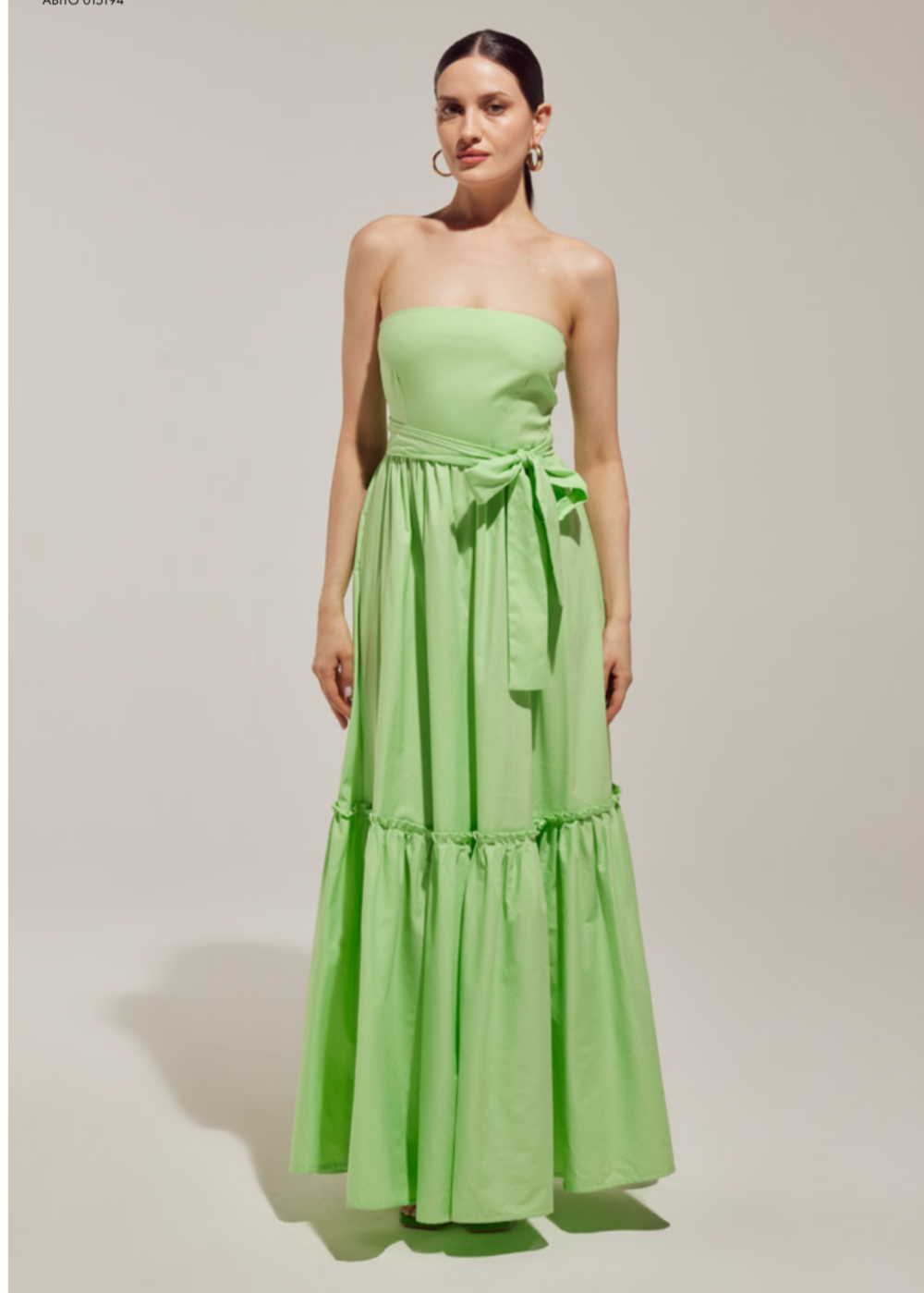 L'abito è di colore verde chiaro, realizzato in tessuto morbido e leggero. È un modello senza spalline con una scollatura semplice e pulita. La parte superiore è aderente al corpo, mentre la parte inferiore è ampia e fluente, con una gonna lunga che arriva fino al pavimento. L'abito è decorato con una cintura che si annoda sul fianco, creando una linea elegante e definita in vita. La parte inferiore dell'abito è arricciata con un dettaglio di balze, che conferisce movimento e fluidità al vestito. È un abito estivo, fresco e elegante, perfetto per eventi casual o serate estive.