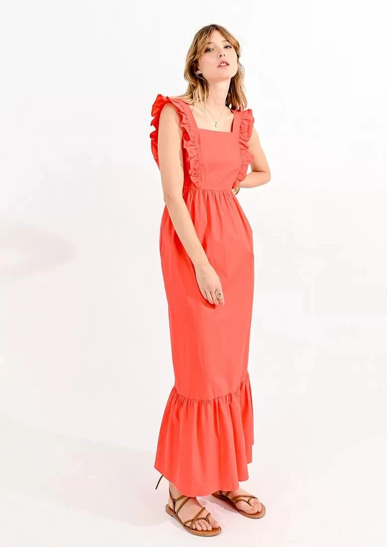 Grande cotta! Siamo affascinati da questo abito che mostra delicatamente la sua ultrafemminilità con le sue spalline arricciate. Abito lungo in cotone, ampia fascia con volant al fondo e scollo quadrato. Lunghezza: 135 cm Taglia S