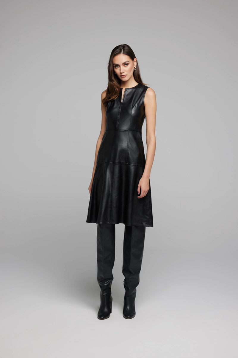Eleva il tuo stile con questo abito longuette smanicato in ecopelle nera, un capo audace e sofisticato, perfetto per la donna che non ha paura di distinguersi. La vestibilità aderente sul corpetto si apre in una gonna a campana, creando una silhouette slanciata e femminile. Le cuciture a vista valorizzano il design, mentre il tessuto similpelle aggiunge un tocco di grinta e modernità. Questo abito è la scelta ideale per un’occasione speciale o un evento serale, abbinato a scarpe con il tacco e accessori minimali. Per un look più casual, si può indossare con stivali bassi e una giacca in denim.