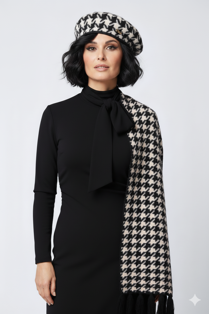 Cappello bicolore in contrasto bianco e nero con dettagli in piede di poule. Questo accessorio combina eleganza classica e versatilità, perfetto per completare look sofisticati. La trama a piede di poule aggiunge texture e profondità al design, mentre la combinazione cromatica garantisce abbinamenti facili con il vostro guardaroba. Ideale per chi ricerca un copricapo che unisce stile tradizionale e contemporaneo.