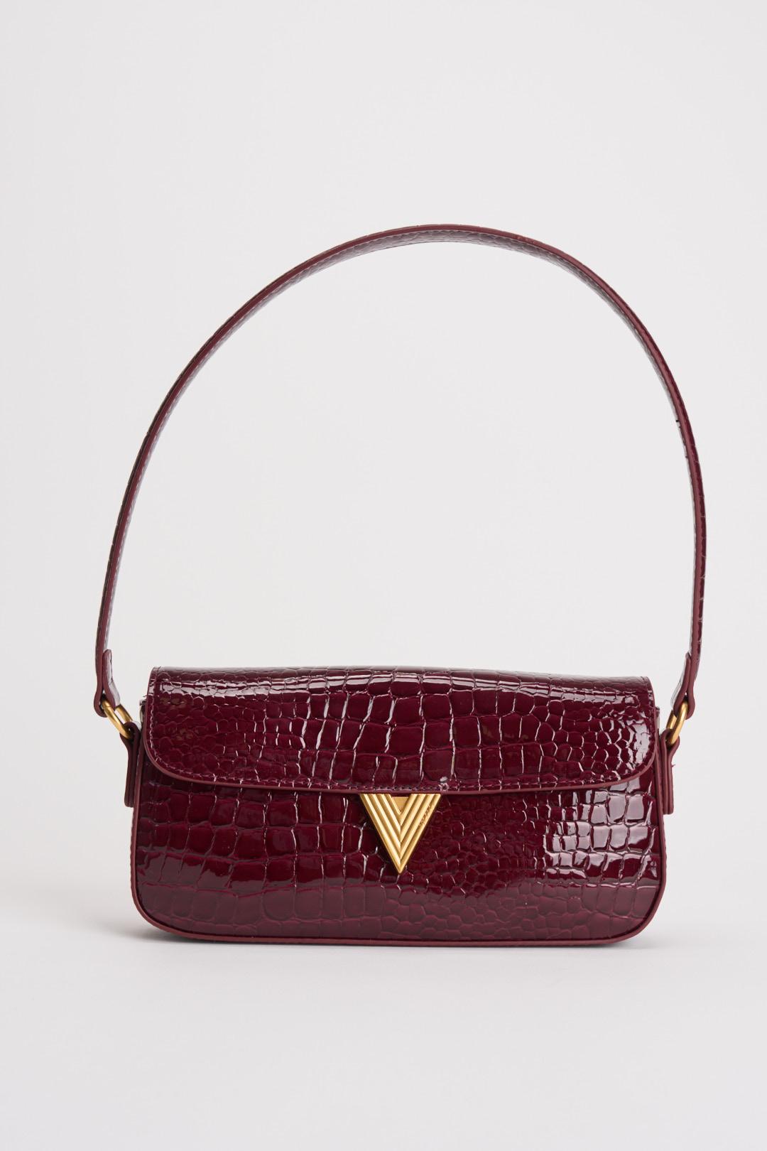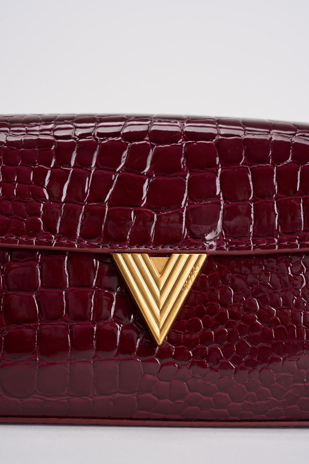 Borsa Pencil a spalla in ecopelle effetto "coco" in vernice . Tracolla in similpelle rigida. Chiusura con bottone a pressione con calamita. Dettaglio logo metal plate Vicolo. Finiture anticate color oro. Tasca interna con cerniera e taschina piatta.