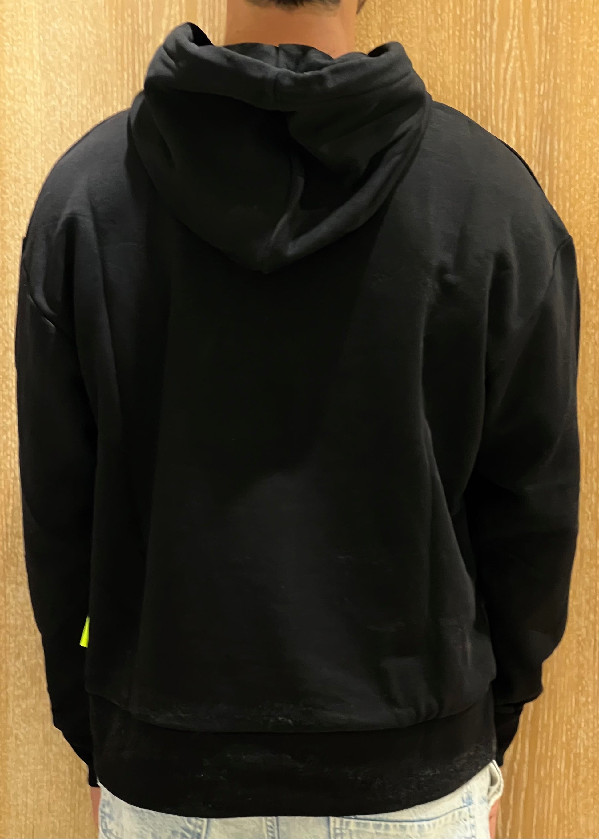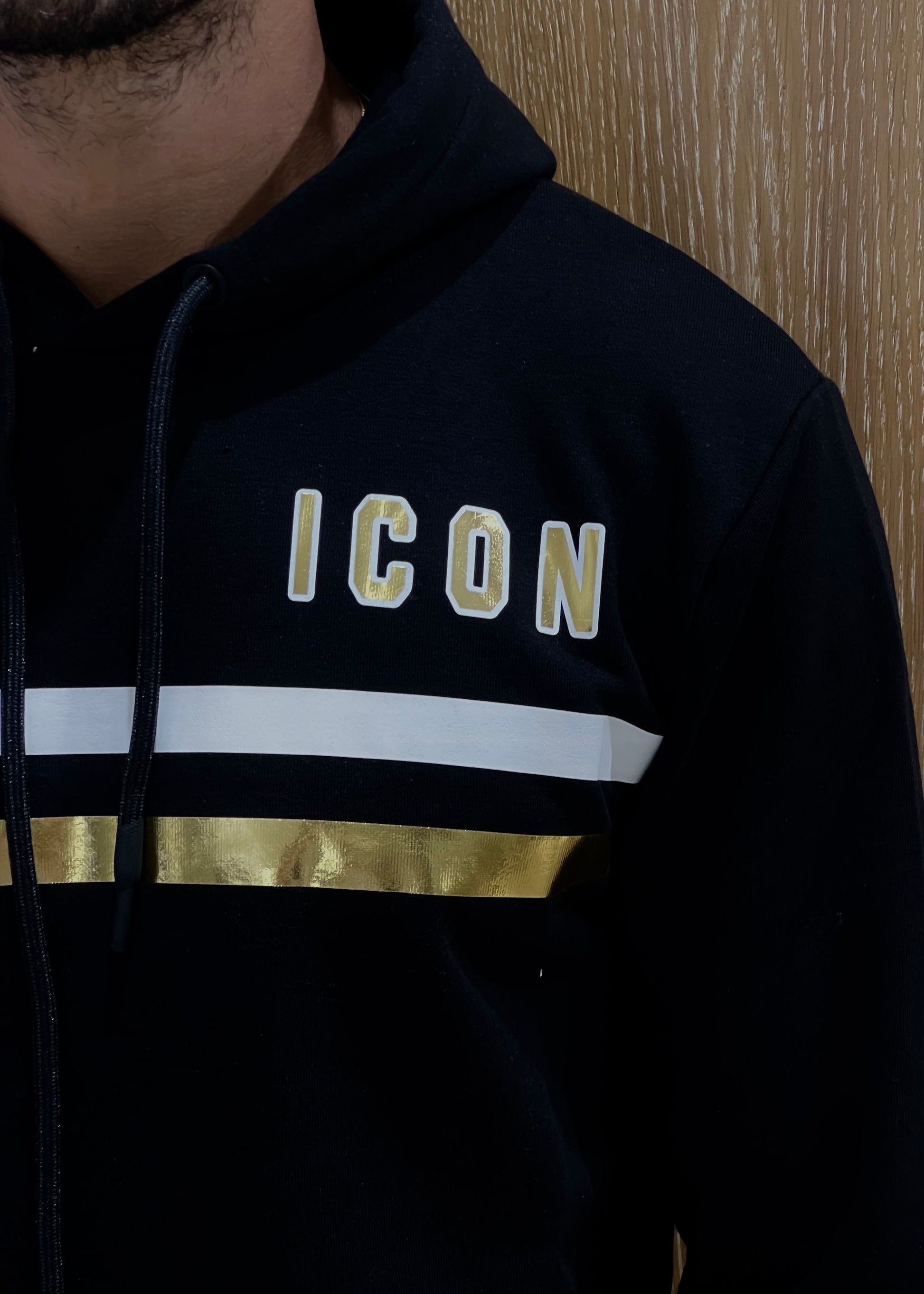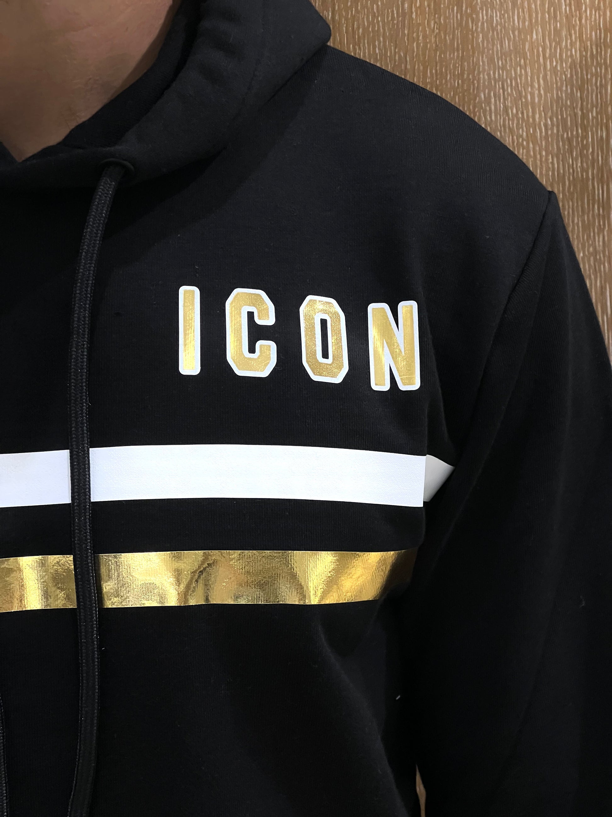 Felpa nero con cappuccio e bande oro e bianco lucide con scritta icon.