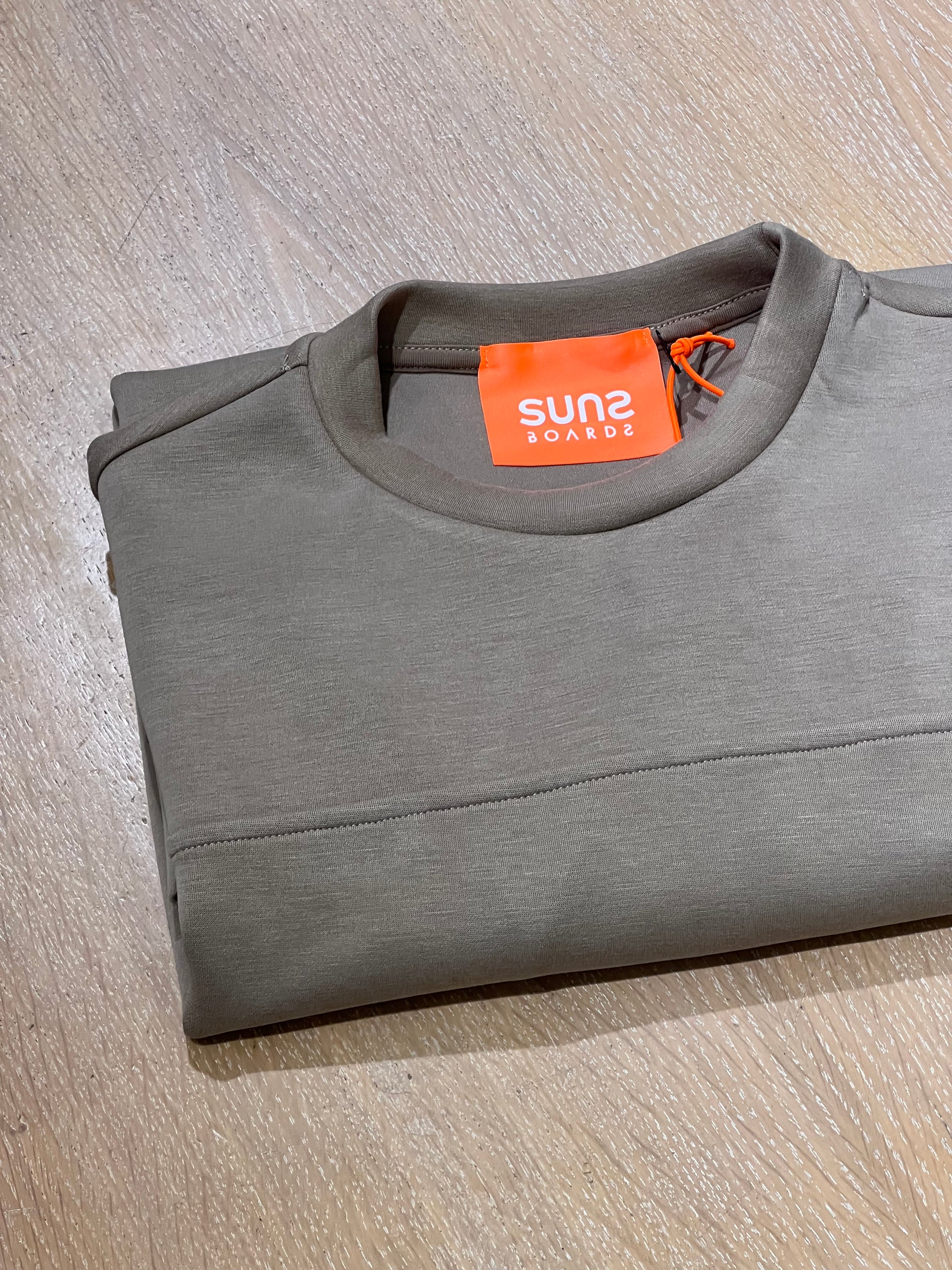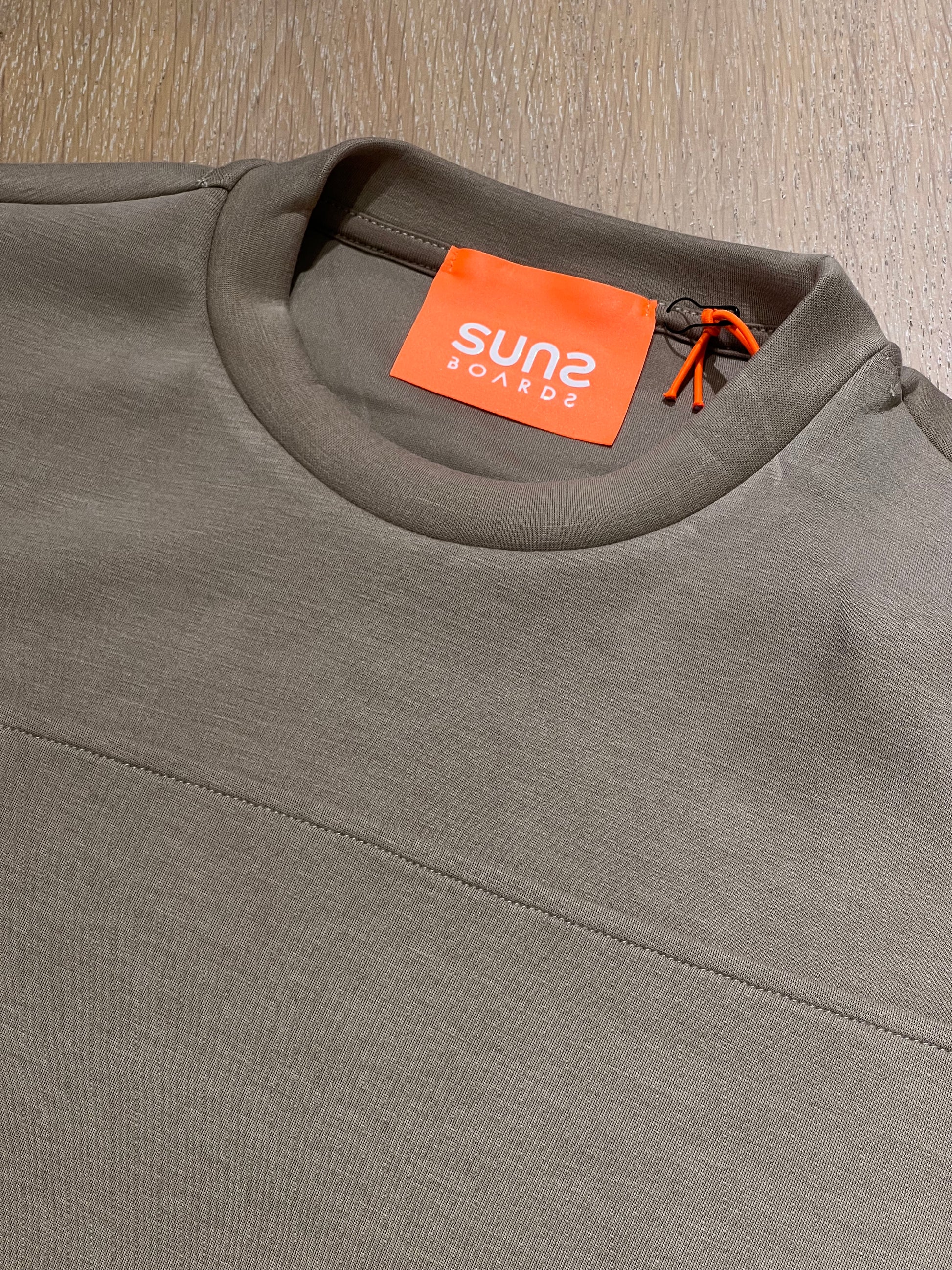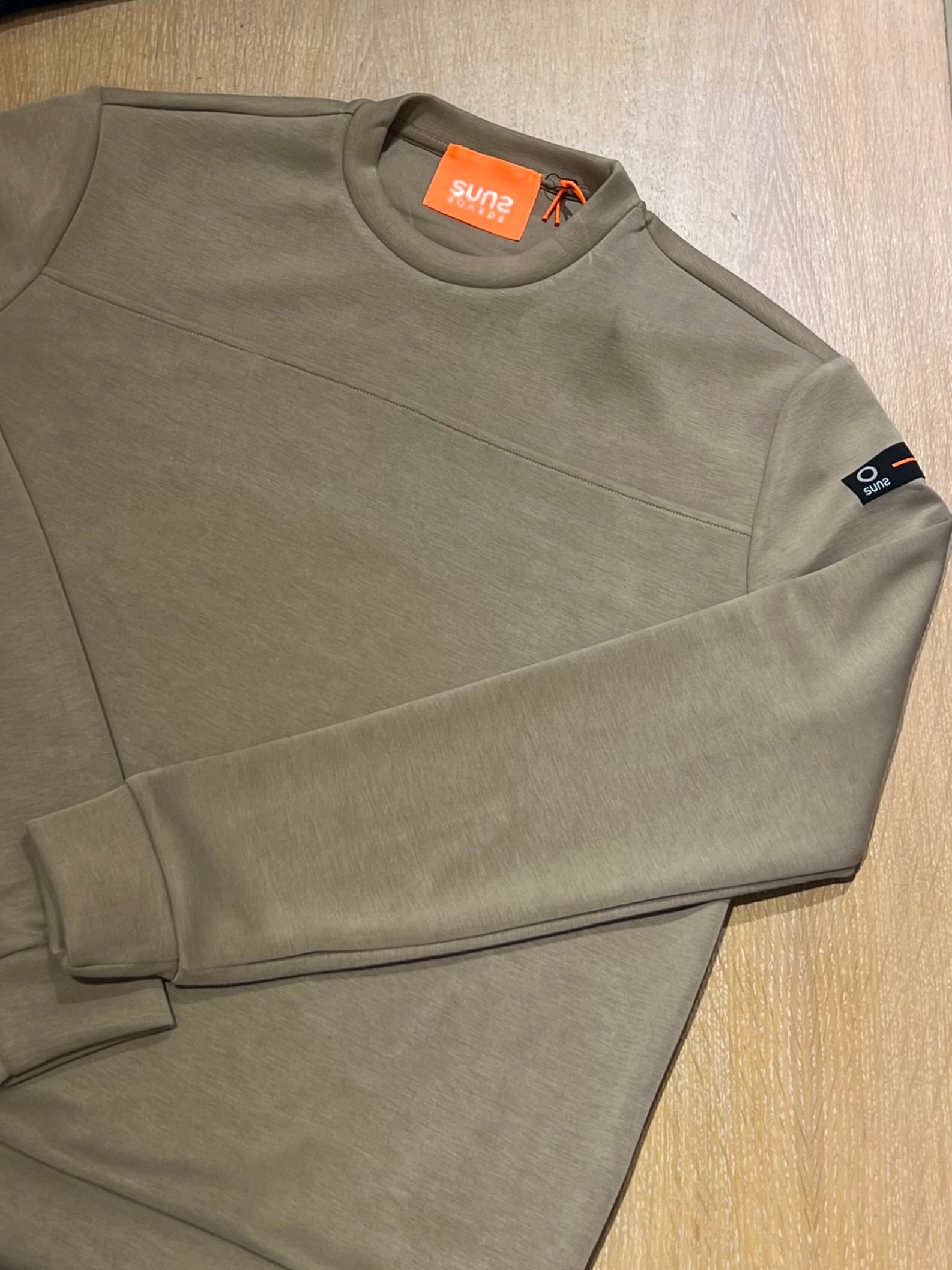 Una felpa girocollo da uomo dal design pulito e contemporaneo, ideale per ogni momento della giornata. Realizzata in jersey elasticizzato a mano morbida, garantisce massimo comfort e libertà nei movimenti. Il taglio carrè frontale aggiunge struttura al capo, mentre i polsi e fondo realizzati nello stesso tessuto assicurano una vestibilità armoniosa. Il parasutore interno arancio fluo e la pinnetta arancione in silicone aggiungono un tocco distintivo. Completano il look il logo Suns patch sul braccio e la tonalità beige versatile, perfetta per la mezza stagione.