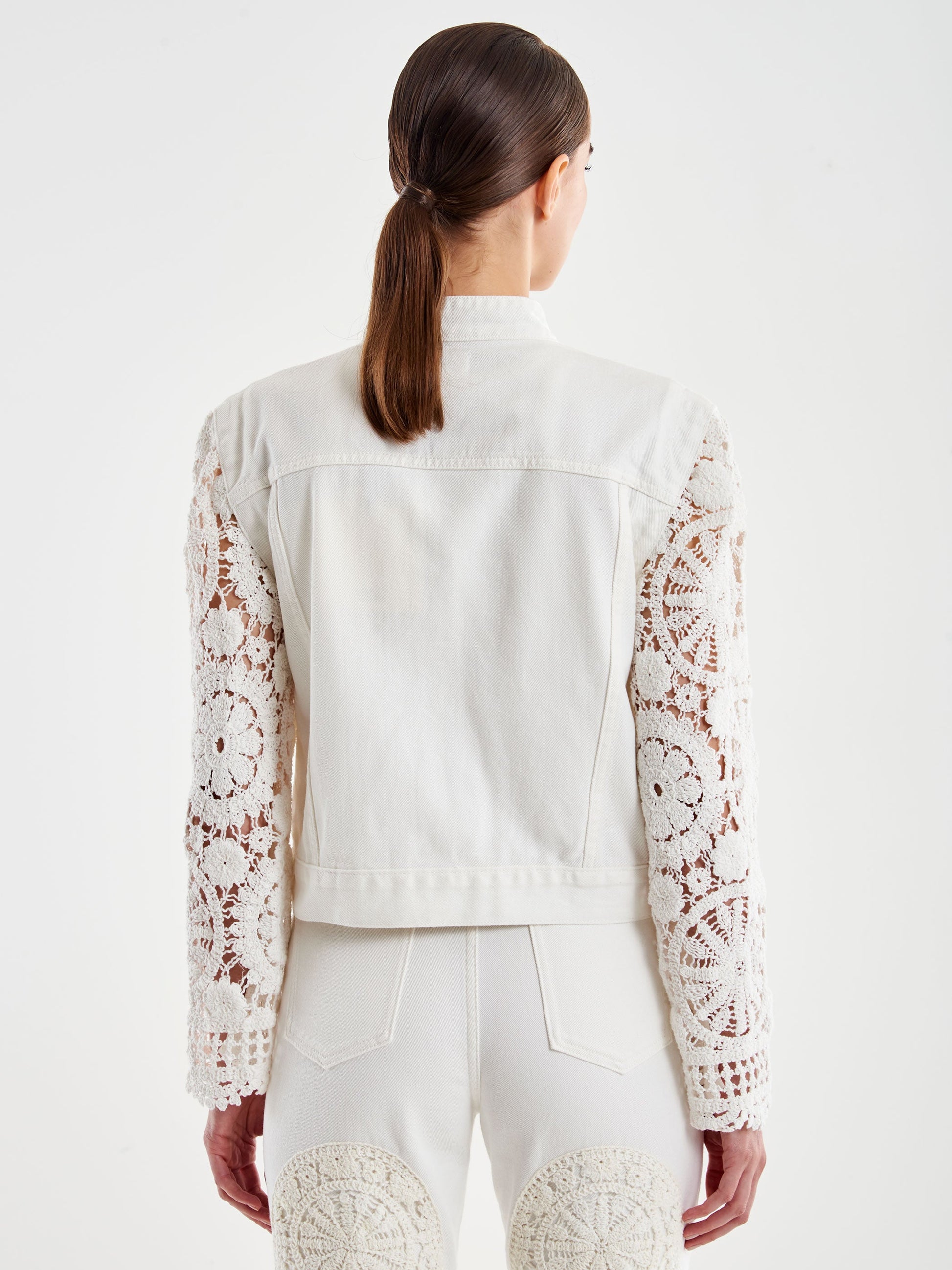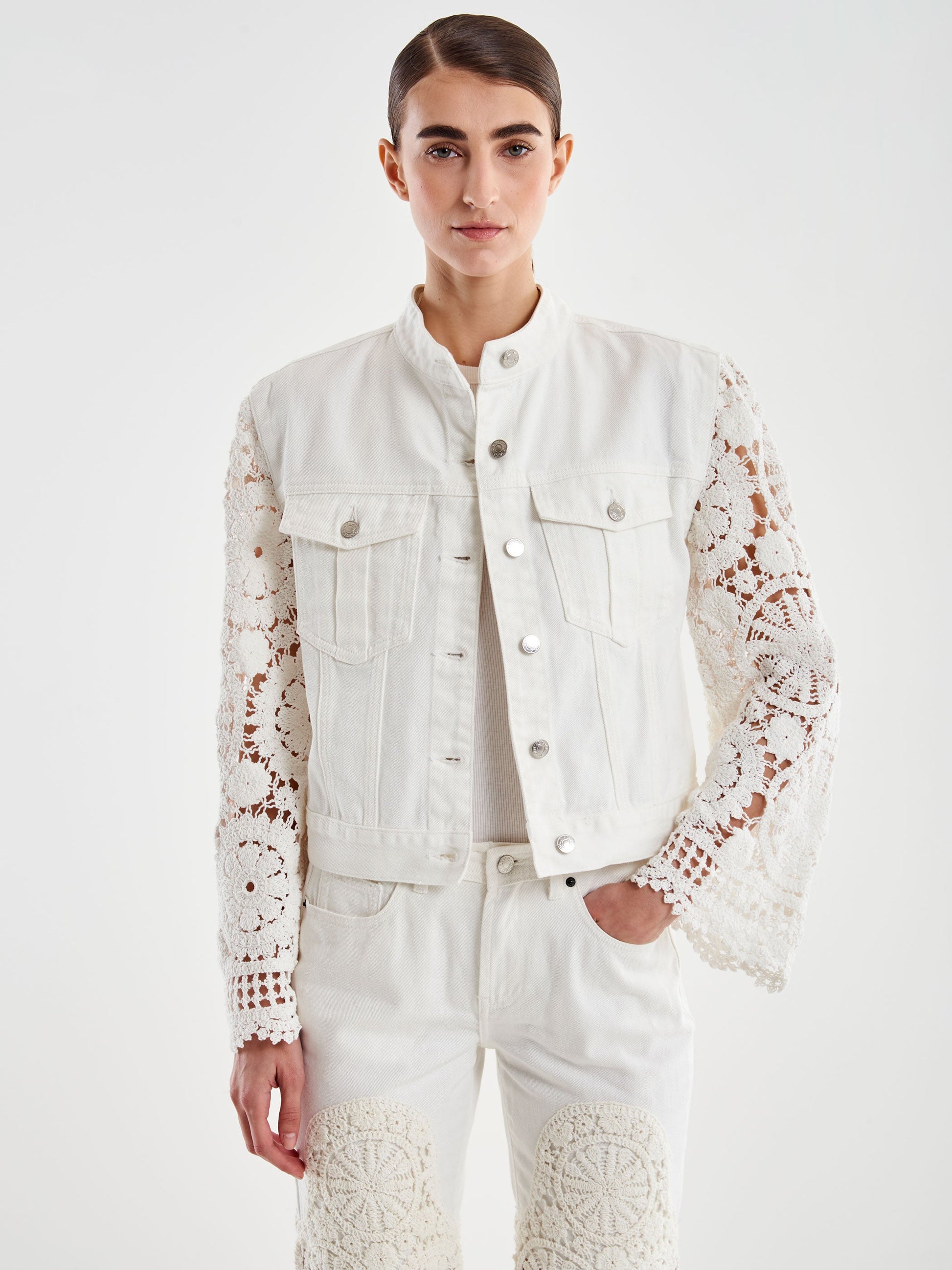 Giacca in denim collo alla coreana. Dettaglio maniche macramè. Chiusura frontale con bottoni in metallo. Tasche sul petto a pattina con bottone.