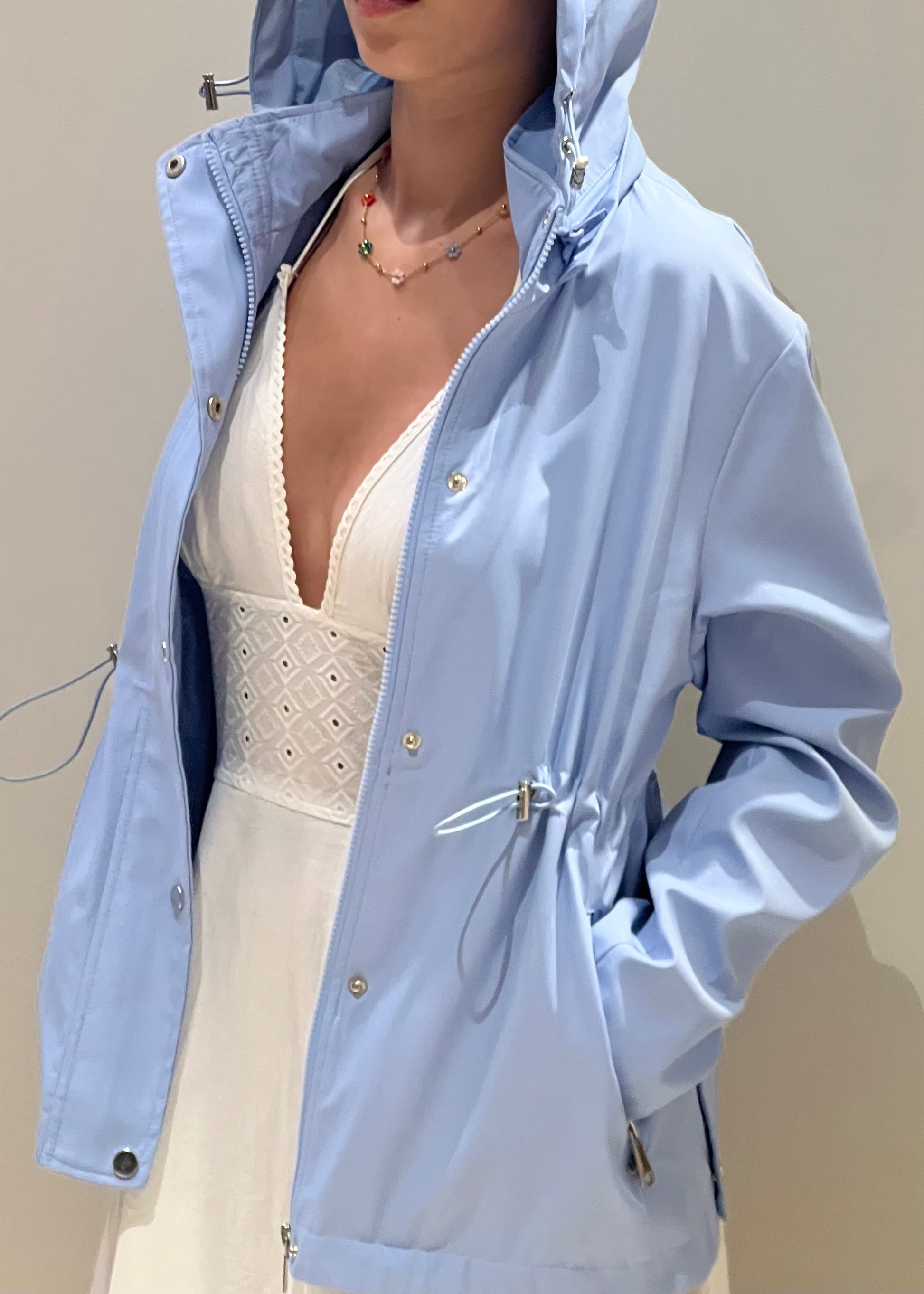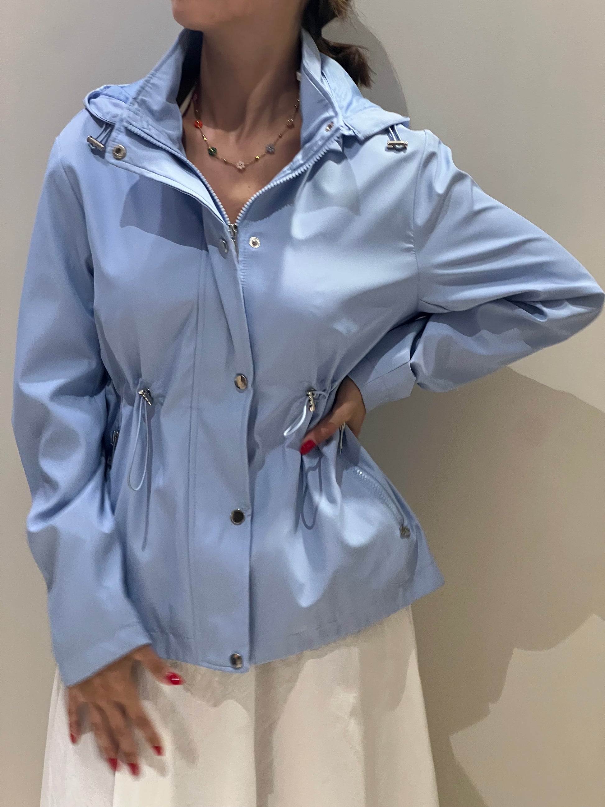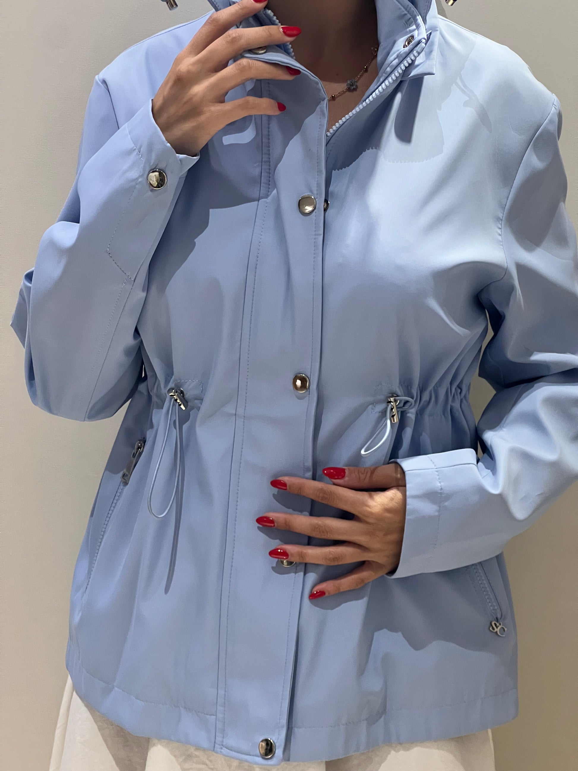 Giacca corta disponibile nei colori azzurro pastello e panna, perfetta per la mezza stagione. Dotata di cappuccio, chiusura frontale con zip e bottoni a pressione. La coulisse in vita consente di regolare la vestibilità e valorizzare la silhouette. Tasche laterali con zip e dettagli in metallo completano il design pratico e femminile.