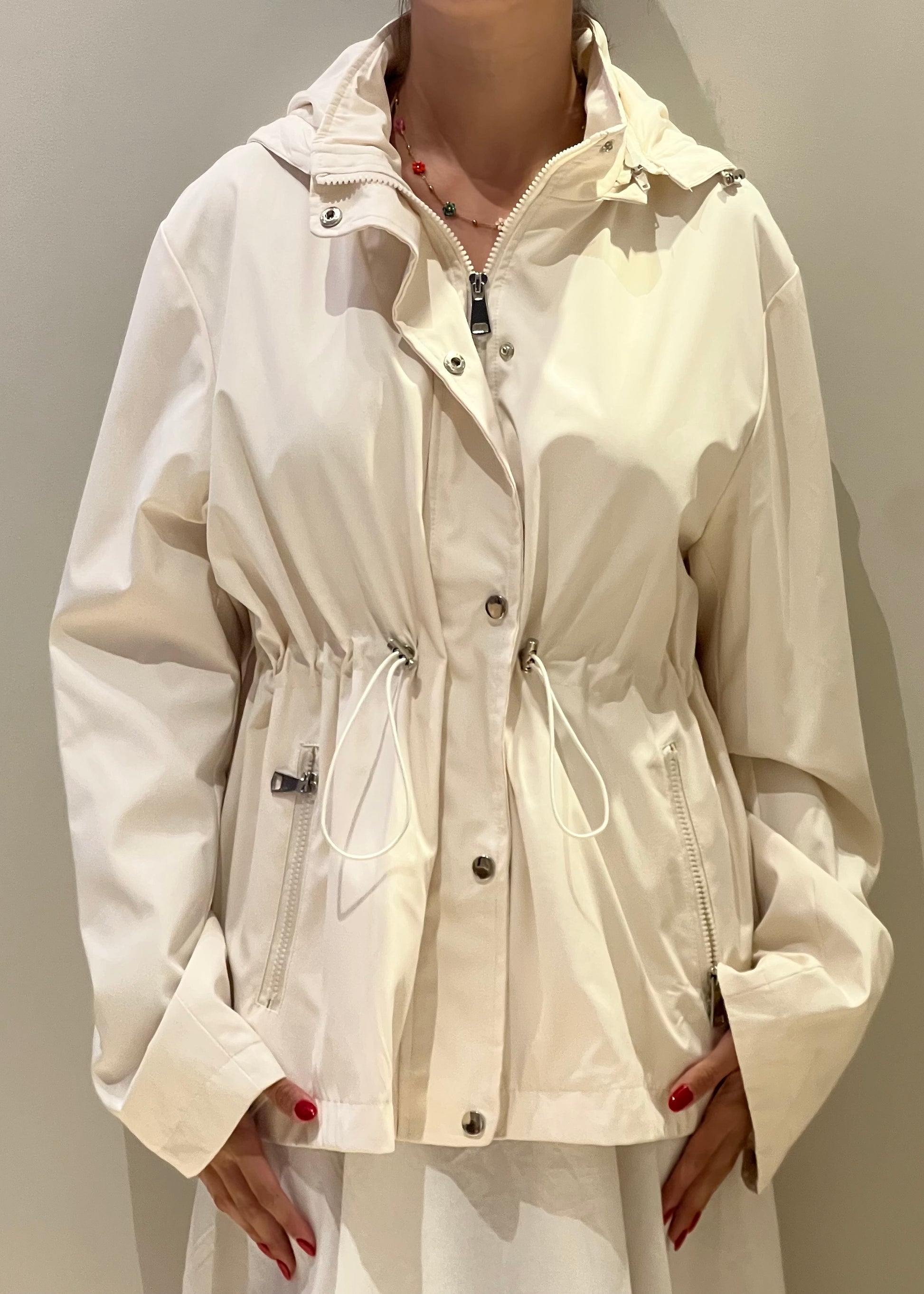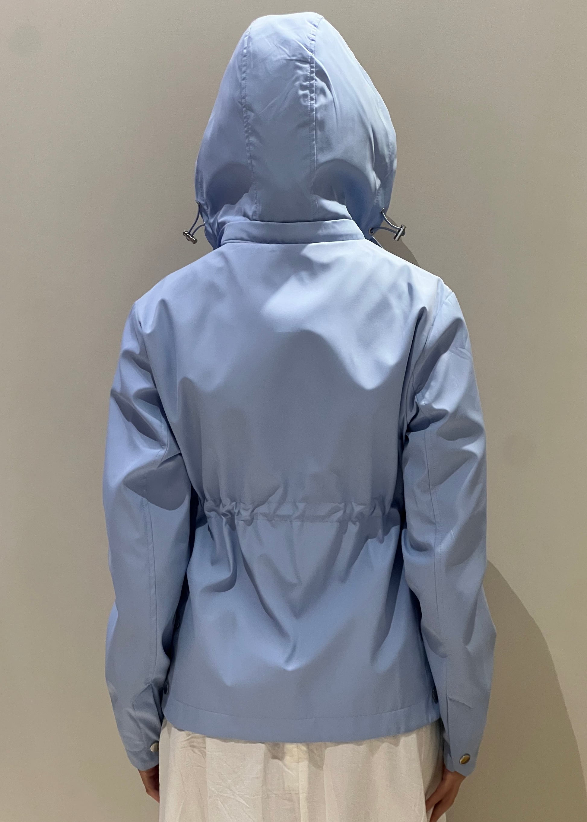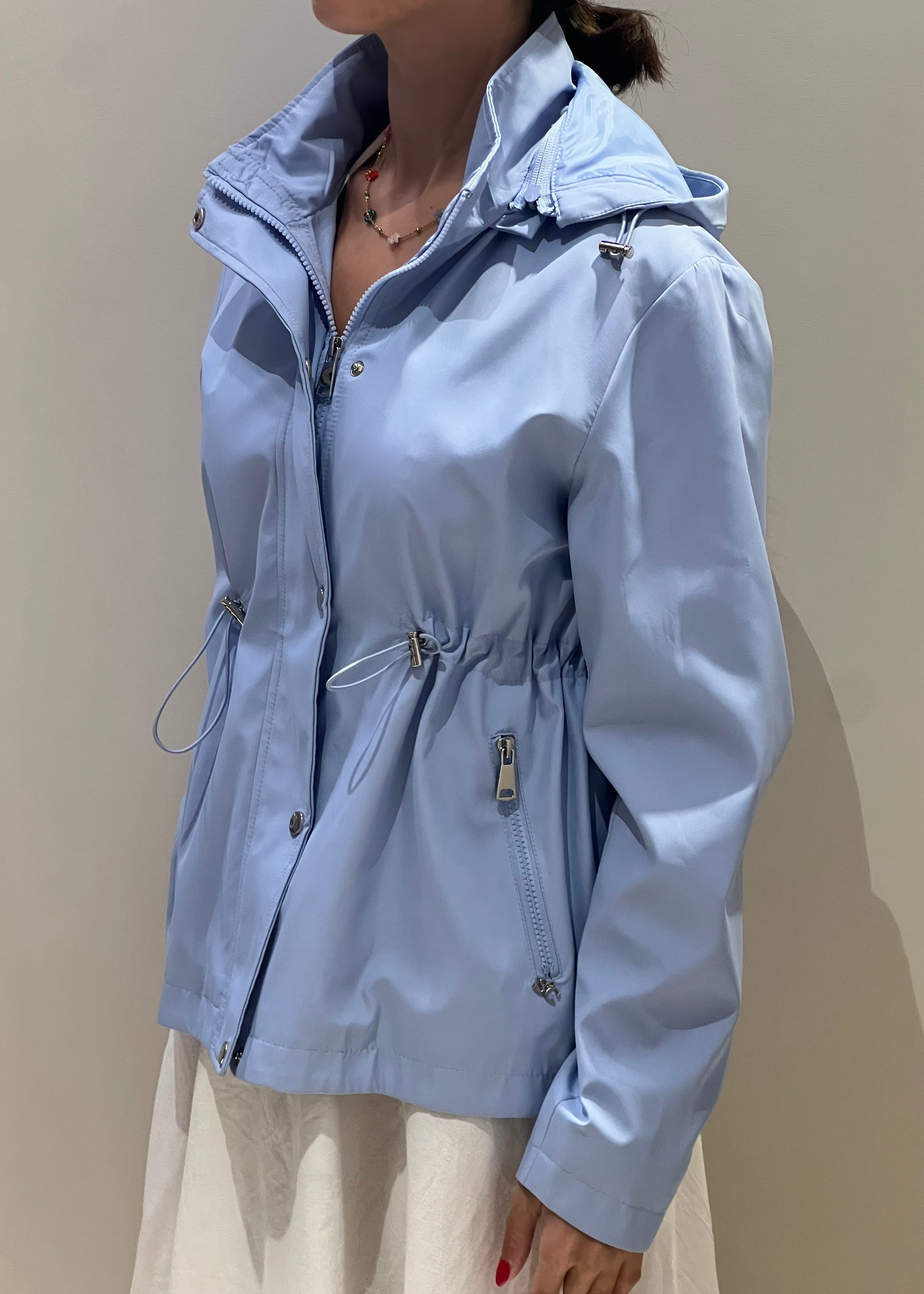 Giacca corta disponibile nei colori azzurro pastello e panna, perfetta per la mezza stagione. Dotata di cappuccio, chiusura frontale con zip e bottoni a pressione. La coulisse in vita consente di regolare la vestibilità e valorizzare la silhouette. Tasche laterali con zip e dettagli in metallo completano il design pratico e femminile.