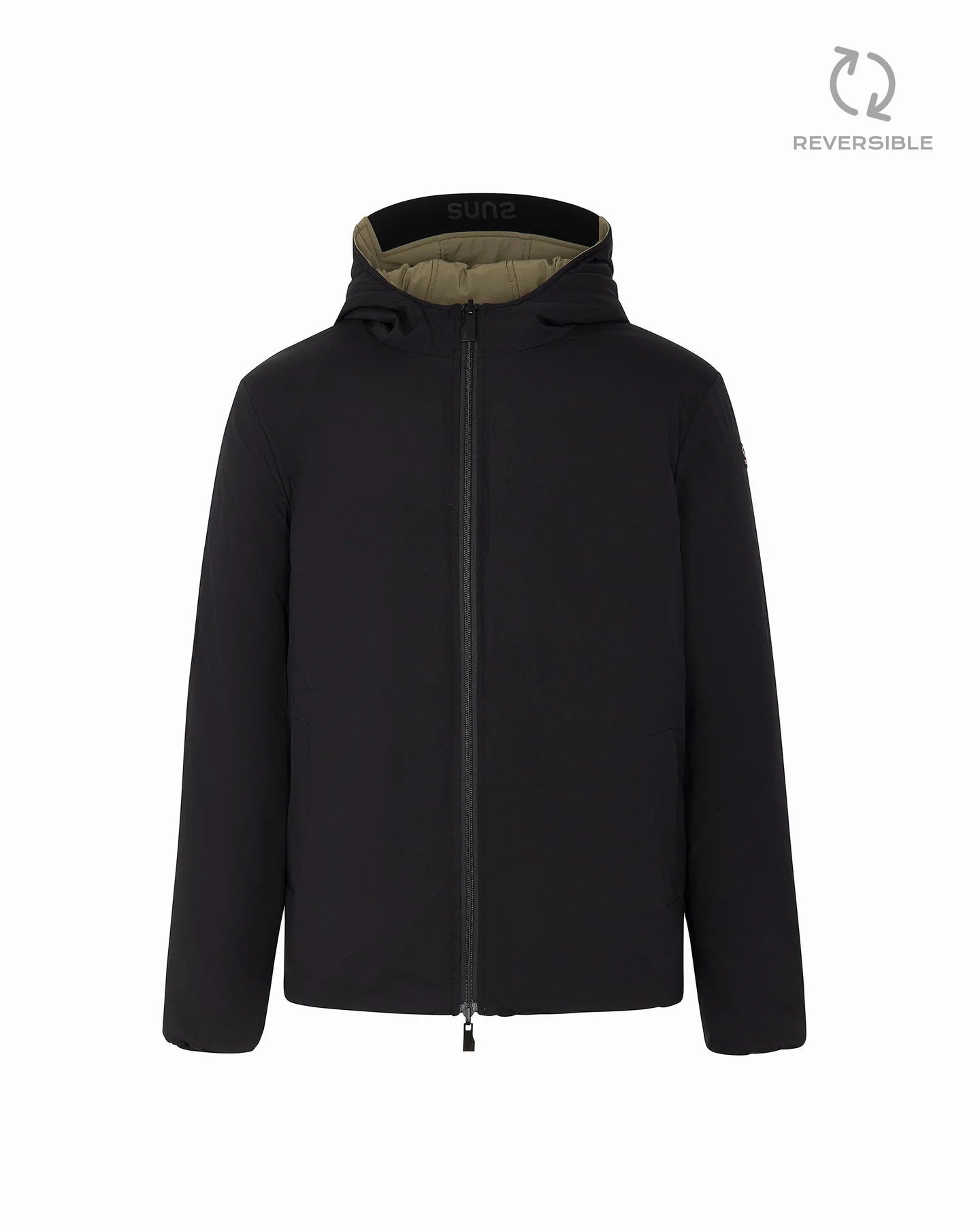 Giubbotto reversibile da uomo pensato per offrire comfort, protezione e stile durante l’inverno. Il tessuto in nylon tecnico garantisce resistenza e leggerezza, mentre il design double-face consente di variare il look a seconda delle esigenze. Il cappuccio fisso protegge efficacemente dal vento ed è impreziosito da un inserto in gomma con logo Suns applicato sul retro. Dotato di zip waterproof con doppio cursore e tasche laterali con chiusura a zip su entrambi i lati, questo modello unisce funzionalità e design contemporaneo. L’imbottitura leggera è ideale per affrontare le basse temperature mantenendo una vestibilità comoda.