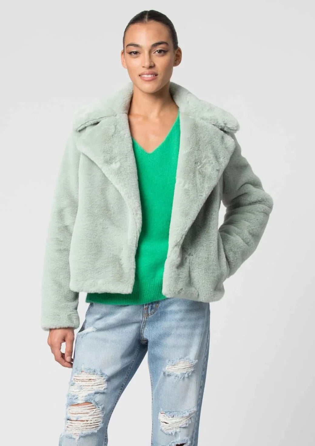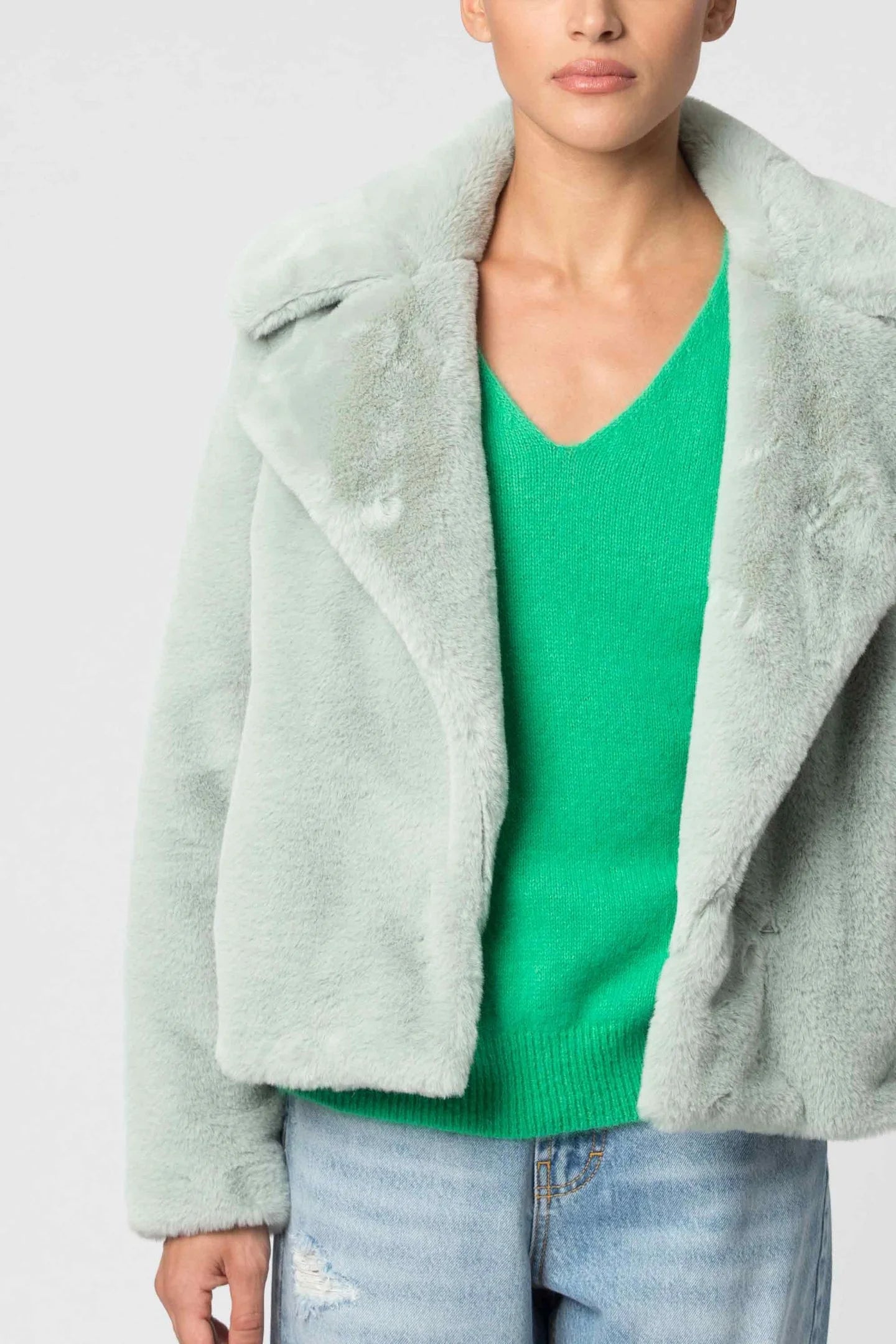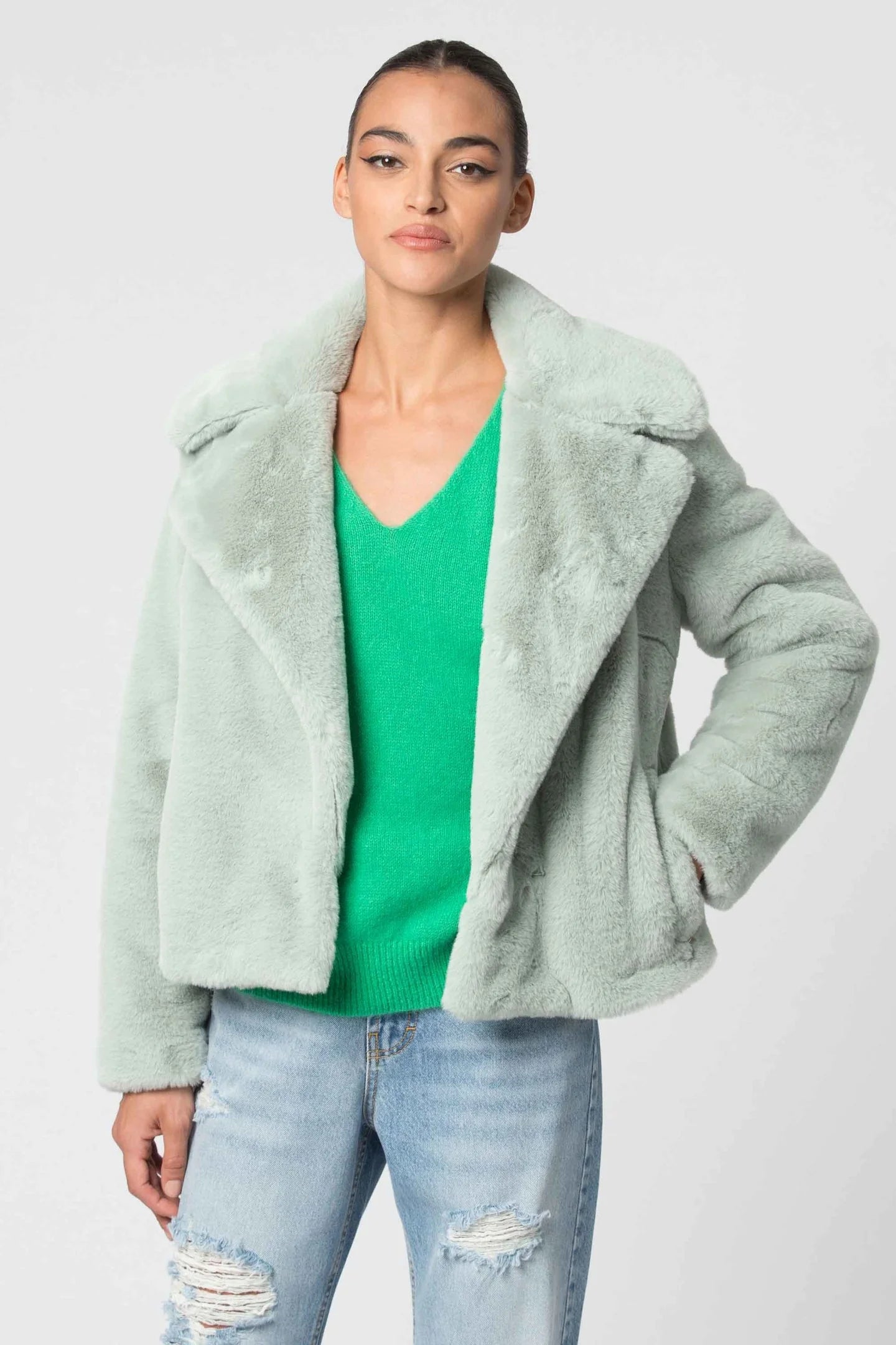Giubbotto corto con ampio colletto a rever in morbidissima ecopelliccia. Tasche invisibili e abbottonatura nascosta. Da indossare a casa o all’aperto ogni volta che hai voglia di coccolarti con un soffice abbraccio. Declinabile in versione sportiva o smart casual, si adatta splendidamente a qualsiasi occasione.