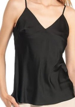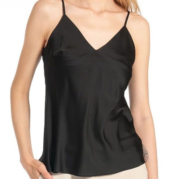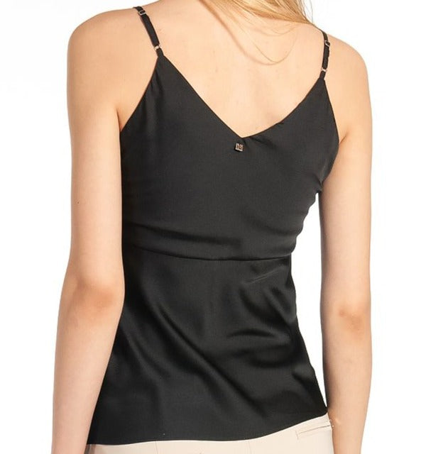 Elegante top con spalline sottili realizzato in tessuto fresco tinta unita. La linea è svasata per una vestibilità che regala comfort e praticità. Indossalo infilato dentro a un paio di pantaloni a sigaretta per un effetto blusante e very chic.