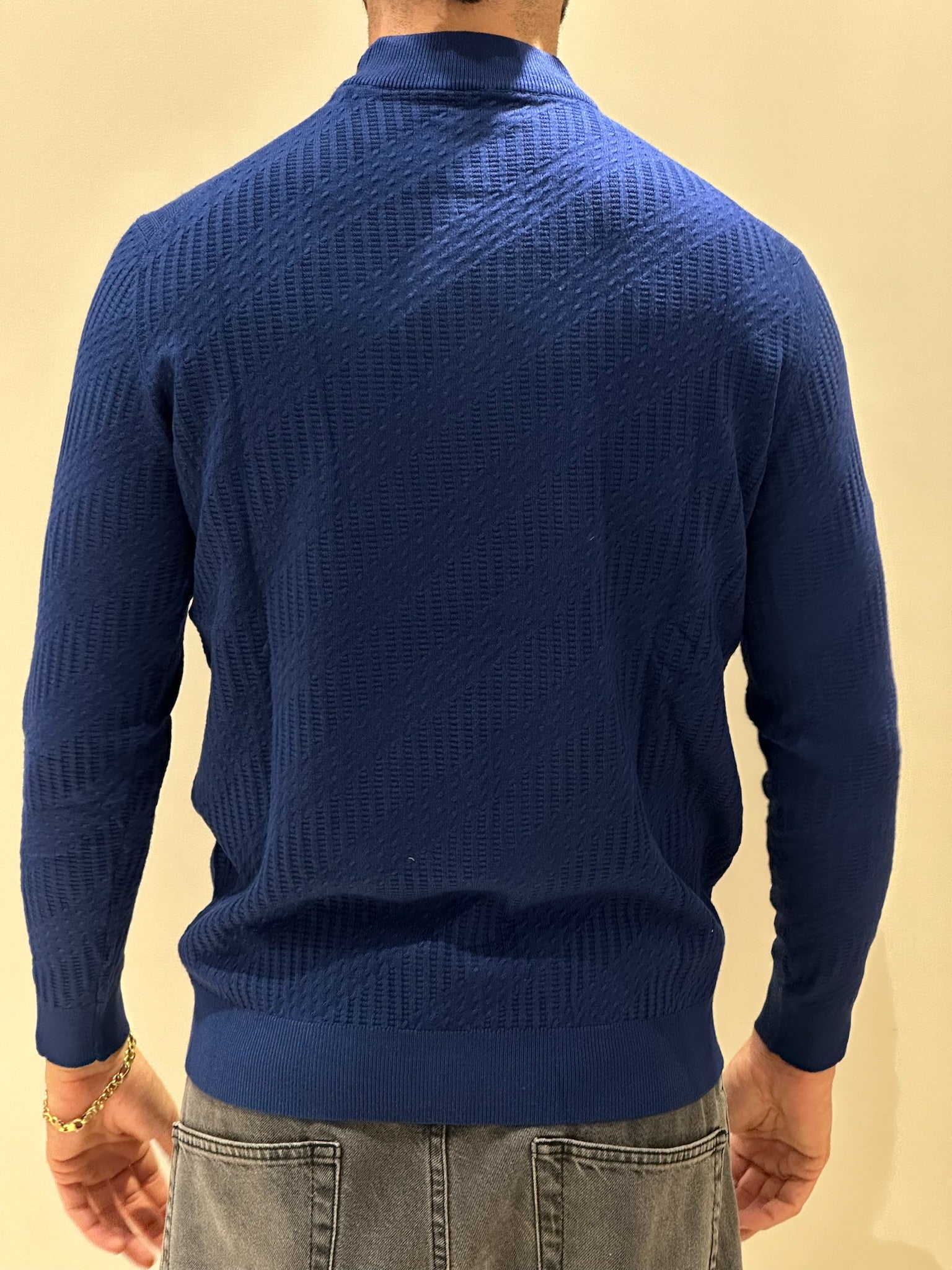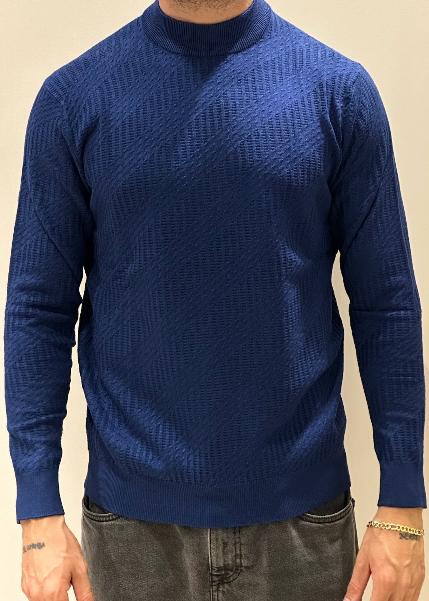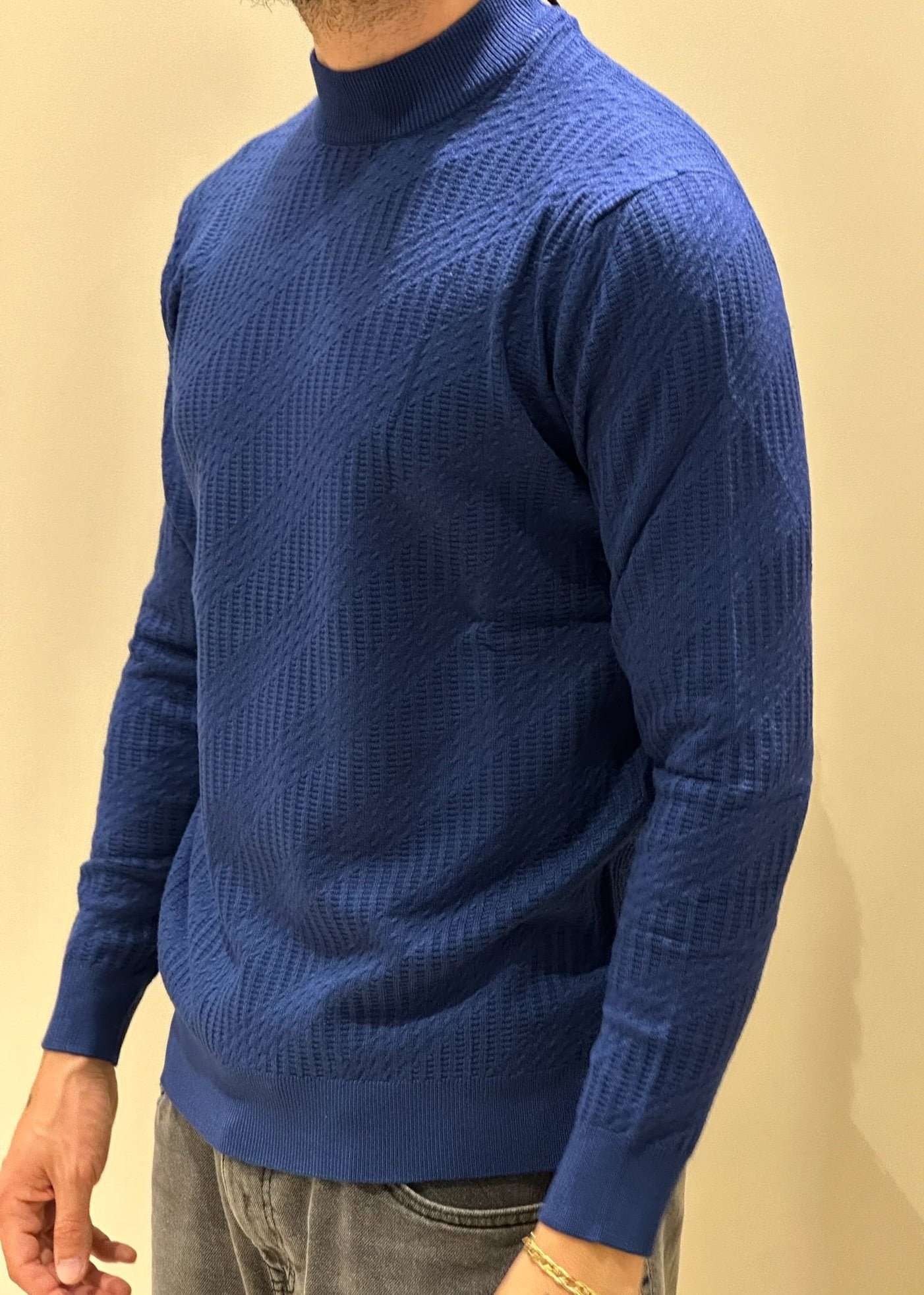 Lupetto blu da uomo, perfetto per un look elegante e raffinato. Realizzato in tessuto morbido e confortevole, questo capo si adatta perfettamente alla silhouette, donando un tocco di classe senza rinunciare alla comodità. Il colletto alto aggiunge un elemento sofisticato, ideale da indossare sotto una giacca o da solo per un look più disinvolto. Un must-have per chi desidera uno stile impeccabile in ogni occasione, sia formale che casual chic.
