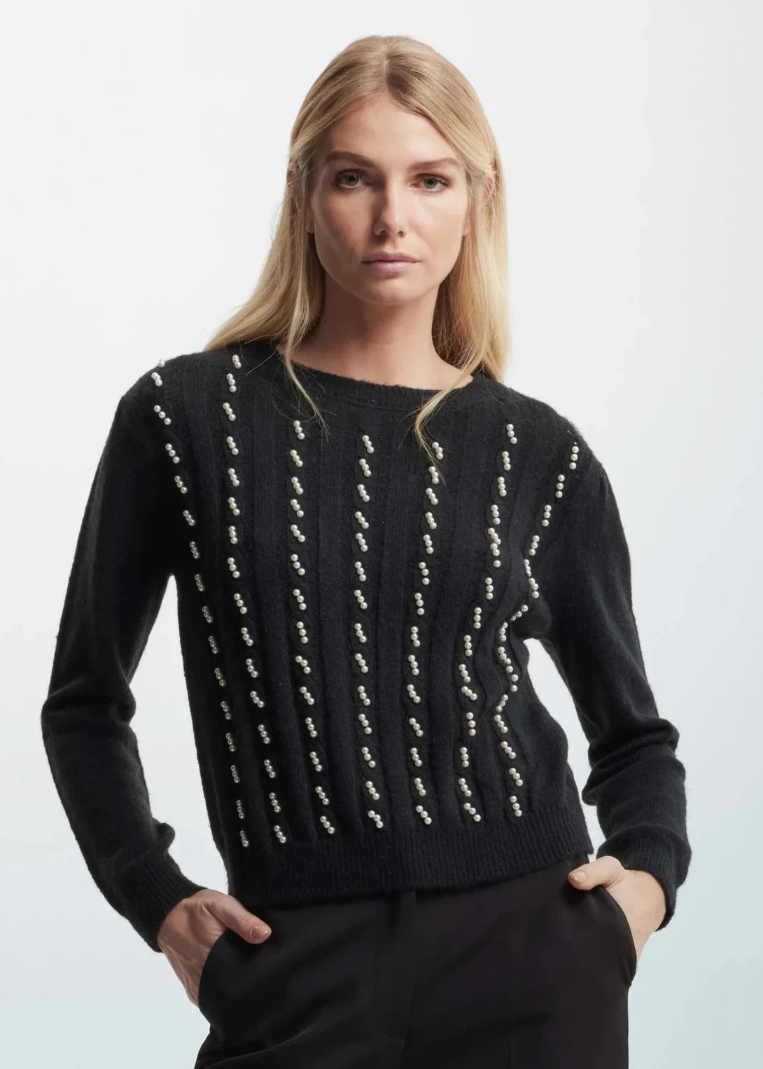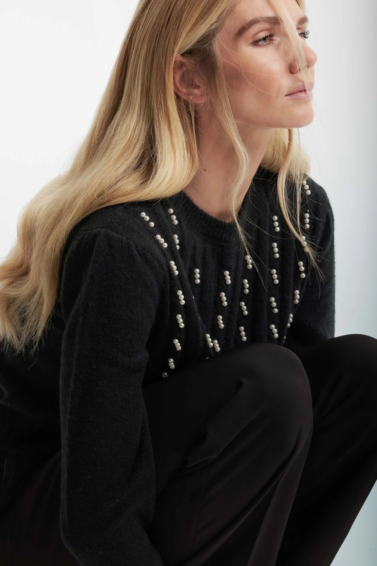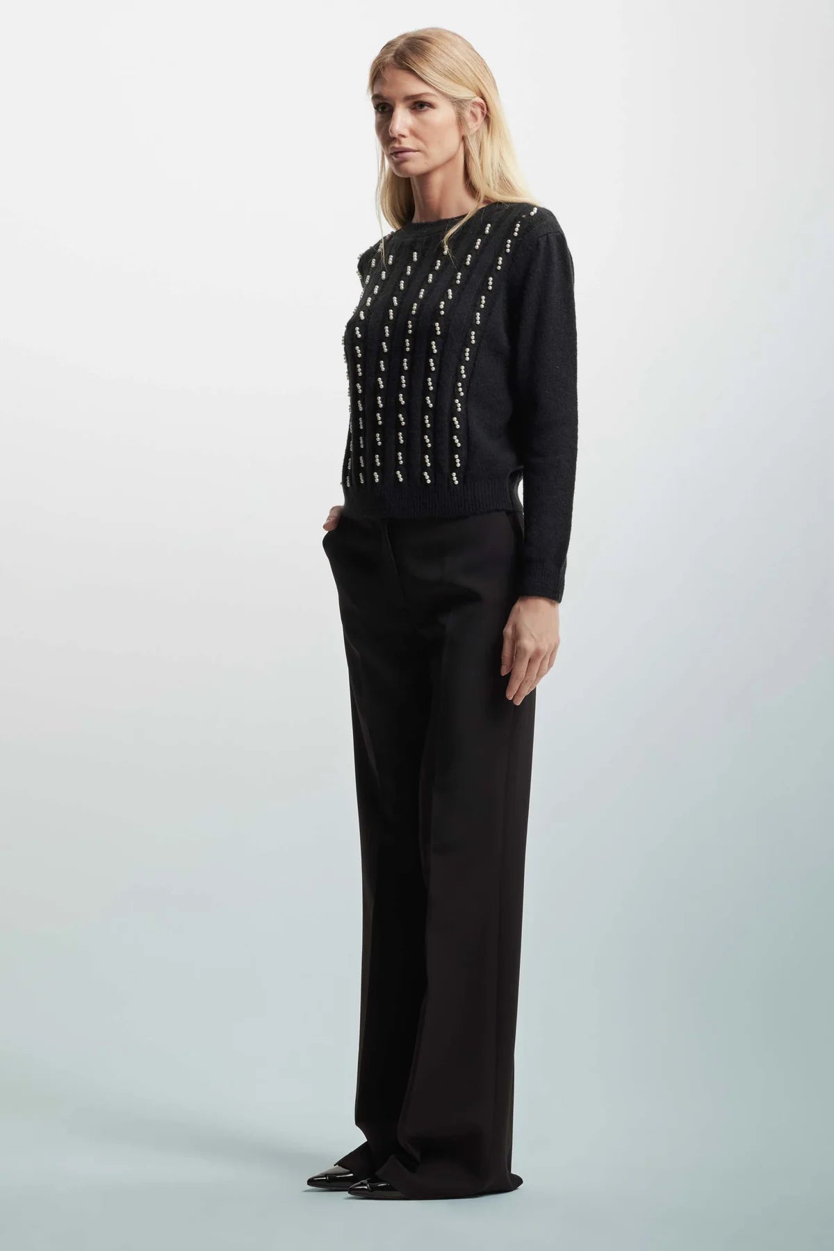 Maglia da donna in misto lana decorata con applicazioni di perline in colore a contrasto. Ideale per un look di tendenza.