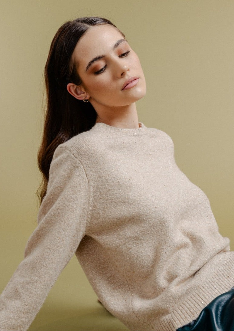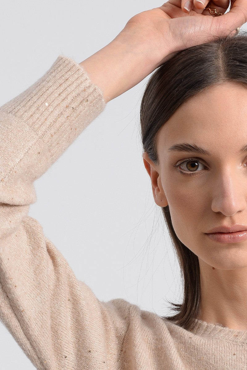 Maglia girocollo in maglia fine, fili cangianti per un tocco casual chic, polsini a coste. Lunghezza: 57cm