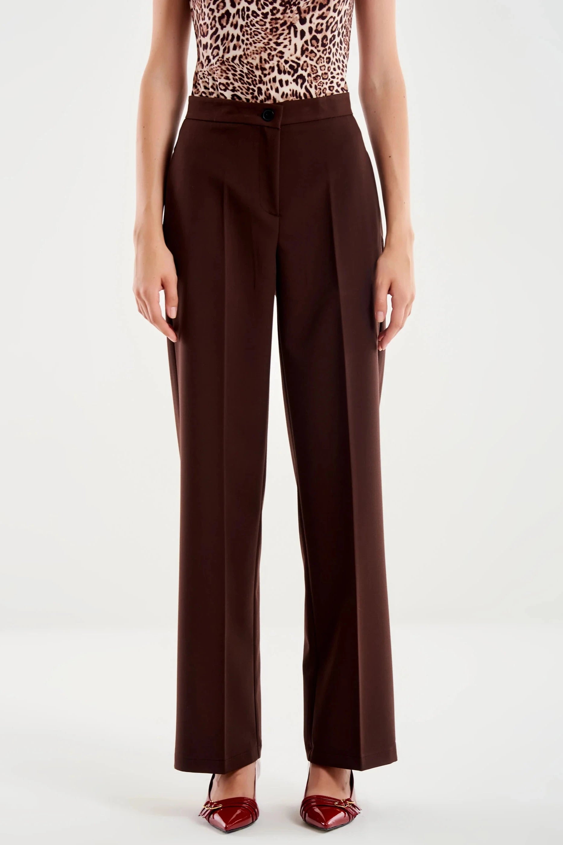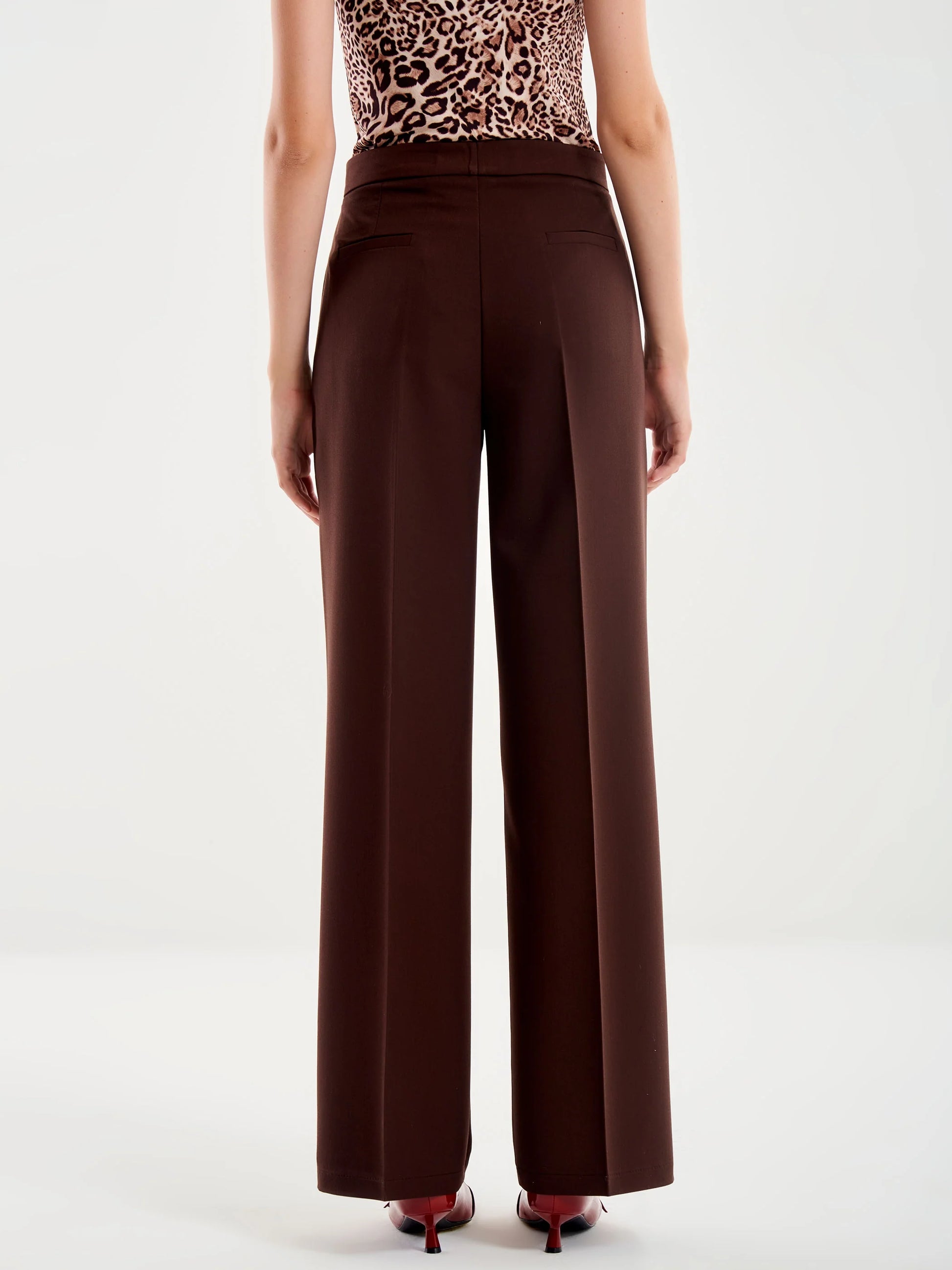 Pantalone ampio a vita alta. Tasche laterali e finta tasca a filetto sulla parte posteriore. Gamba larga. Chiusura frontale con zip e bottone.