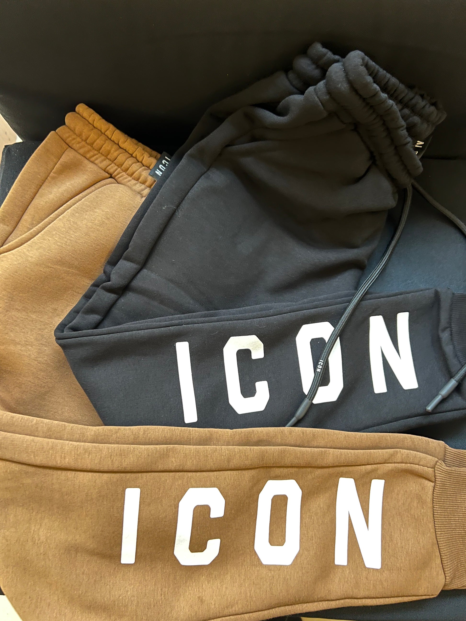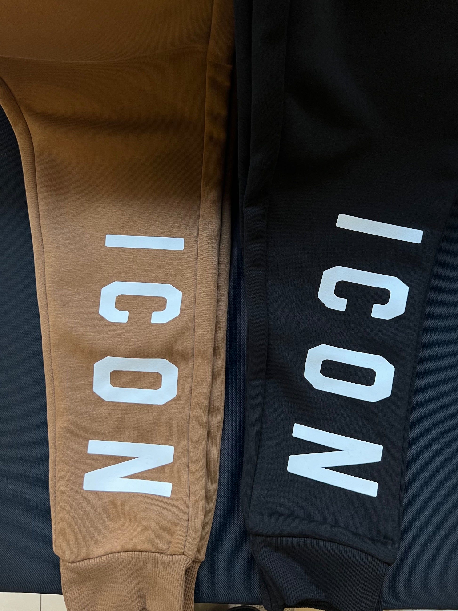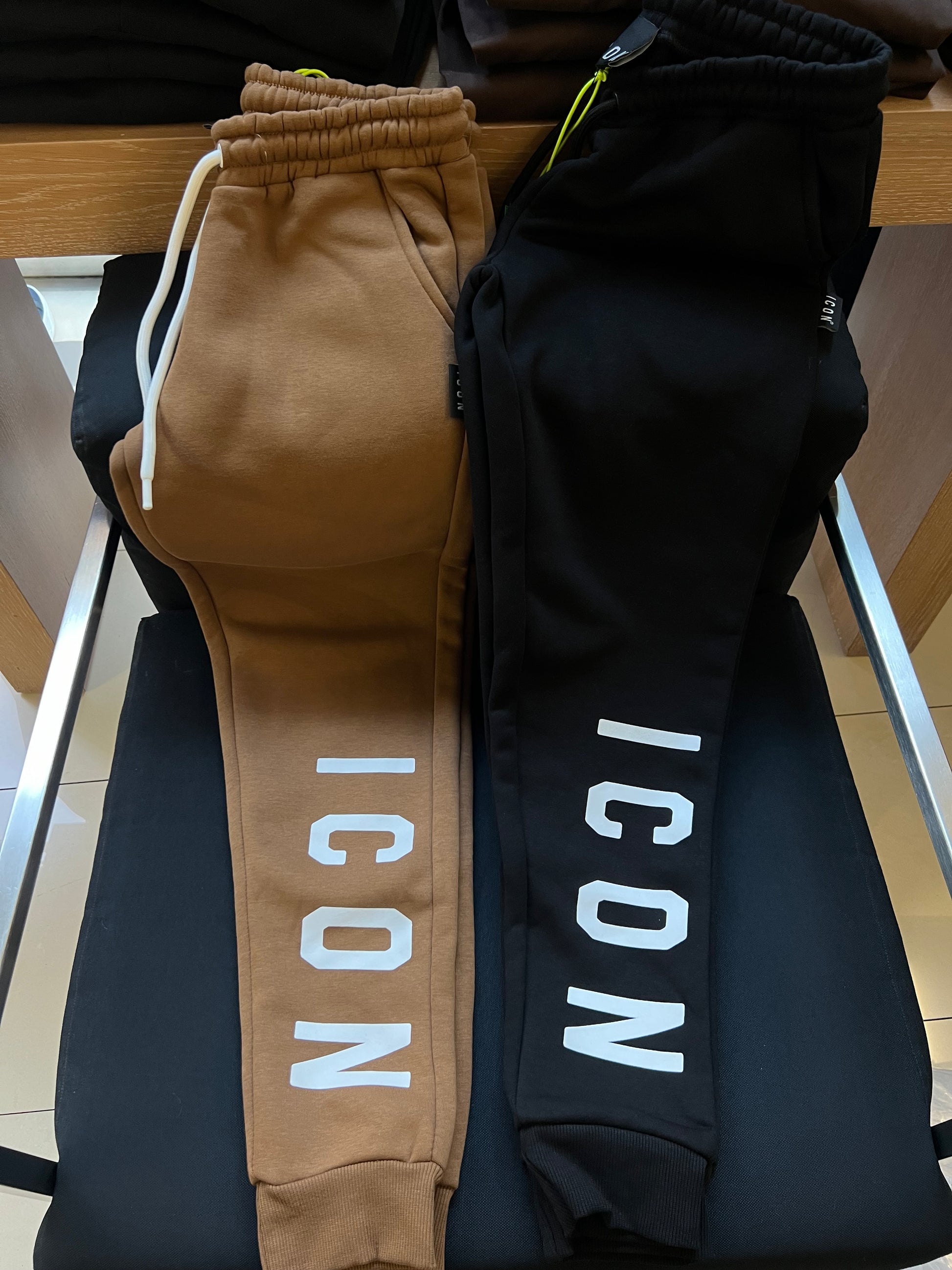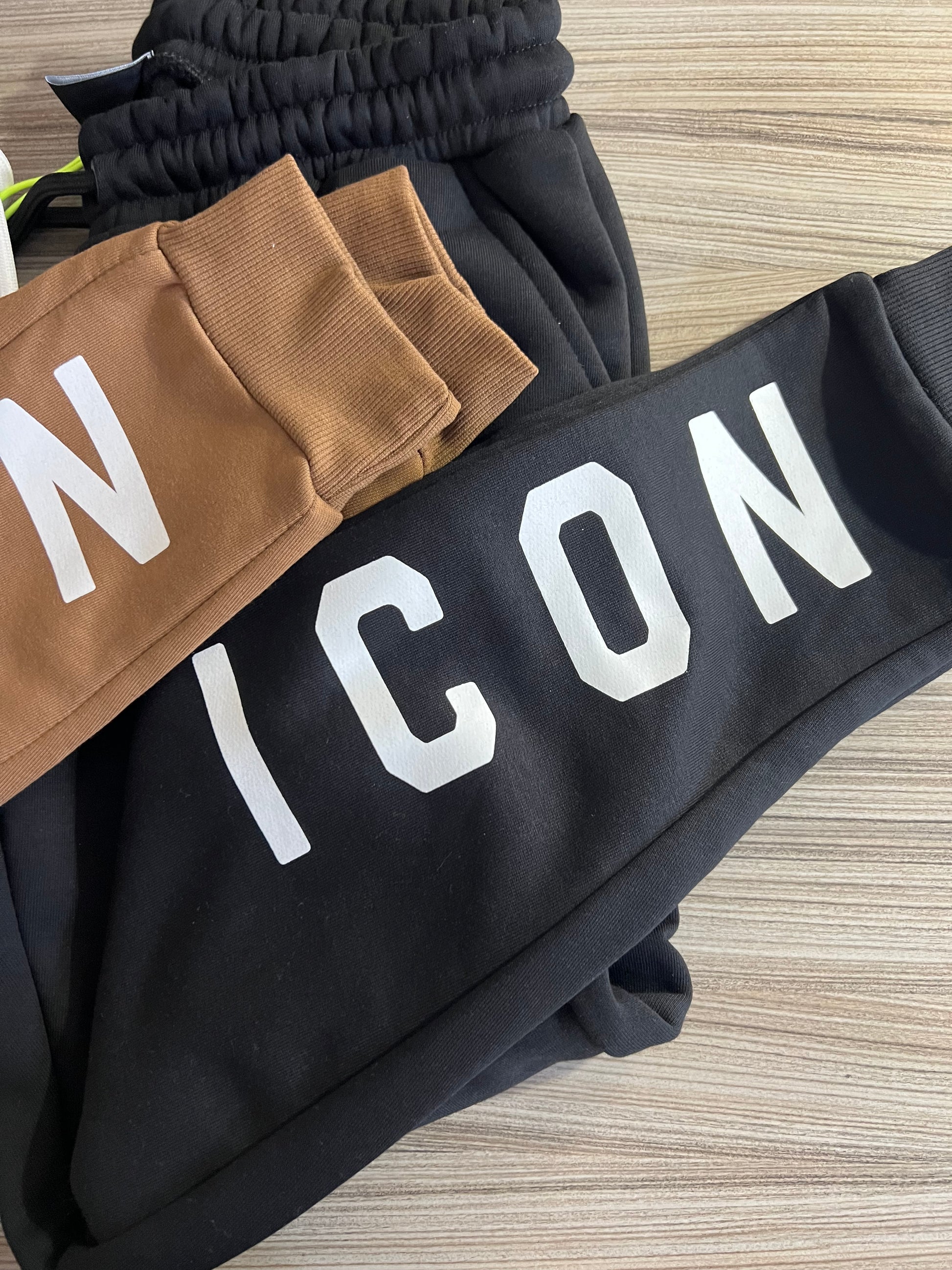 Pantalone in felpa dallo stile casual e versatile, disponibile in due varianti di colore: nero e marrone. Realizzato in tessuto morbido e confortevole, ideale per il tempo libero e le attività quotidiane. La vestibilità è regolare, con vita elasticizzata e cordoncino regolabile per un comfort personalizzato. Il dettaglio distintivo è la stampa “ICON” in caratteri grandi e bianchi sul lato, che conferisce un tocco moderno e di tendenza. Le tasche laterali completano il design, rendendolo pratico e funzionale. Perfetto per creare look sportivi o casual.
