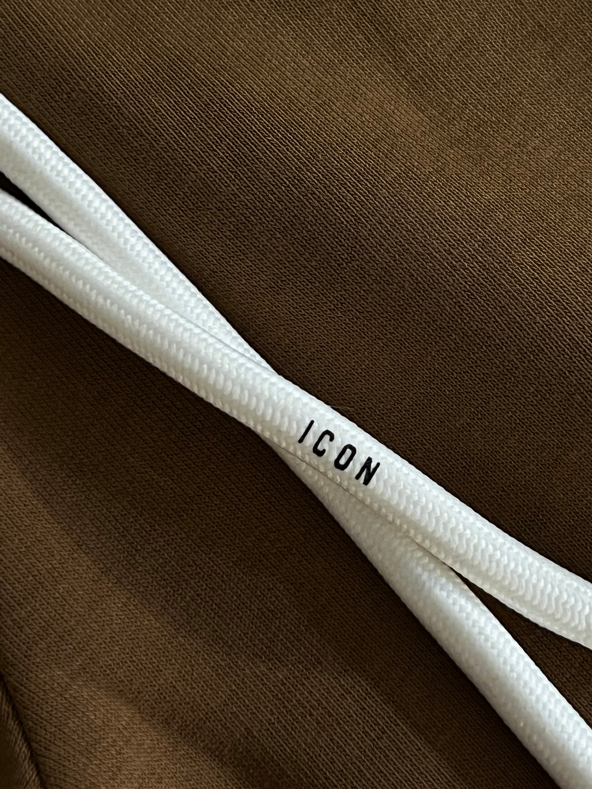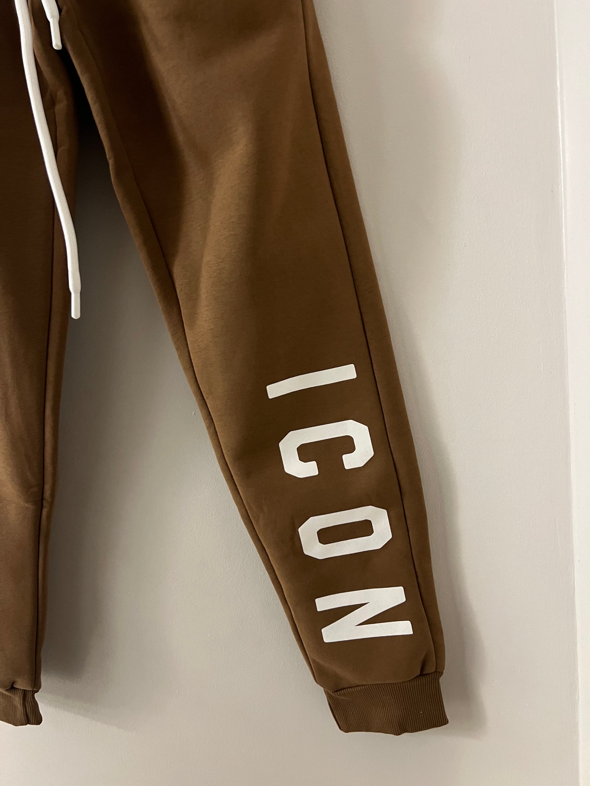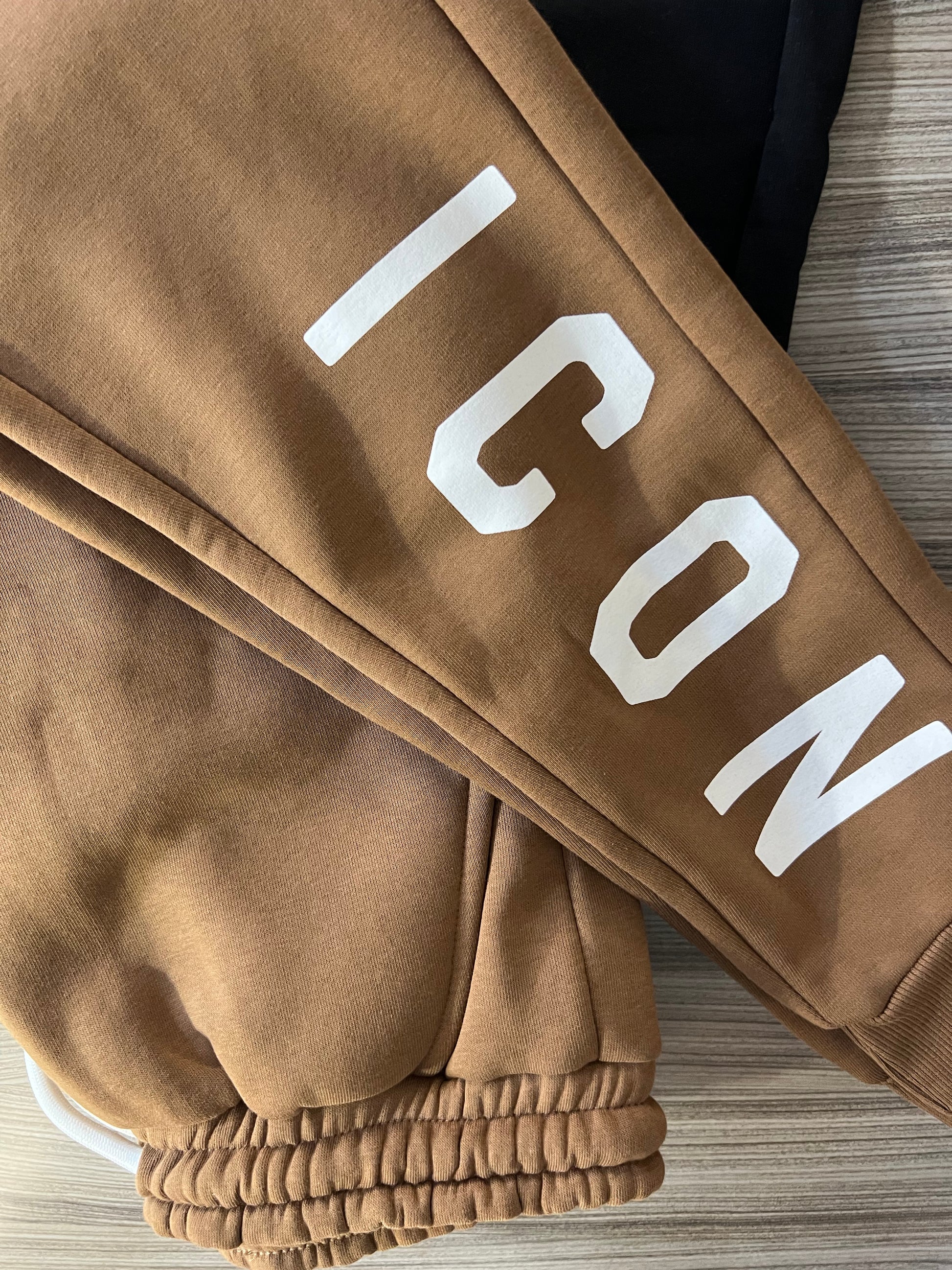Pantalone in felpa dallo stile casual e versatile, disponibile in due varianti di colore: nero e marrone. Realizzato in tessuto morbido e confortevole, ideale per il tempo libero e le attività quotidiane. La vestibilità è regolare, con vita elasticizzata e cordoncino regolabile per un comfort personalizzato. Il dettaglio distintivo è la stampa “ICON” in caratteri grandi e bianchi sul lato, che conferisce un tocco moderno e di tendenza. Le tasche laterali completano il design, rendendolo pratico e funzionale. Perfetto per creare look sportivi o casual.