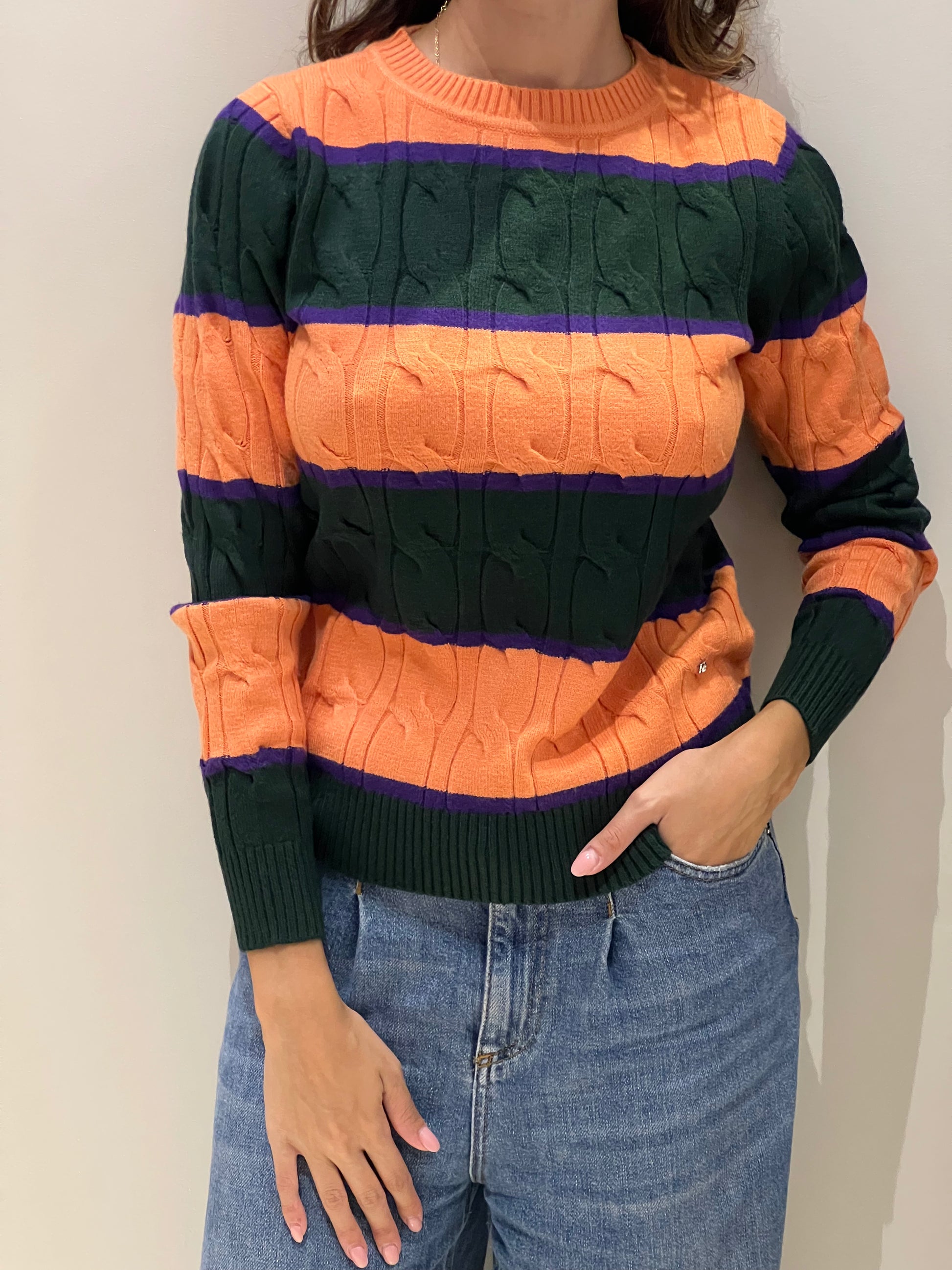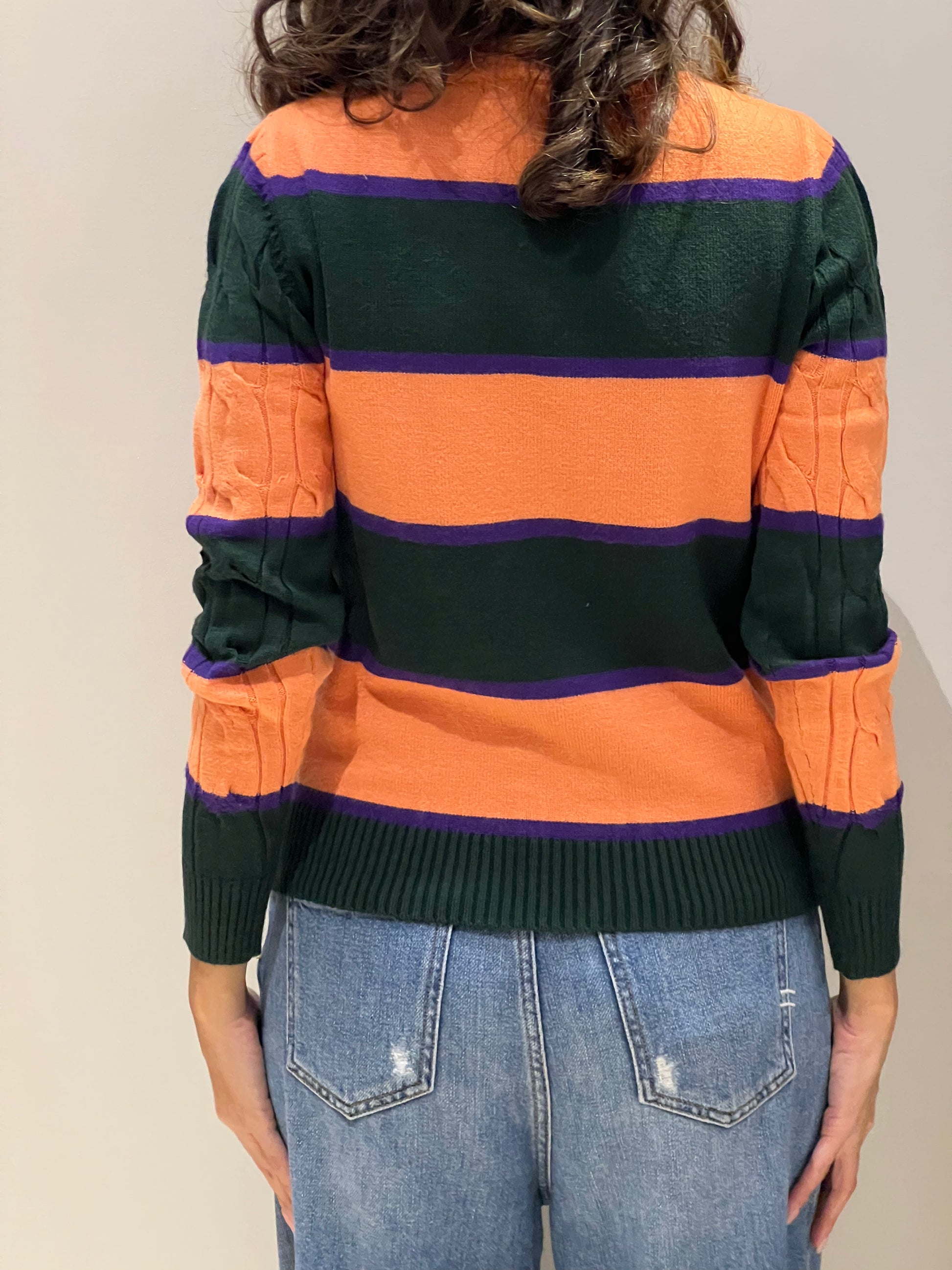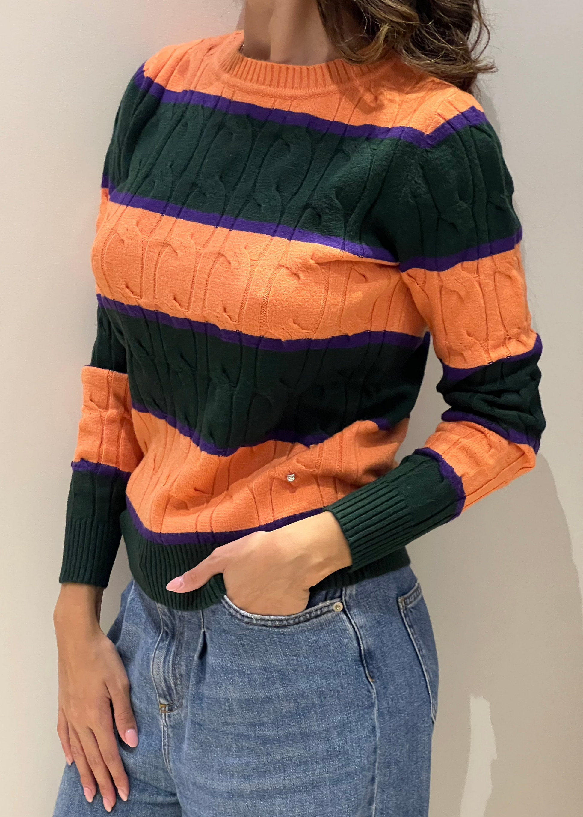 La maglia è caratterizzata da un design a tre colori, con righe orizzontali in arancione, verde scuro e una sottile striscia viola. Il tessuto presenta una lavorazione a trecce, che aggiunge texture e profondità al capo. Il collo è tondo, con polsini e bordo inferiore a costine, mentre il taglio risulta morbido e casual, perfetto da abbinare a jeans per un look quotidiano comodo ma stiloso.